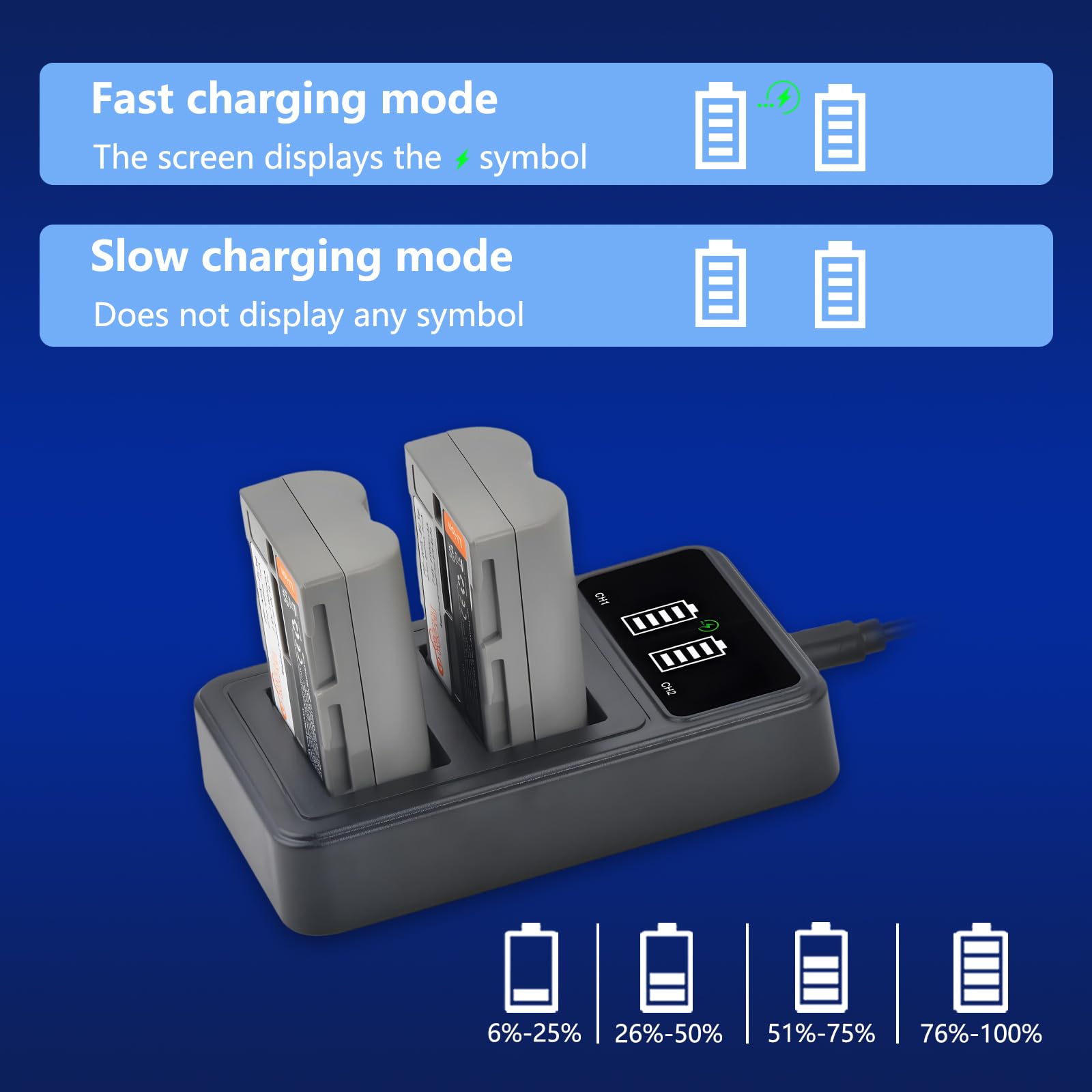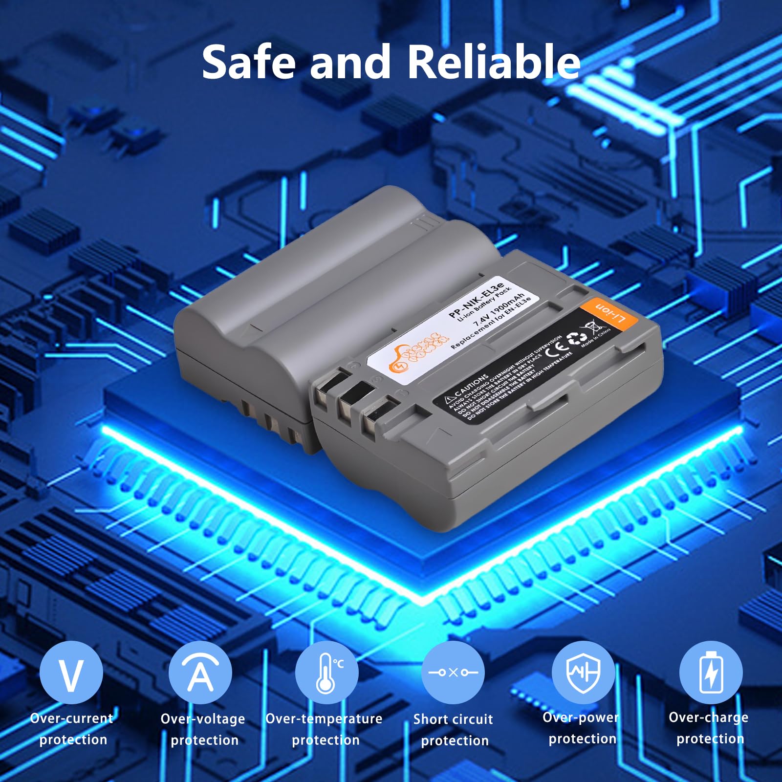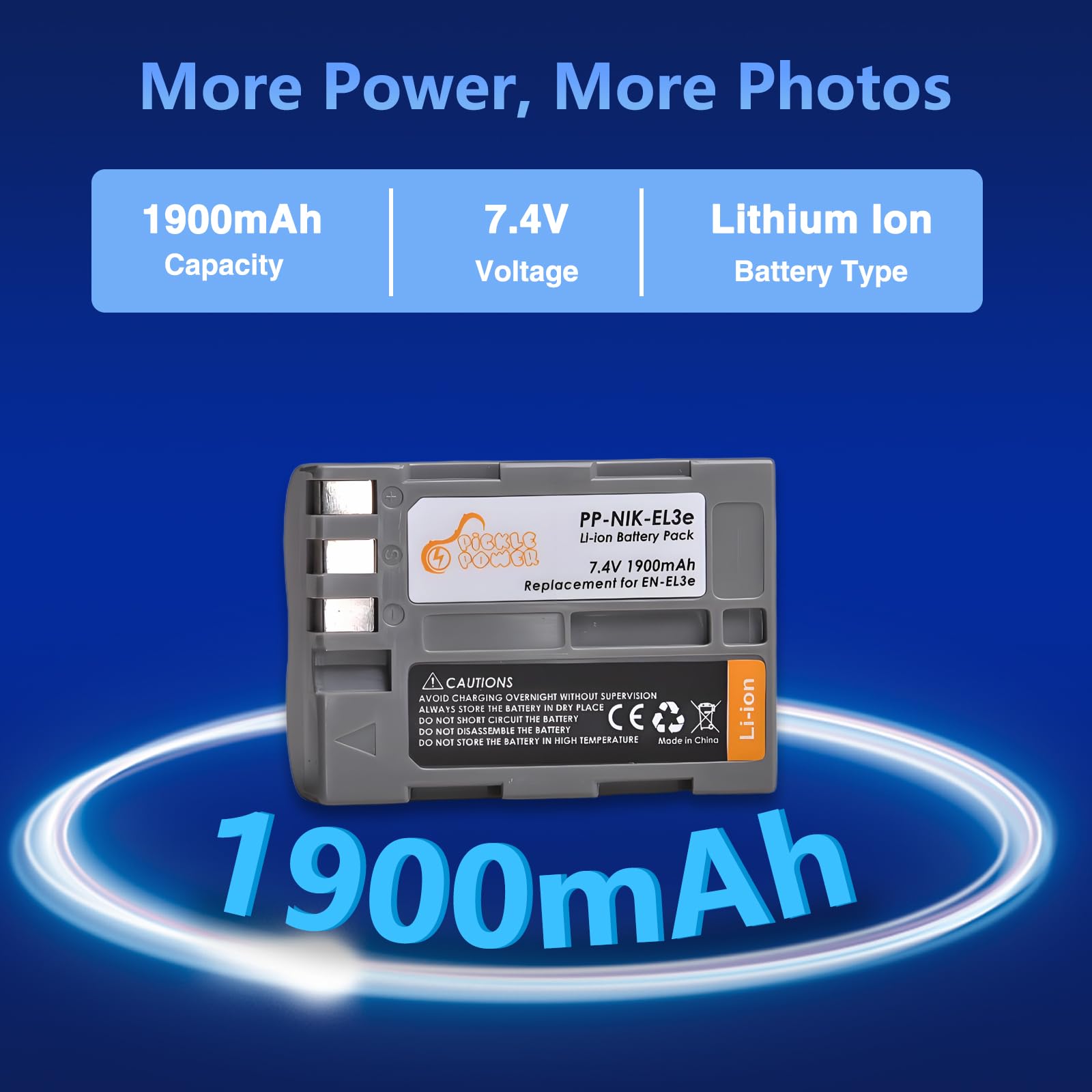 Long Lasting Battery: 2 pack 1900mAh high capacity EN-EL3e batteries. Use high quality cells for longer battery life with no memory effect.Perfect for photographers needing reliable power during weddings, travel, or outdoor shoots—no more frequent battery swaps