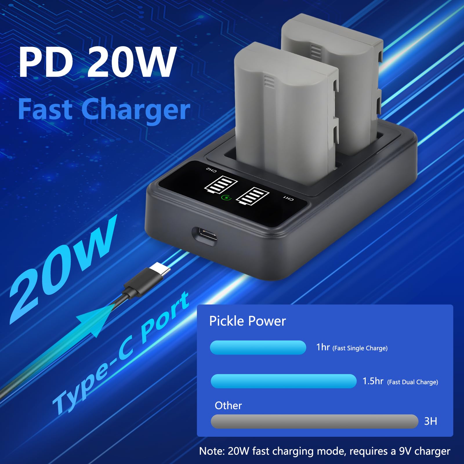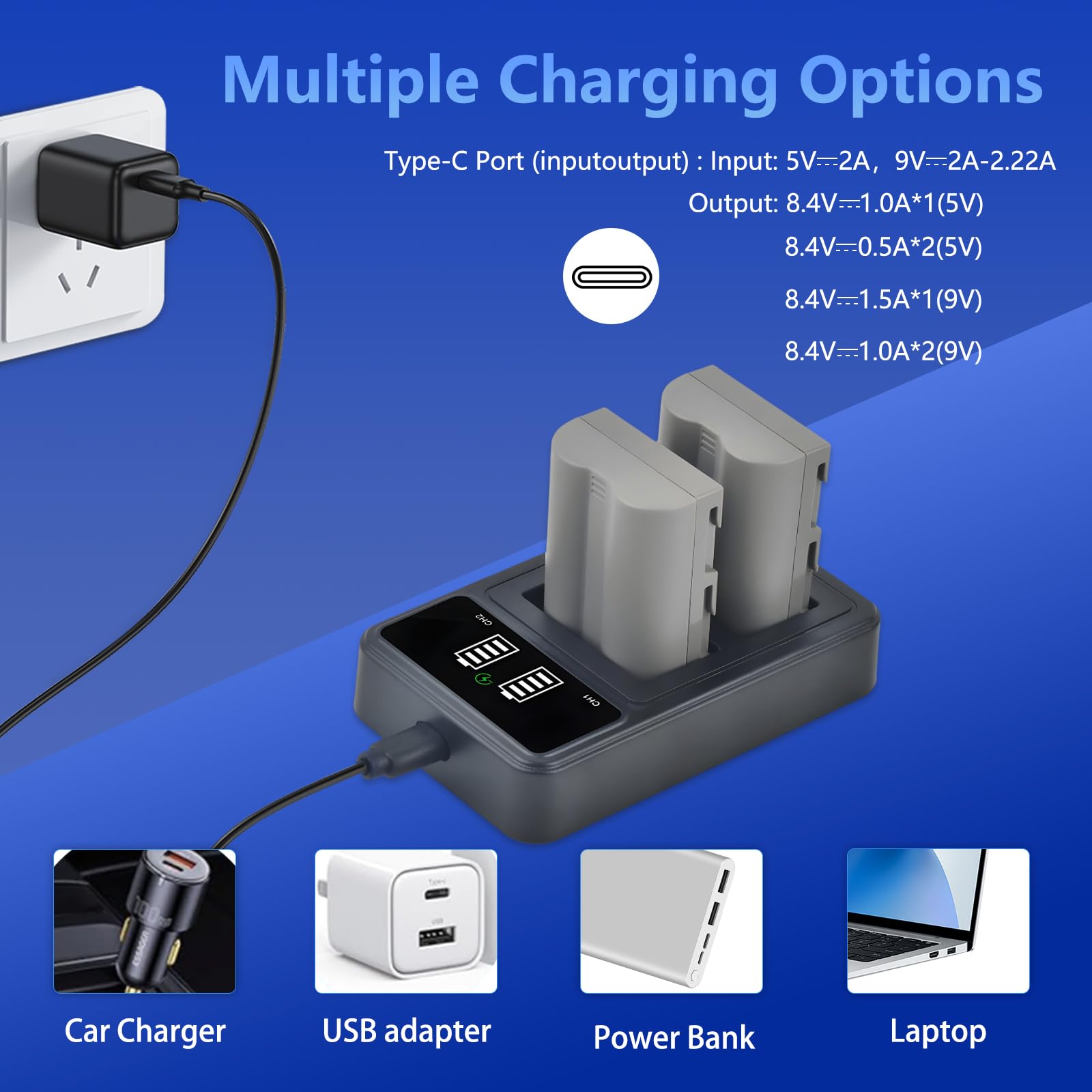 PD 20W Fast Charging: Type-C input: 9V/2.2A, Output: 8.4V/1.5A*1, 8.4V/1A*2. It takes about 1.5 hours to fully charge 2 batteries, saving 50% time compared to traditional chargers.You could Use a standard 5V 2A adapter for regular charging or opt for a 20W fast charging adapter (9V 2.2A) for quicker power-ups. can be charged by power bank,wall charger ,car charger, laptops, etc
