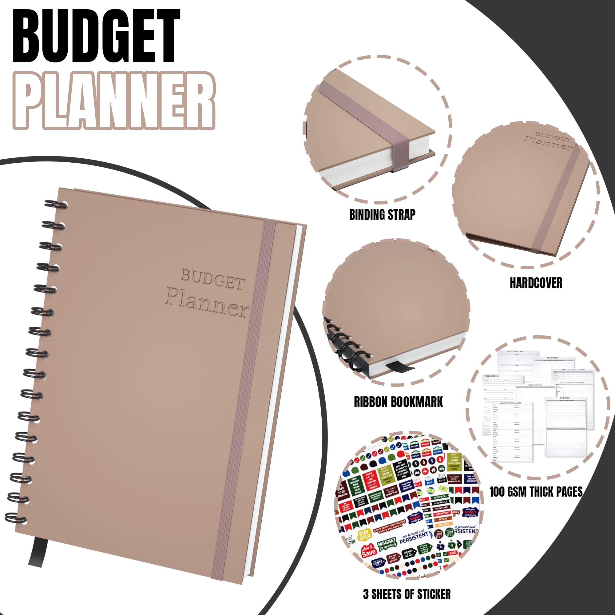 A5 Hardcover Budget Journal With Premium Features – Includes elastic band, ribbon bookmark, 3 sticker sheets, and durable 100gsm paper. This weekly and monthly budget planner is ideal for planning at home, work, or on the go.