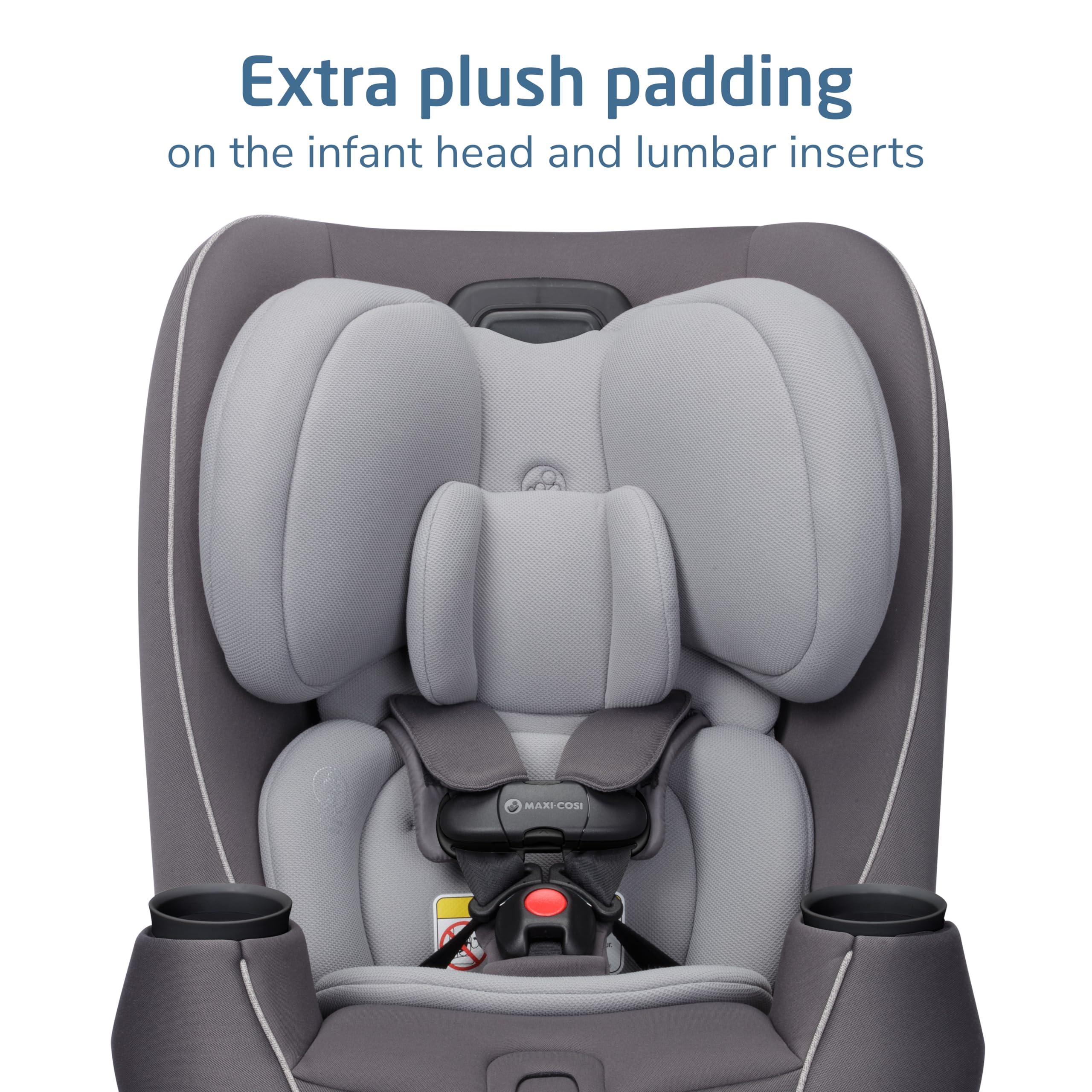 COZY AND SECURITY FROM THE FIRST RIDE Extra plush padding on the infant head and lumbar inserts ensures a comfy and secure ride. Inserts can be easily removed without re-threading the harness of this grows with me car seat.