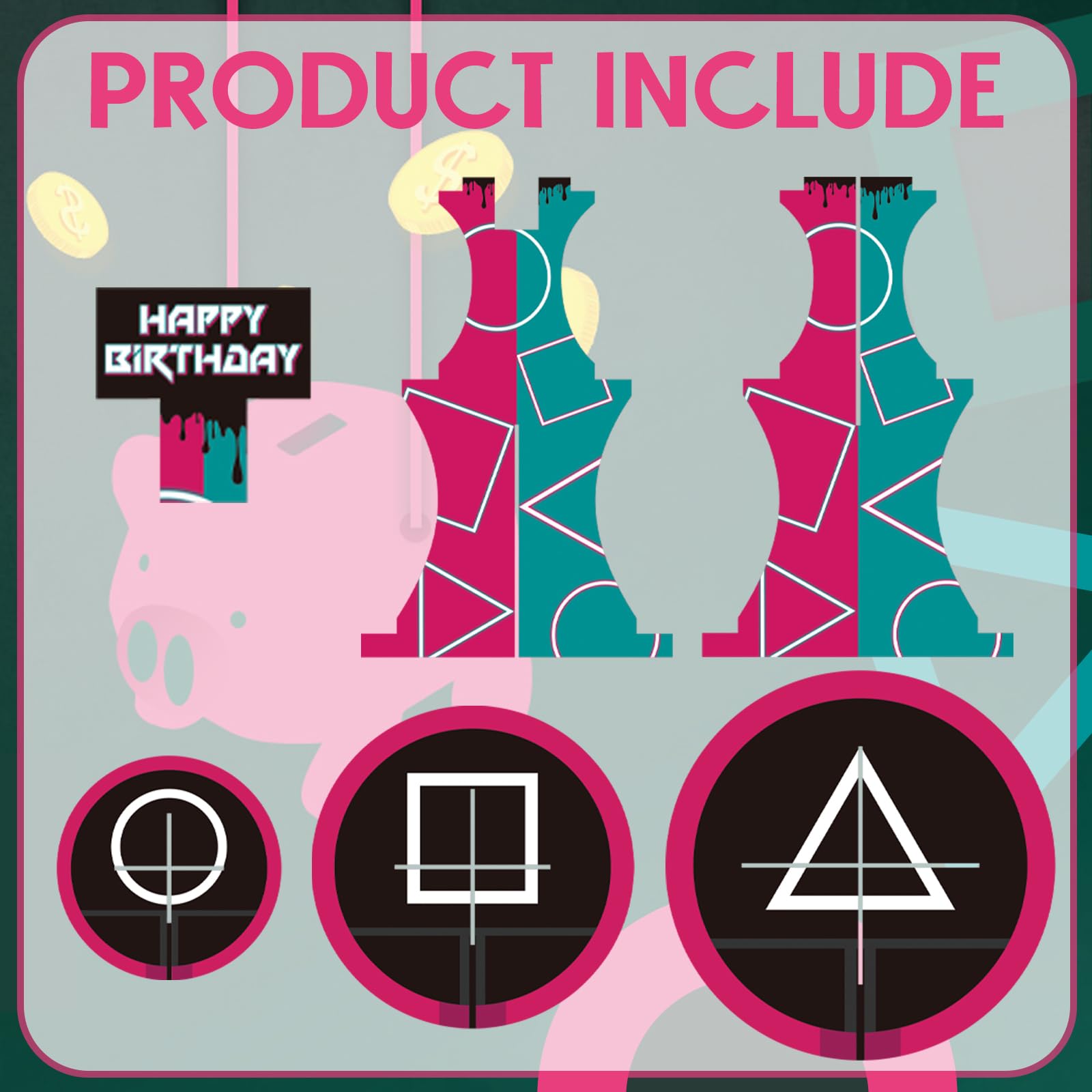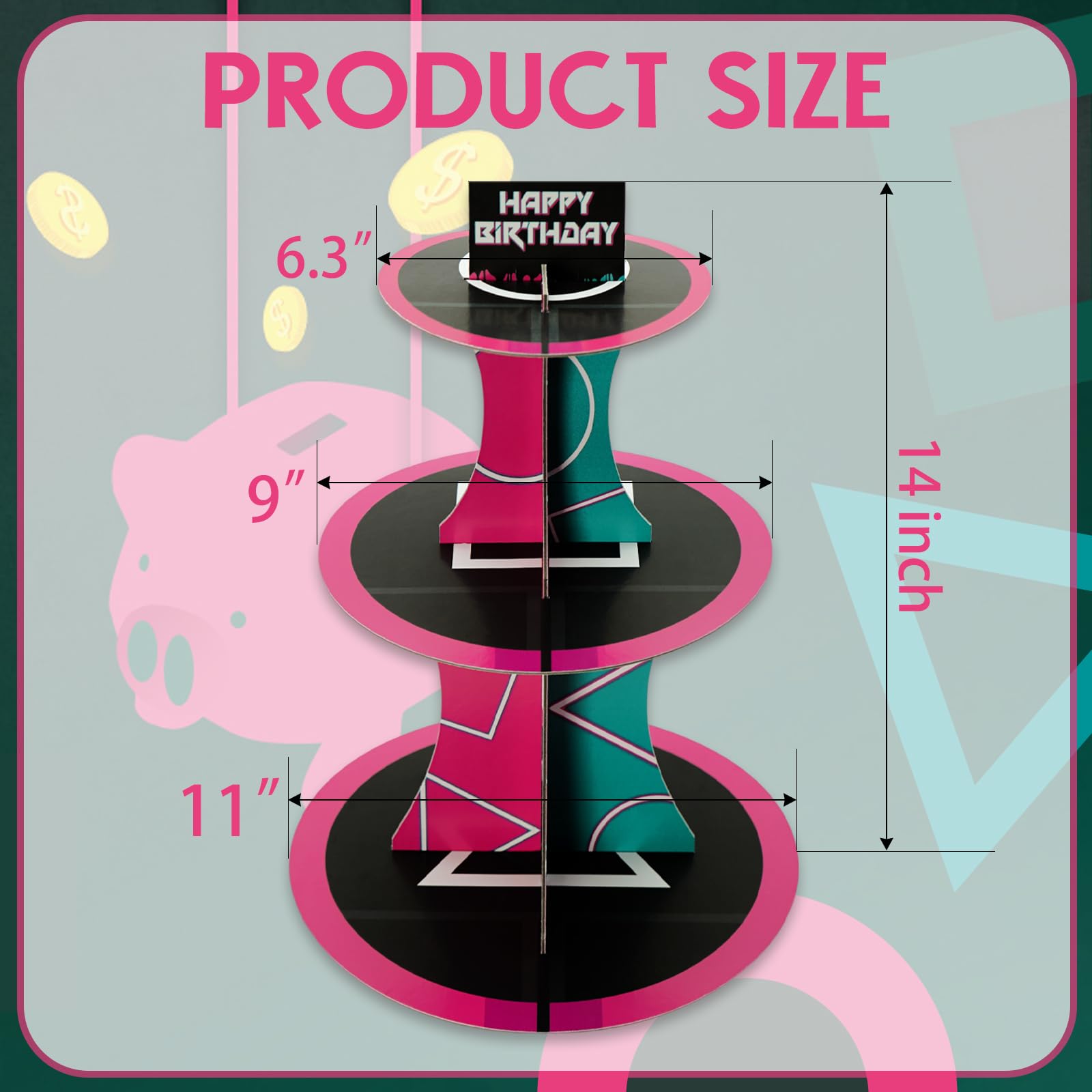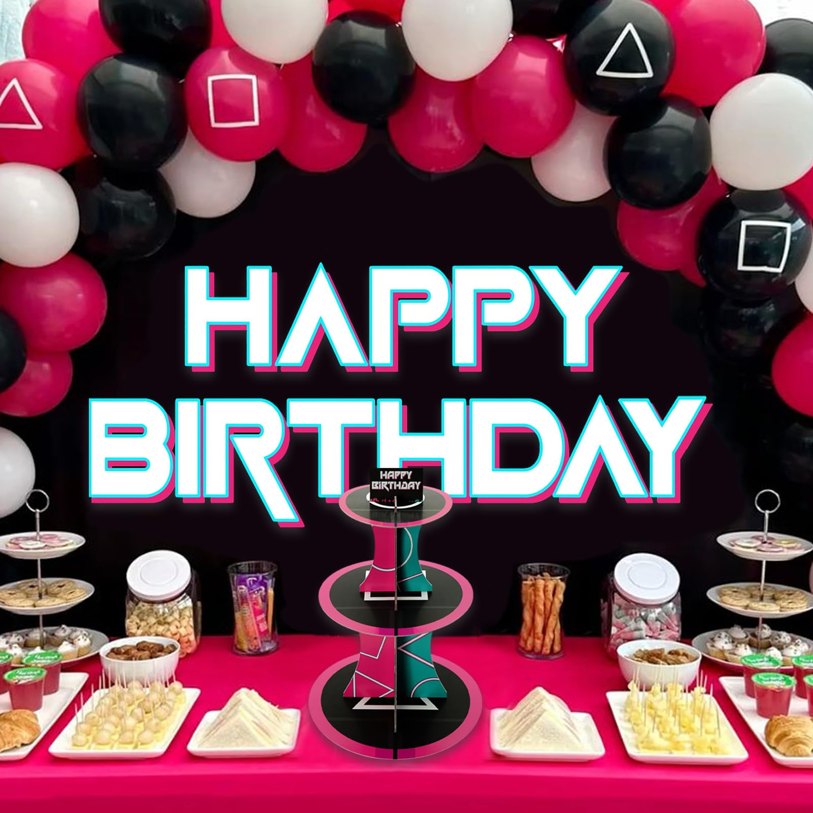 Game Theme Design – Features bold pink, black, blue and geometric patterns to create an exciting challenge game vibe for your party dessert table