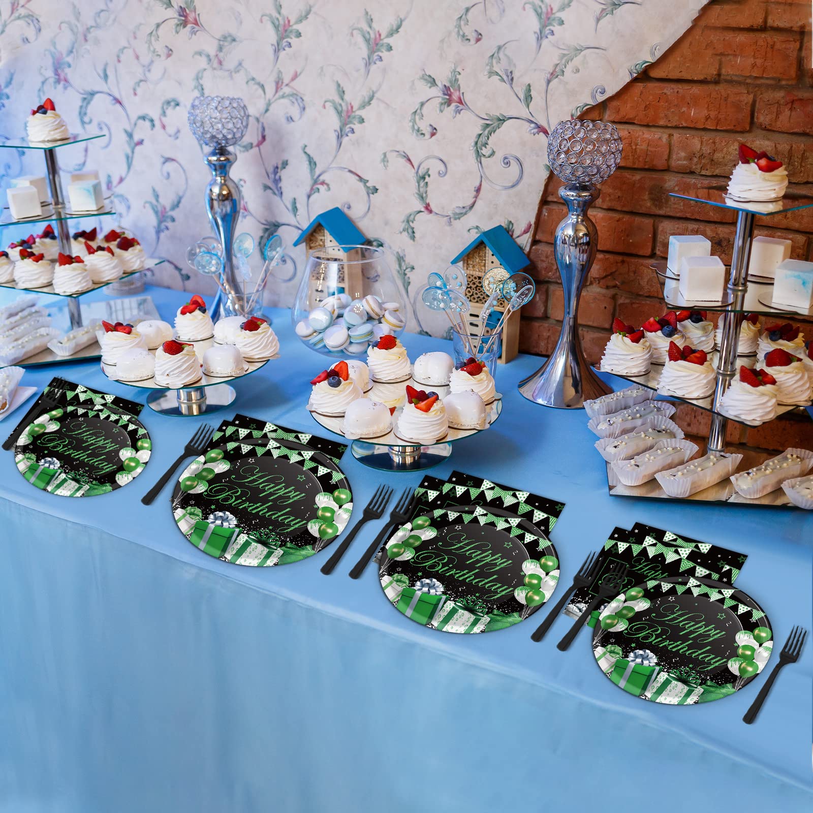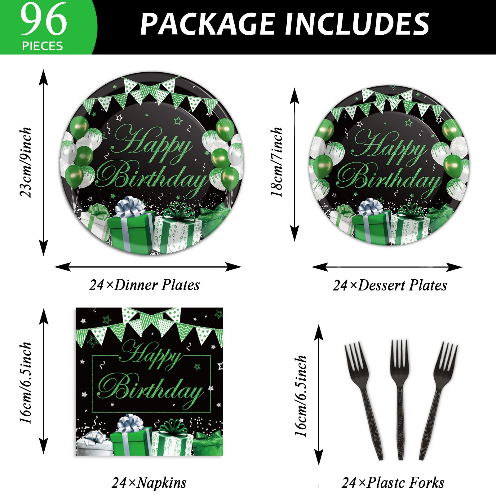 【Birthday Party Supplies】You will receive 24 pieces green and black happy birthday party paper dinner plates of 9’’, 24 pieces plates of 7’’, 24 pieces green birthday napkins of 6.5’’ and 24 plastic green forks for each set that can serve 24 guests.