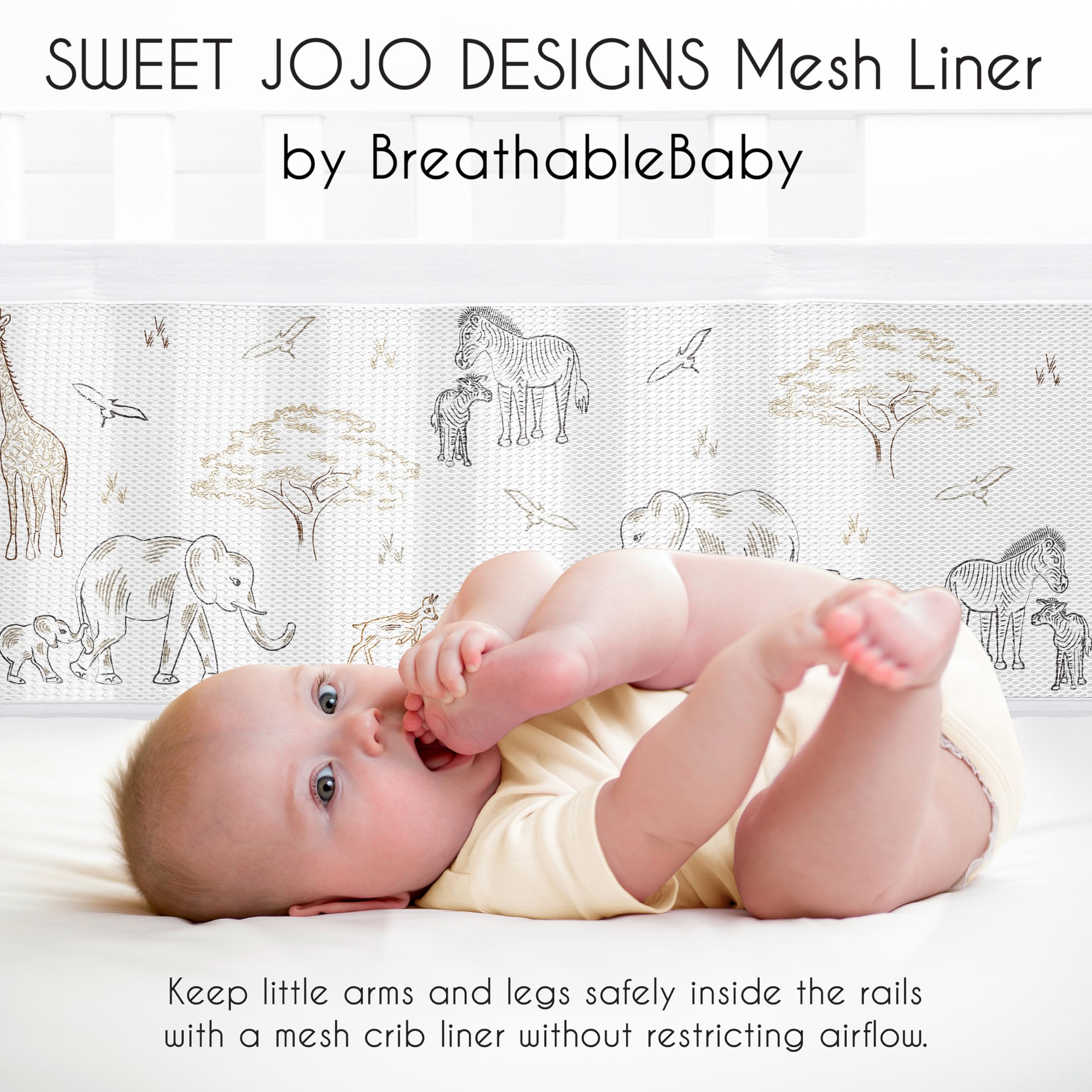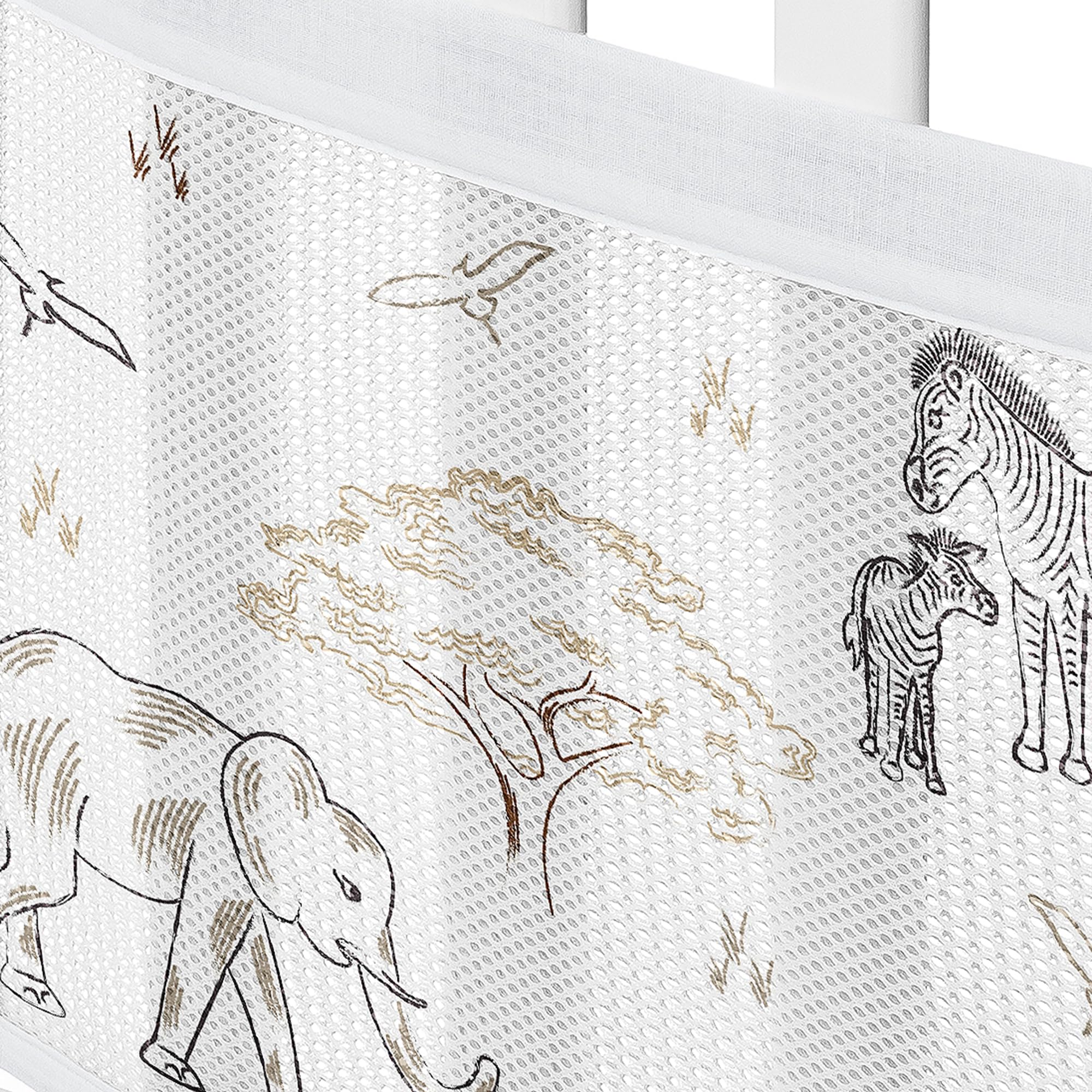 This mesh crib liner features a jungle safari adventure wildlife animals that include elephants, giraffes and zebras with complimentary color palette from the matching Sweet Jojo Designs Serengeti Animals bedding collection of tan, beige, brown, taupe, black and white.