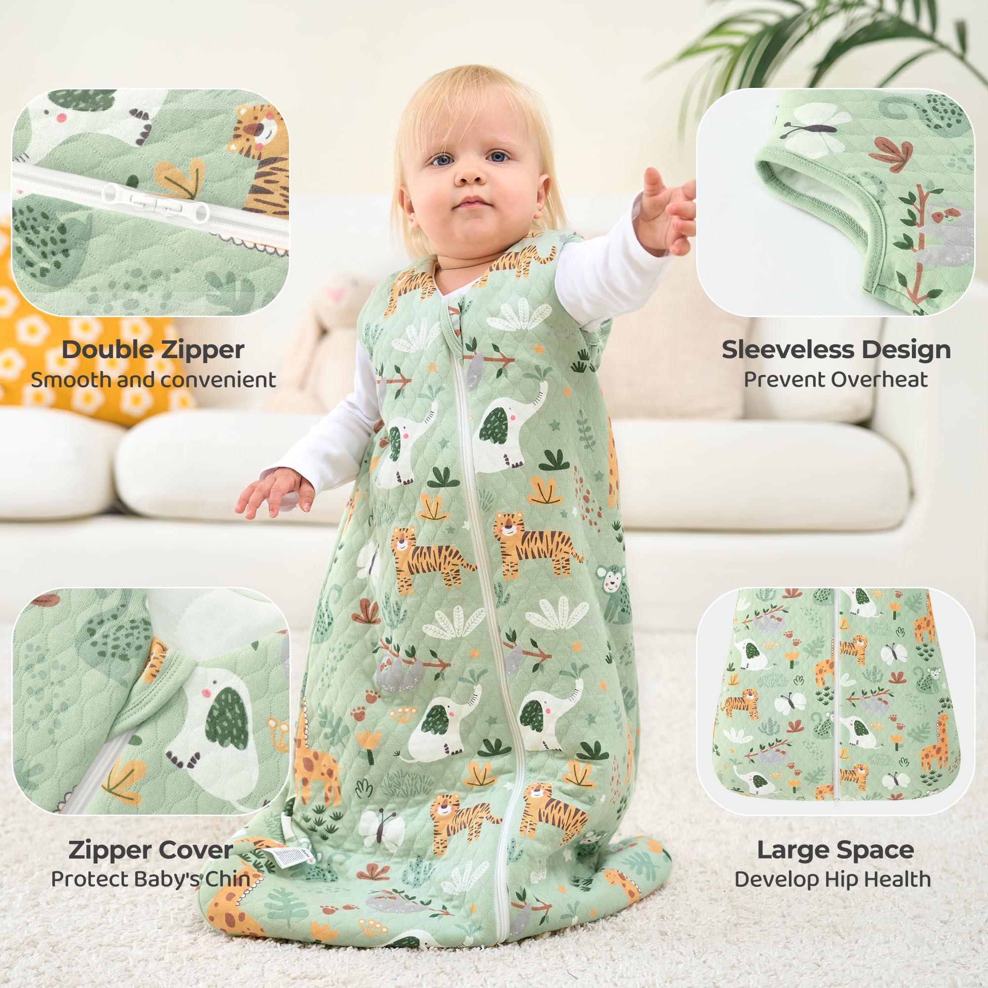 【Sleeveless Sleepsack】Considering for the thickness and suitable seasons for this baby wearable blanket, we specially make our sleep sack to sleeveless style, as its contributes to prevent your baby from overheating. And your baby could always stay in the sleep sack. Do not need to worry for the problem of kicking off the covers.