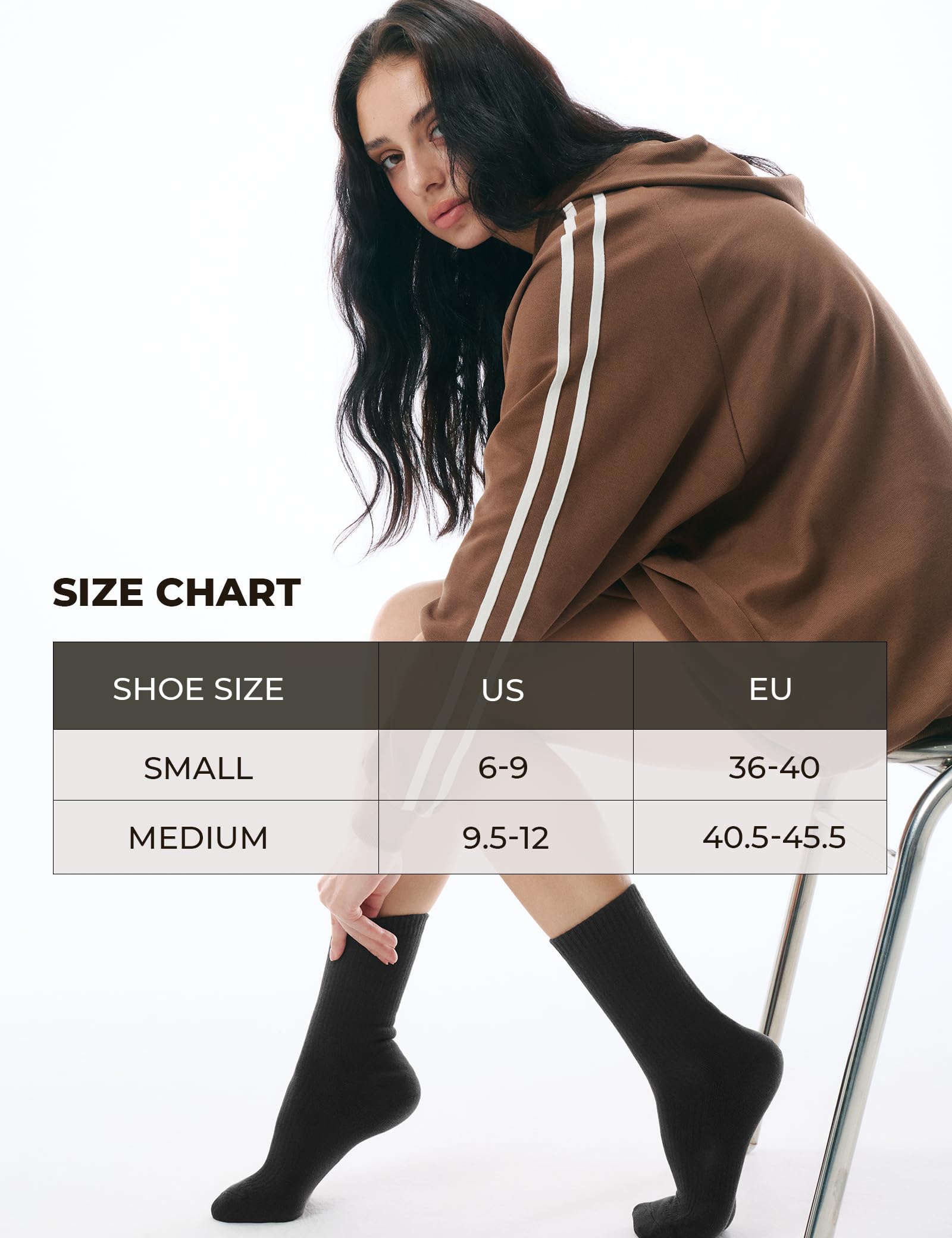 Size Options: Our women's crew socks come in two sizes: Small and Medium. The Small size fits US women's shoe sizes 5-8.5, and the Medium size fits sizes 9-11.