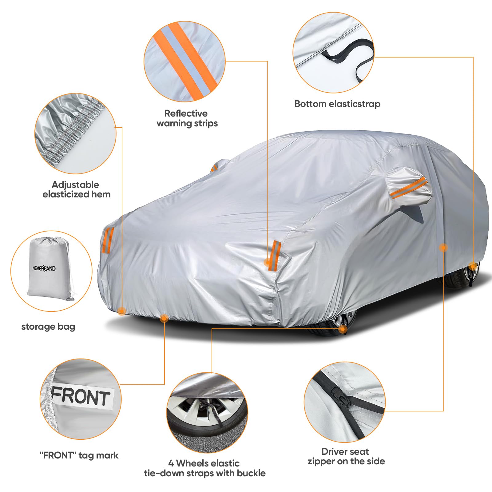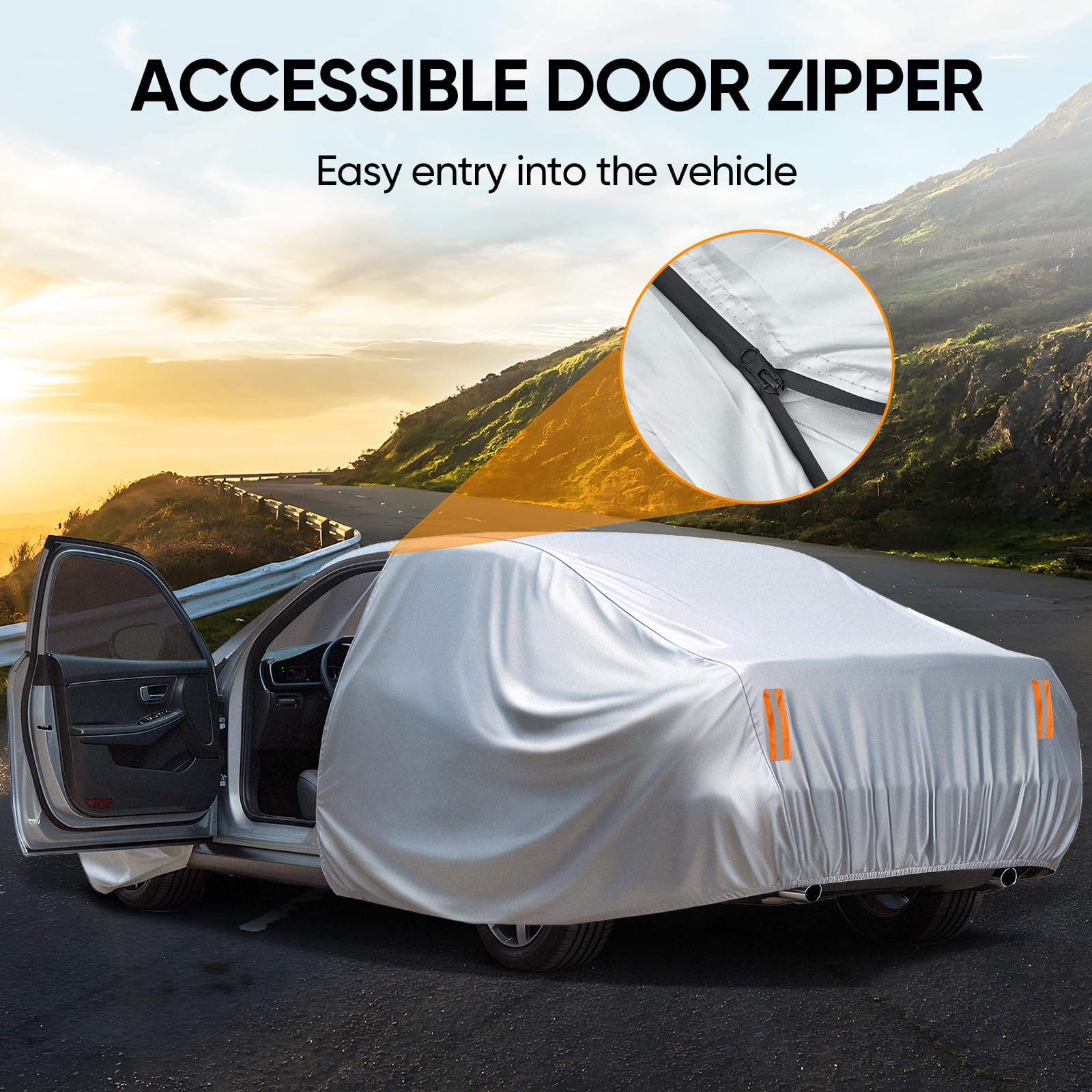 Driver Door Zipper ,Elastic Hem Type & Wheel Fixing Strap: 1)Driver Door Zipper for Easy Access. 2) All four tires can be fixed to Protect Your Auto Cover not Blown Away by Heavy Wind. 3) Reflective Stripes Make you car stay in safe