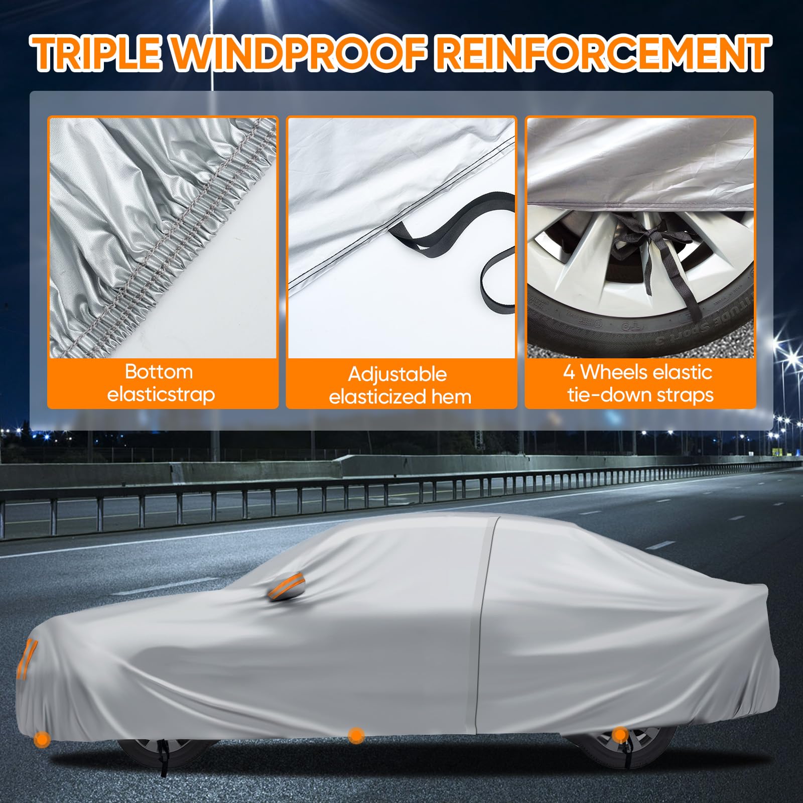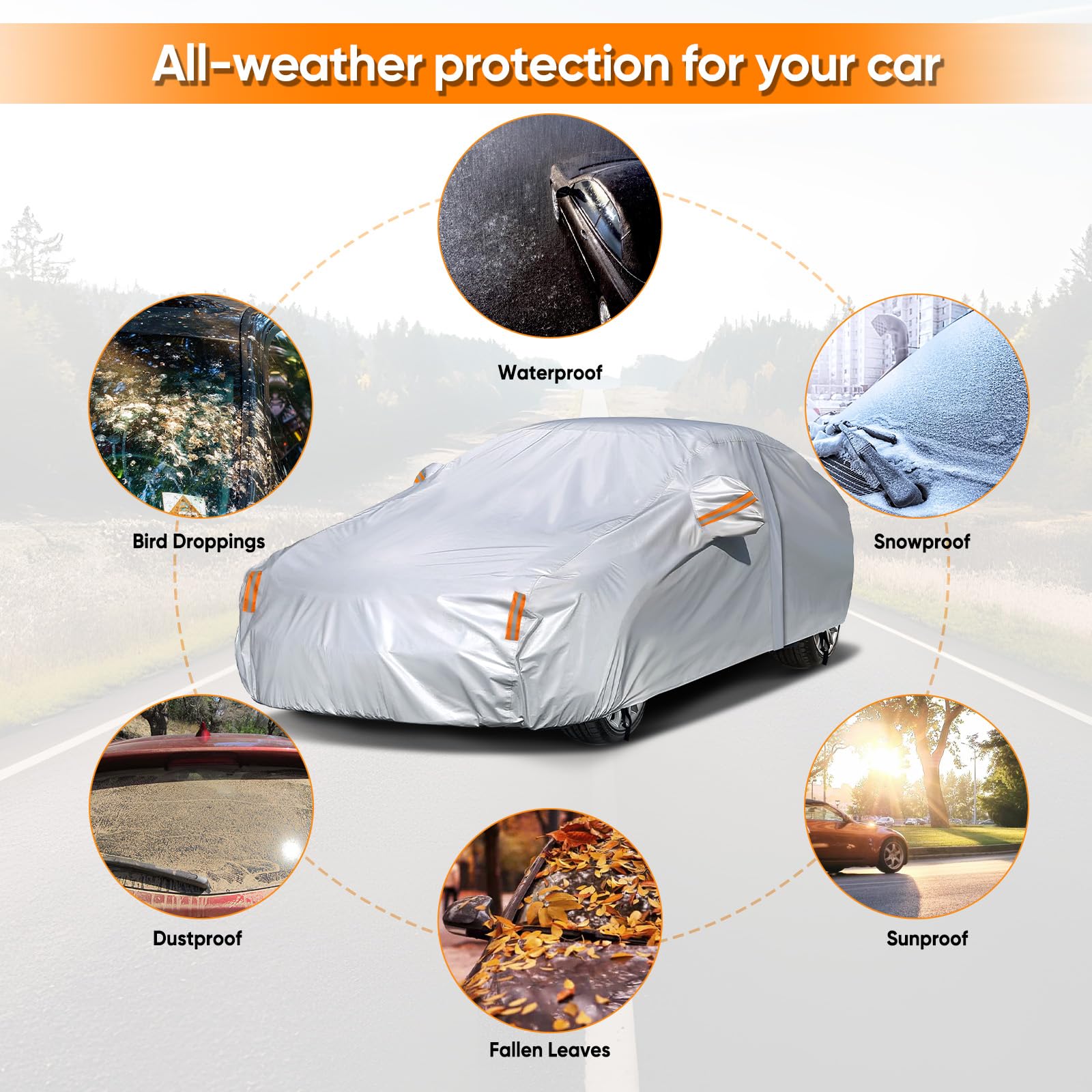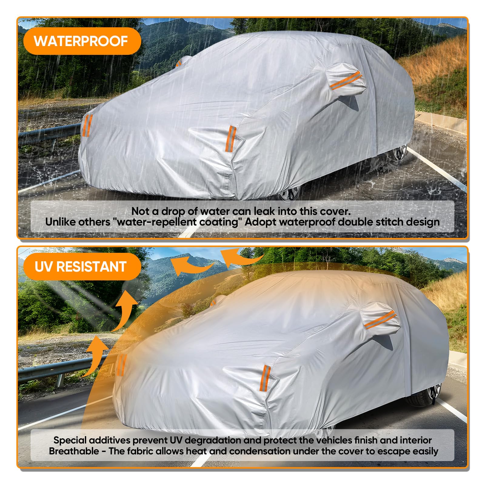 Waterproof & Weatherproof: Our Sedan car cover made from 190T polyester, which offers all-season protection. It safeguards your car from wind, rain, snow, dust, sand, and more. Featuring waterproof double stitching, it provides full protection even during heavy rain, unlike others with only water-repellent coating
