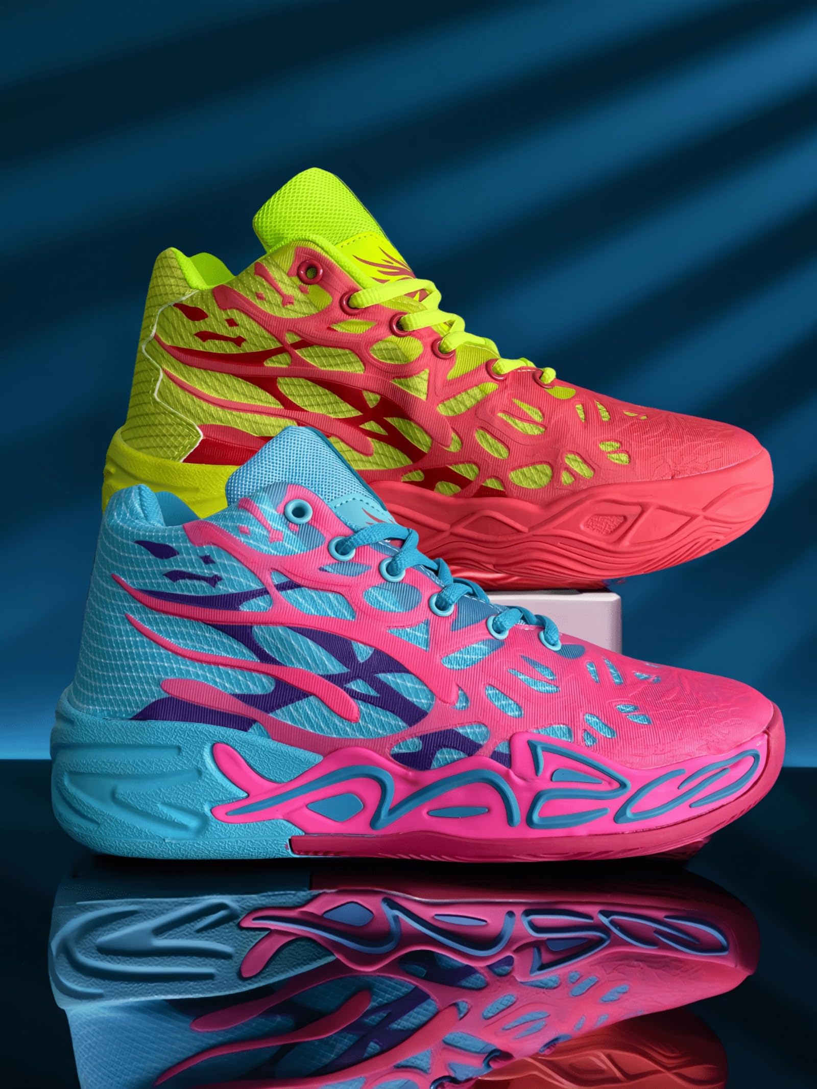 Innovative Flame Design: Stand out on the court with a distinctive flame pattern and mismatched green and blue color scheme, adding a bold statement to your athletic ensemble.