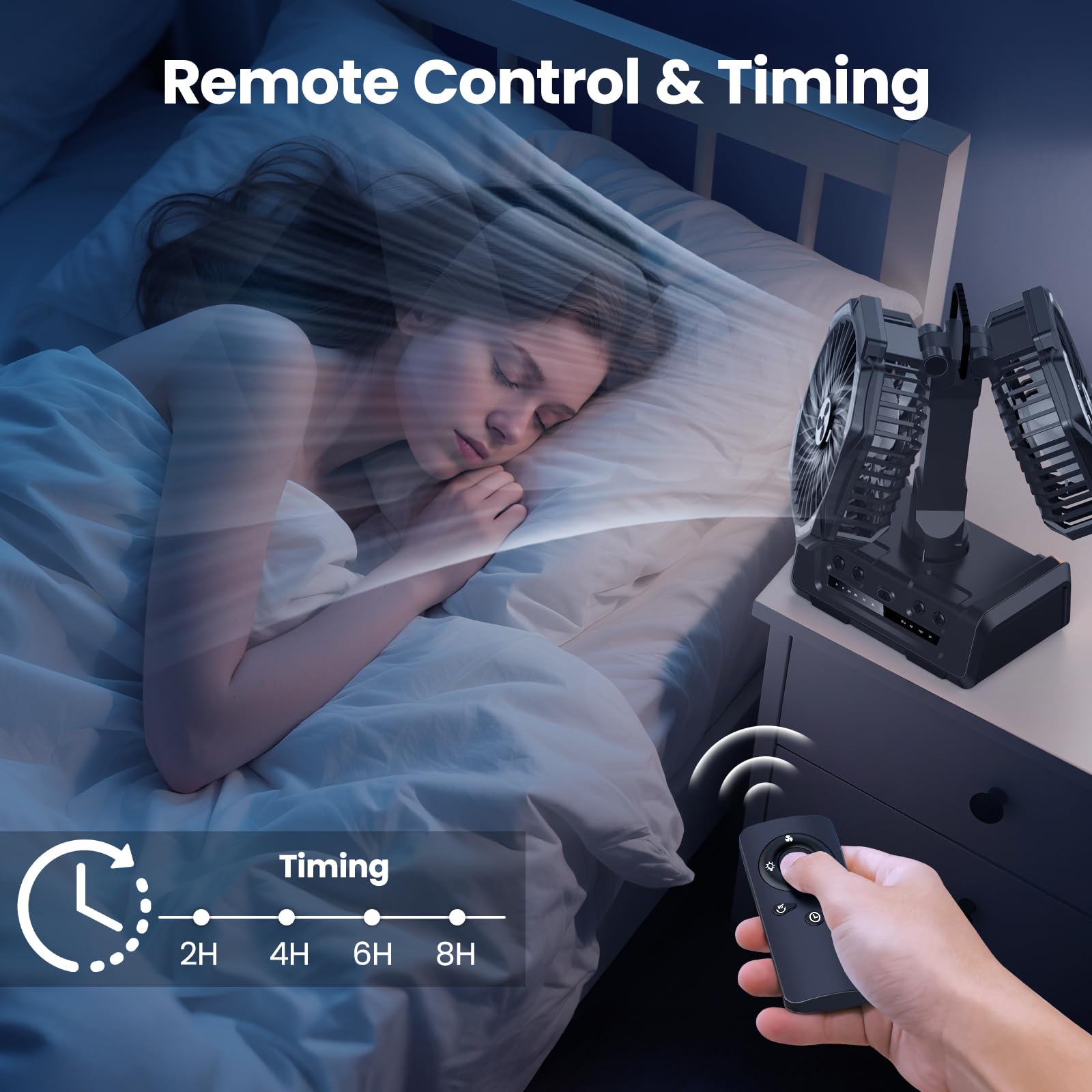 Multi-Function Remote Control Fan:This camping fan rechargeable comes with remote control. Functions on the battery fan including timer, oscillation, fan speed, and lighting can all be operated via the remote control. The timer function can be set to 2H, 4H, 6H, 8H. You can easily check the battery level, timer settings, and oscillation angles on the clear display panel.(Note: Please remove the insulation strip from the remote control before use.)