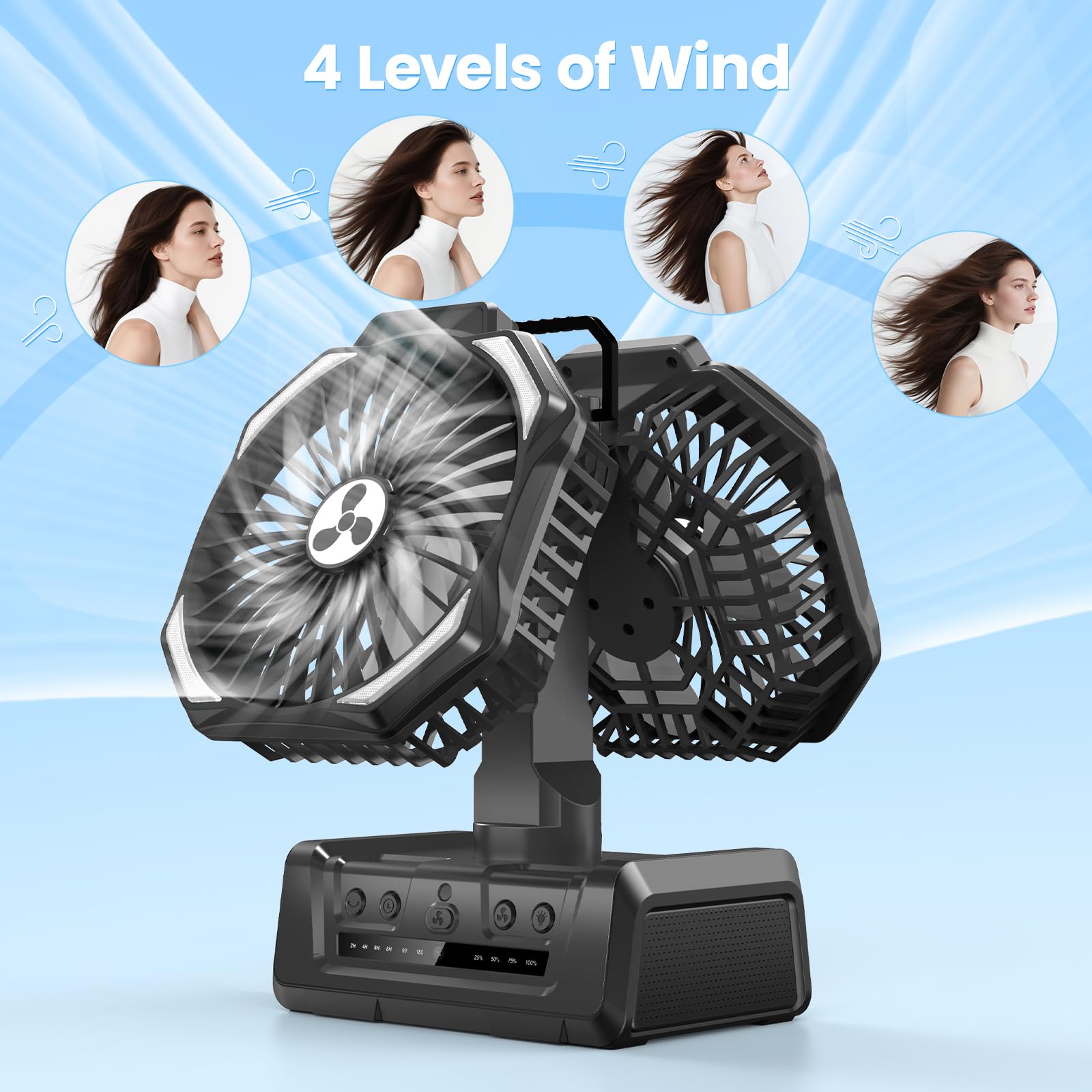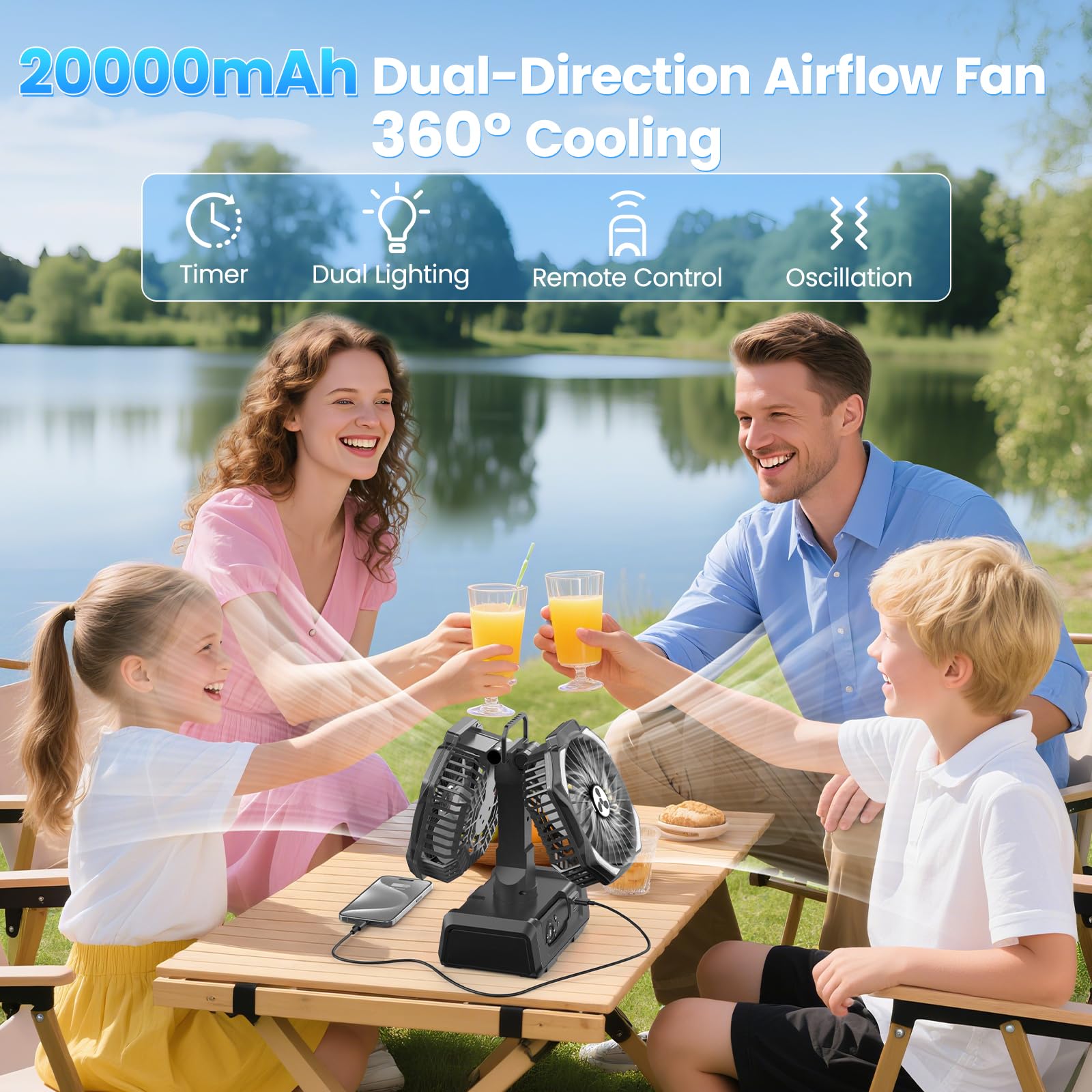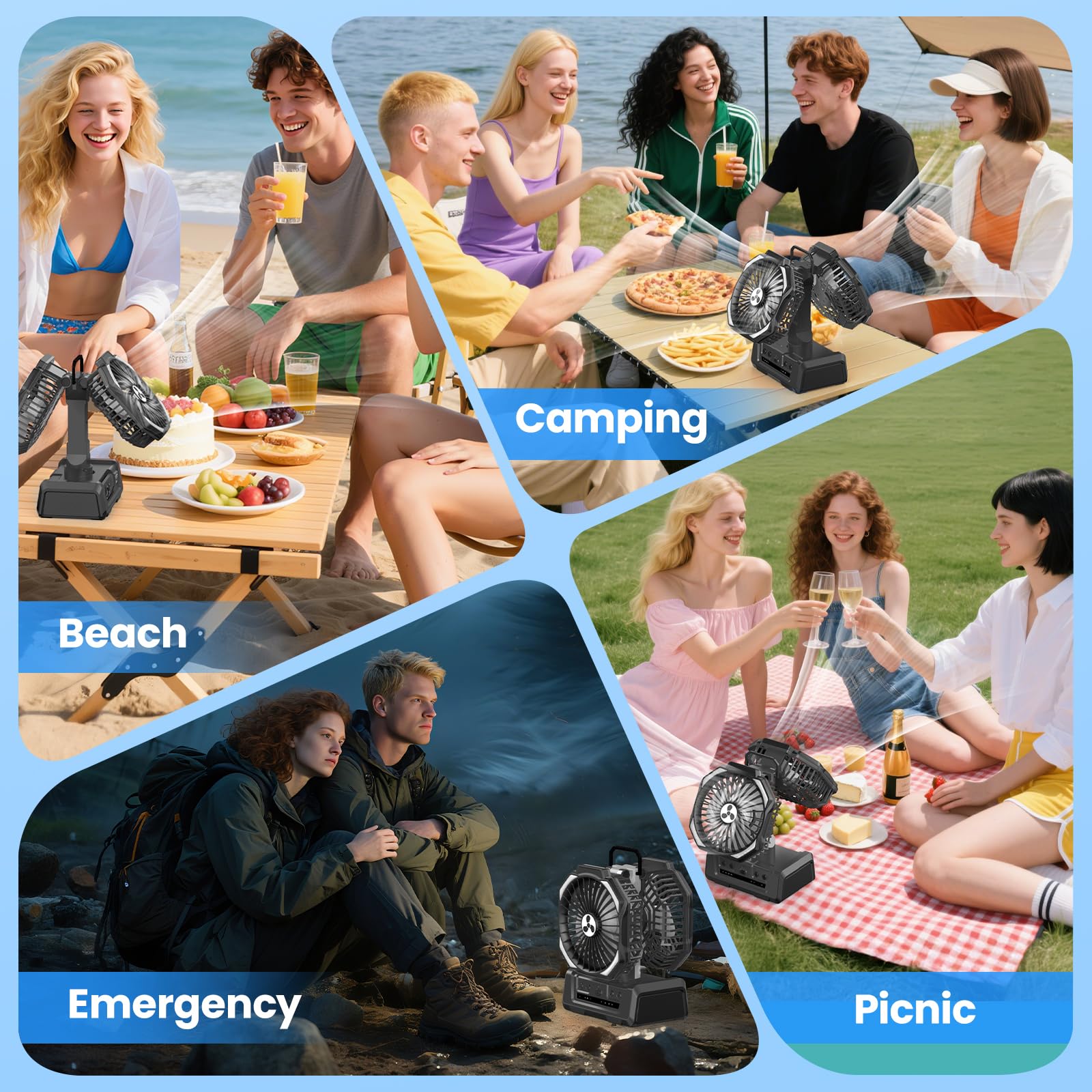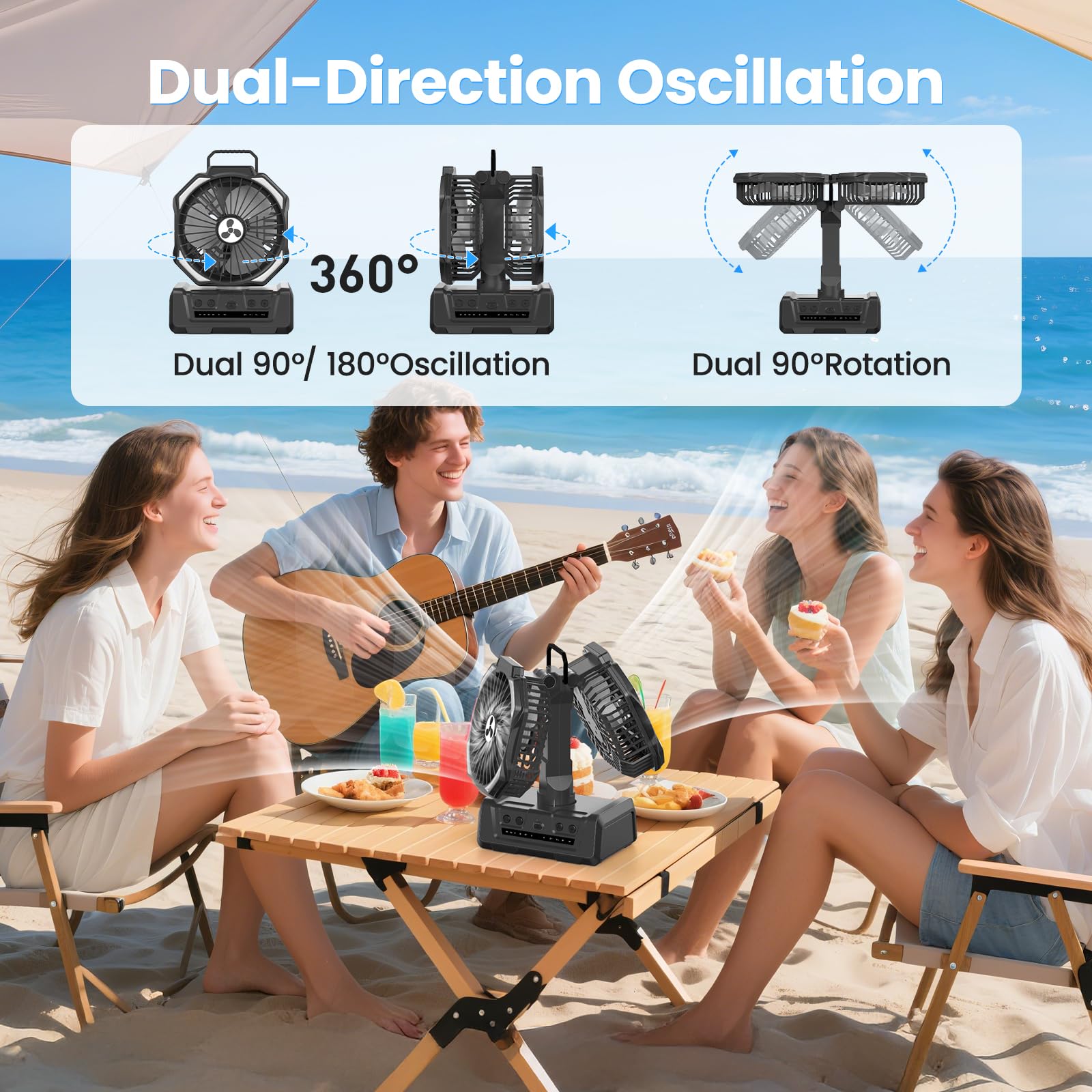 Innovative 360° Dual Head Portable Fan: dual head design camping fan delivers simultaneous front/rear airflow. With 4-speed settings, auto-oscillating 90°/180° rotation, and dual-sided max 90° tilt adjustment, this battery fan achieves 360° omni-directional cooling, creating comprehensive mobile cooling environment for picnics, campsites, fishing trips, and outdoor workspaces etc