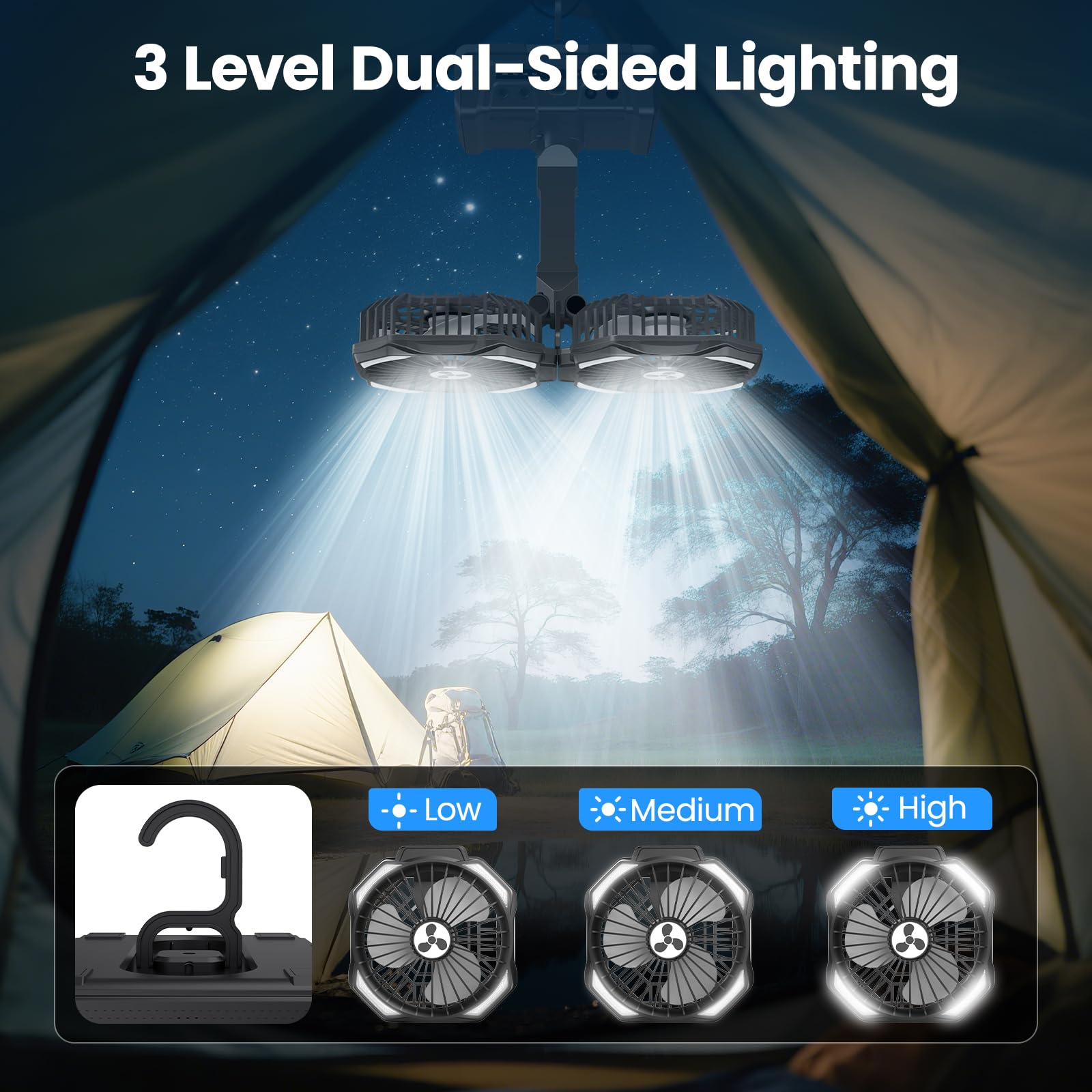Double Side Bright Light & Hook: This dual head cordless fan featuring 3-level dual-side lighting. The 360° lighting coverage reliably made this battery operated fan supports parties, work, camping and emergency scenarios. An integrated hanging hook on the base enables hanging on tents, hammocks, beach umbrellas, or other elevated positions—delivering instant cooling and illumination anywhere needed