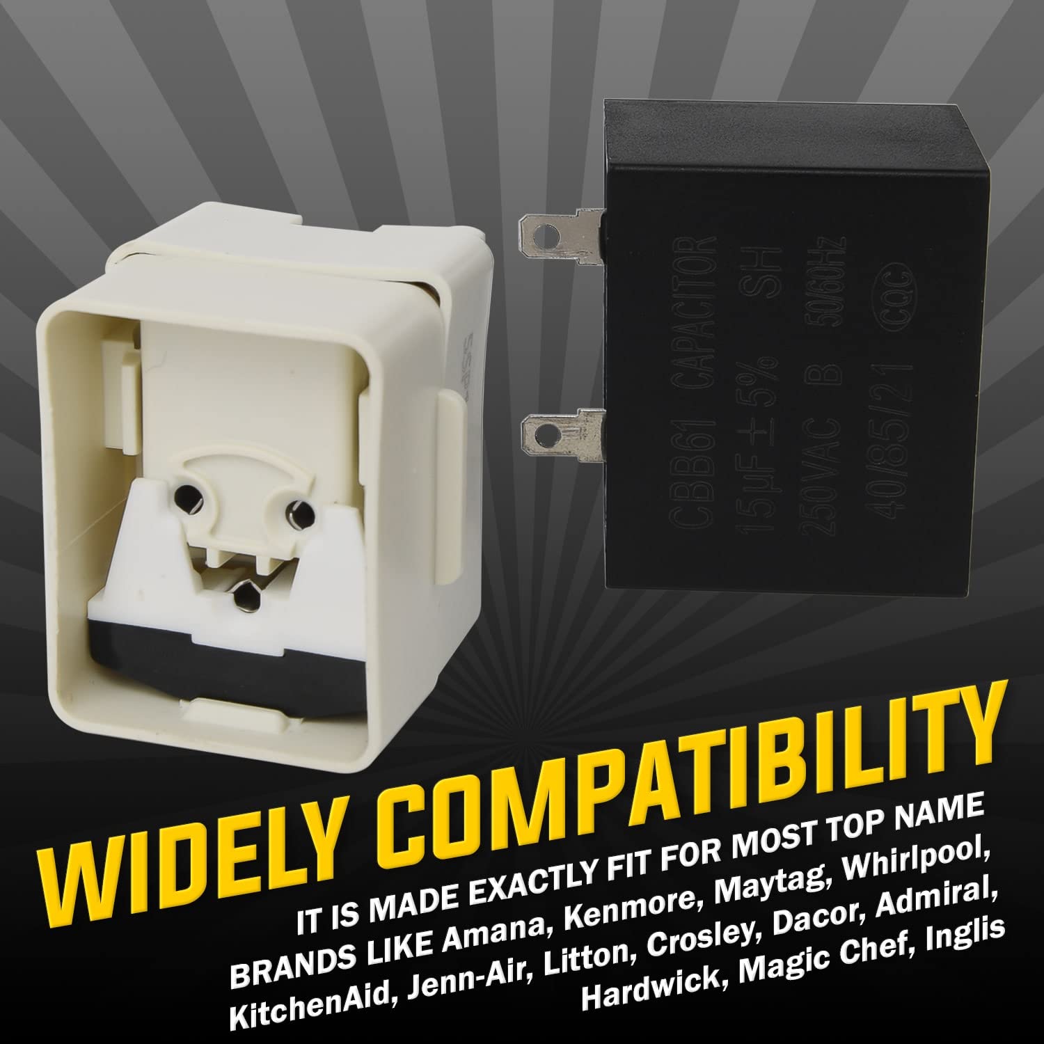 MODEL NUMBER: W10613606 Refrigerator Compressor Start Relay and Capacitor. Replaces part numbers: W10416065, PS8746522, 67003186, PS8746522, AP5787784, EAP8746522, 14217273, 67003186, 67003764, 67005560, 67005561, 67005562, 8171210, 8208290, 8208368, C8931605, W10416065, W10613606VP, 14217273, 67003186