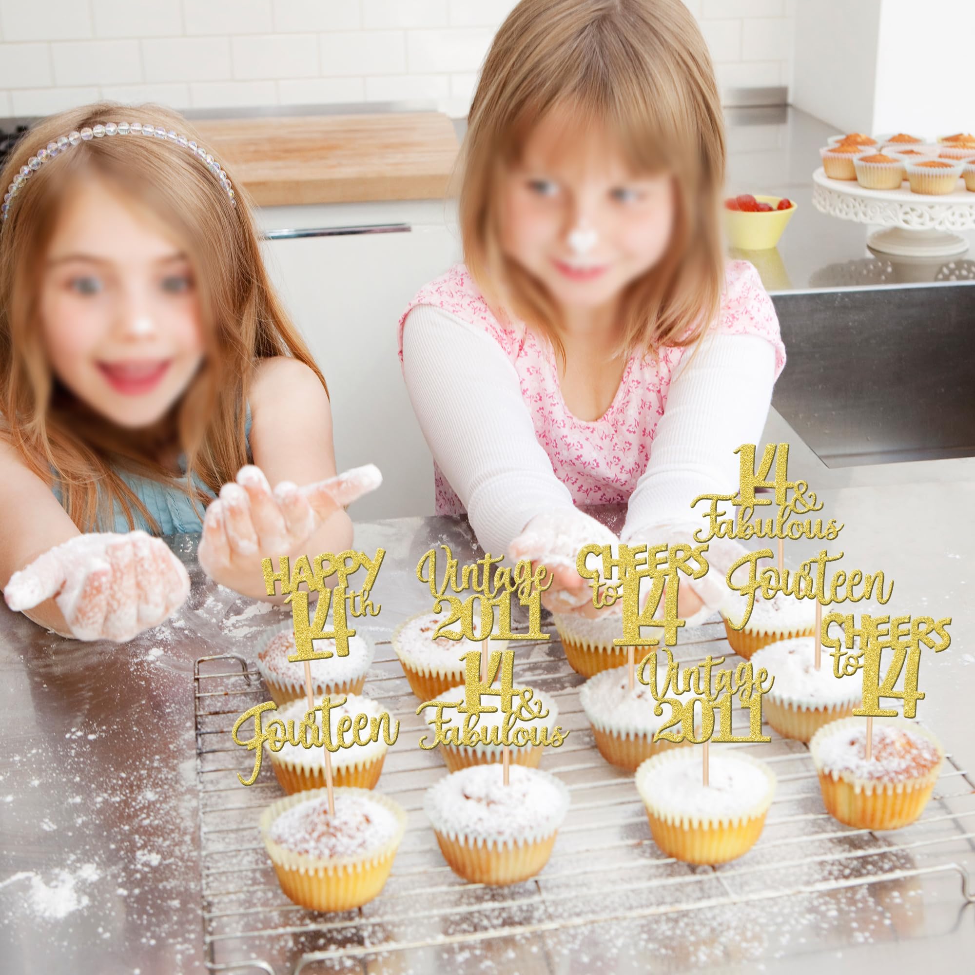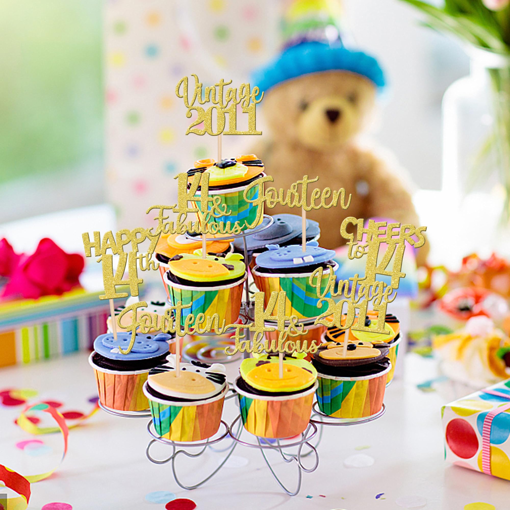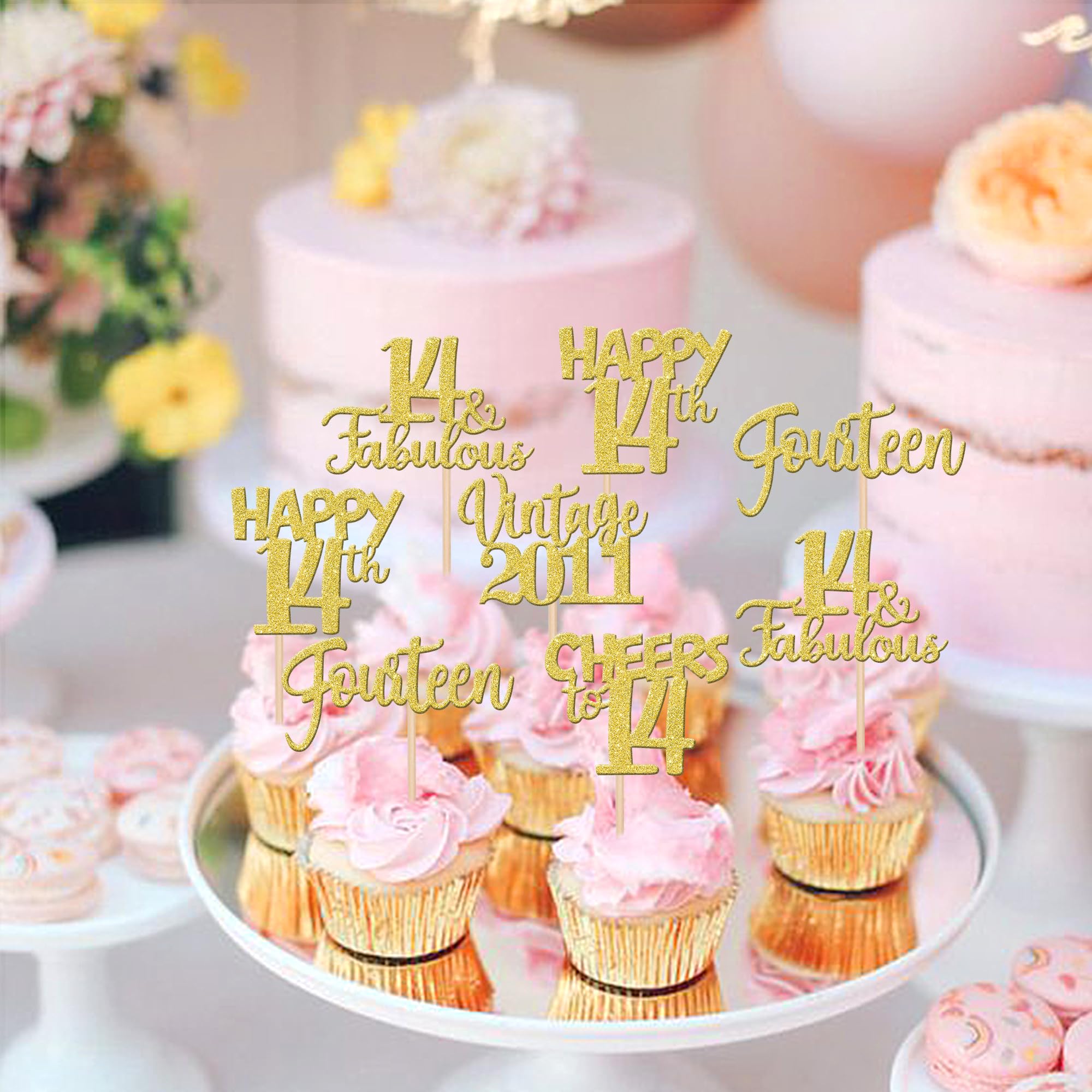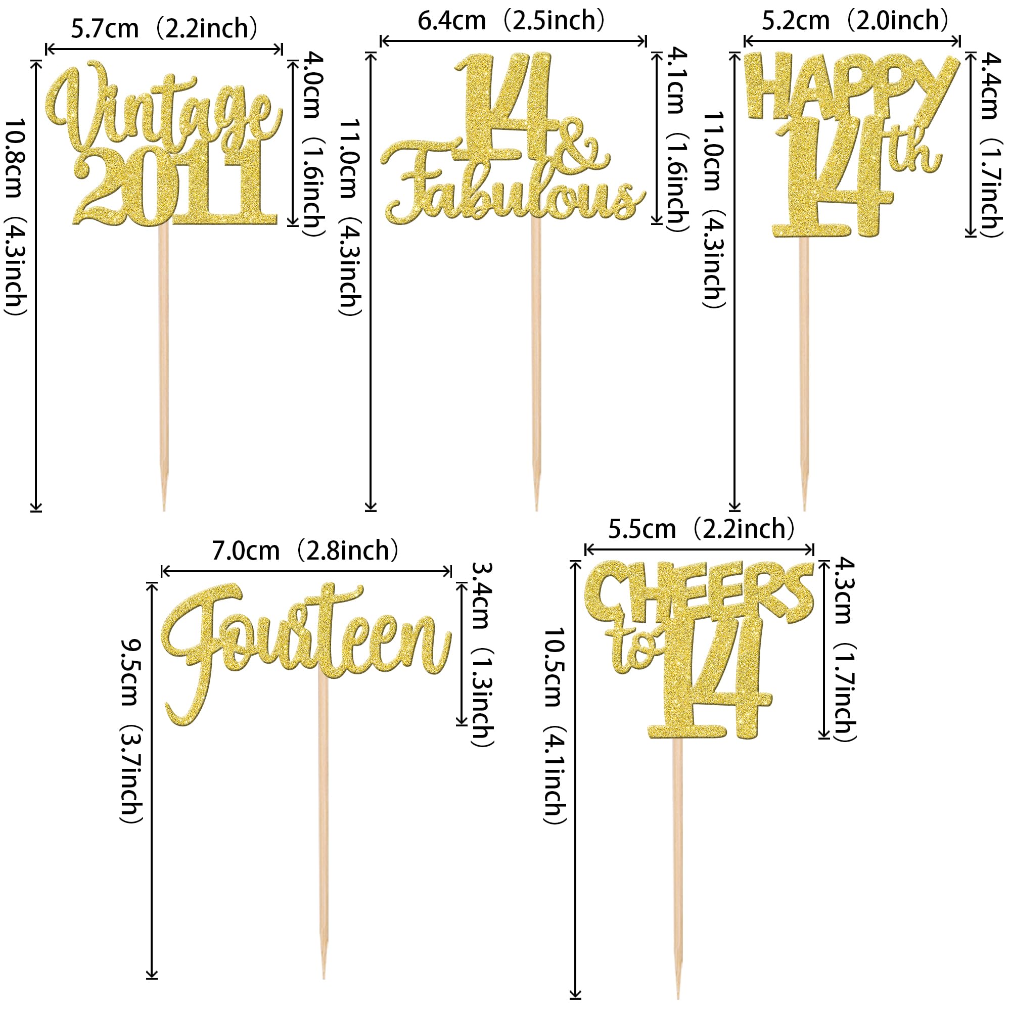 Vintage 2011 Theme 14th Birthday Party Cupcake Decorations Perfect for vintage 2011 theme party, 14th birthday theme party, 14th wedding anniversary theme party, cheers to 14 years theme party cupcake decorations supplies. Pack of 30 pcs,6 pcs of each design The size is 2.2*4.3/ 2.5*4.3/ 2*4.3/ 2.8*3.7/ 2.2*4.1 inch ( with stick ) Made of high quality paper card stock,thick and thick and sturdy. These cupcake toppers are single glitter, the back is white, and they are intended for decoration only, please do not put them in oven or microwave. If the item you received has any defects, please contact us immediately.we will deal with it within 24 hours.