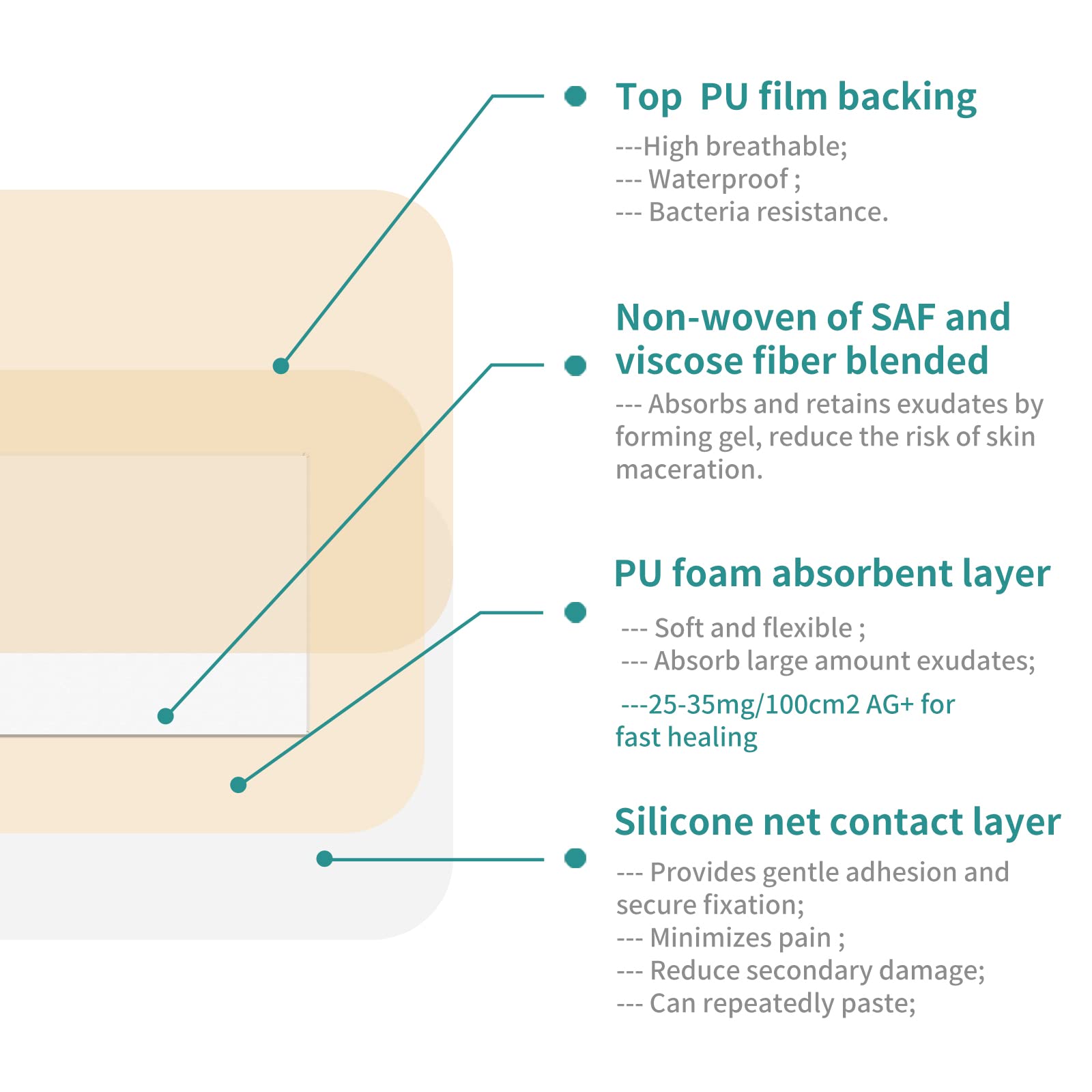 PREMIUM EFFECTIVE(Ag+) MATERIAL: It is a sterile, single-use dressing, the foam layer contain about 0.25-0.35mg/cm2 silver. The dressing absorbs wound exudate and releases silver ions within the dressing in the presence of wound fluid to help reduce bacterial colonization of the dressing.