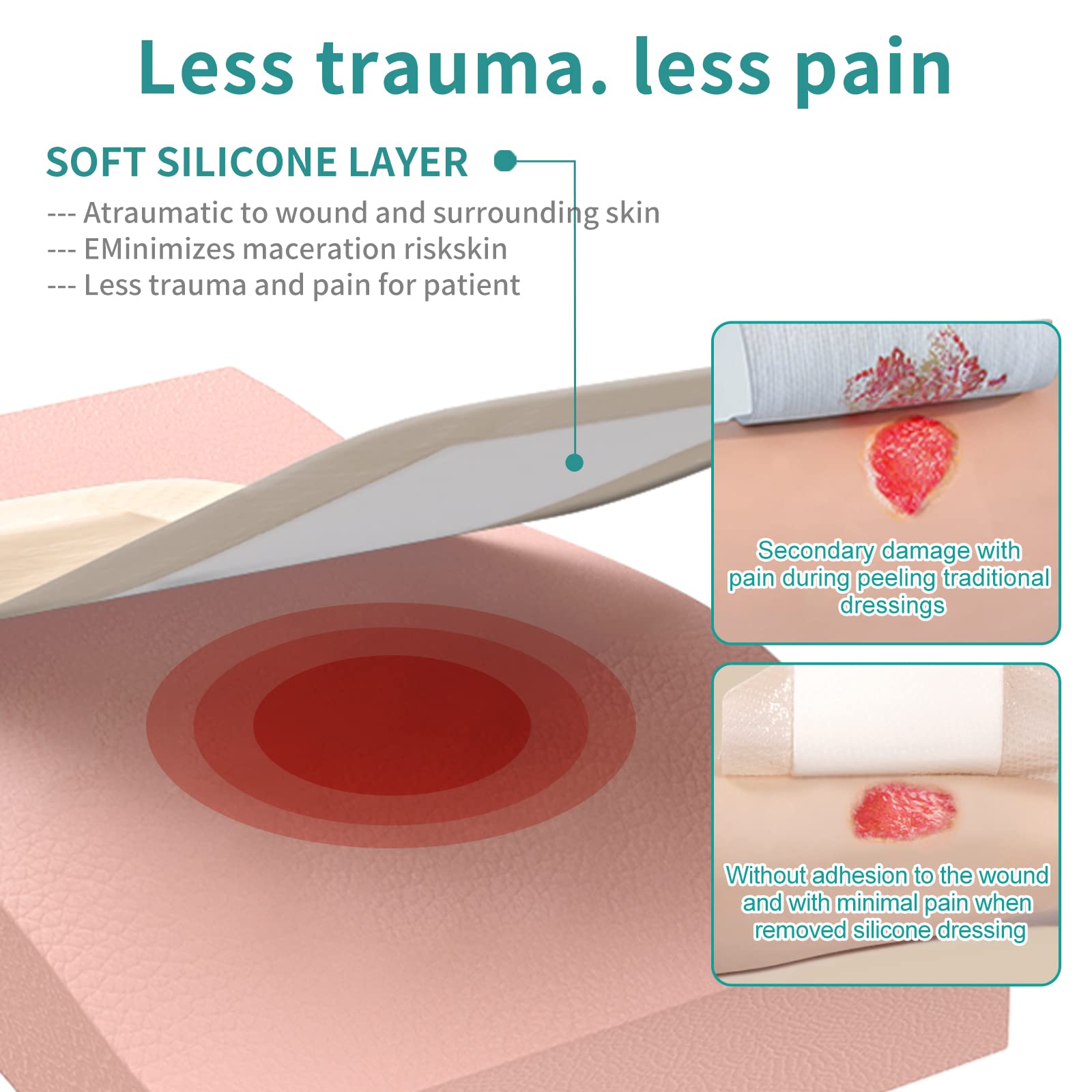 EASY TO APPLY AND REMOVE- We adopts an A+ medical-grade hypoallergenic silicone as a wound contact layer, it absorbs dead tissue cells, won't stick to the moist wound, while is sticky enough to stick to dry skin, minimize pain and trauma at dressings change.