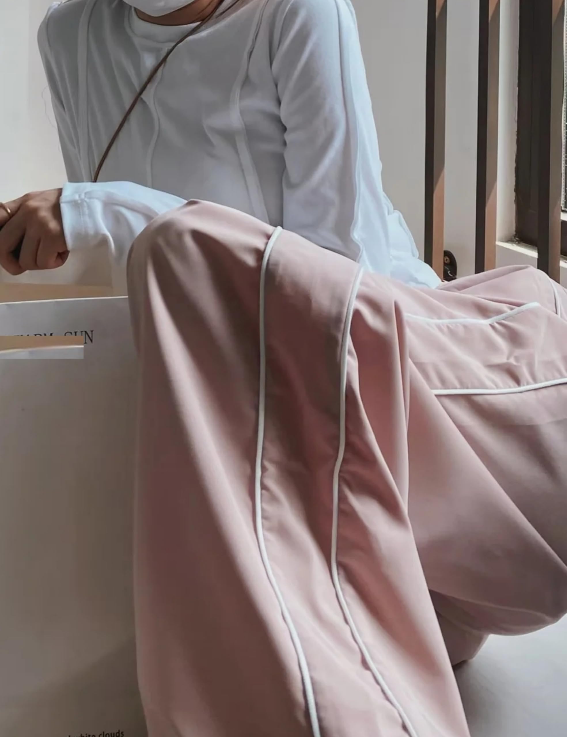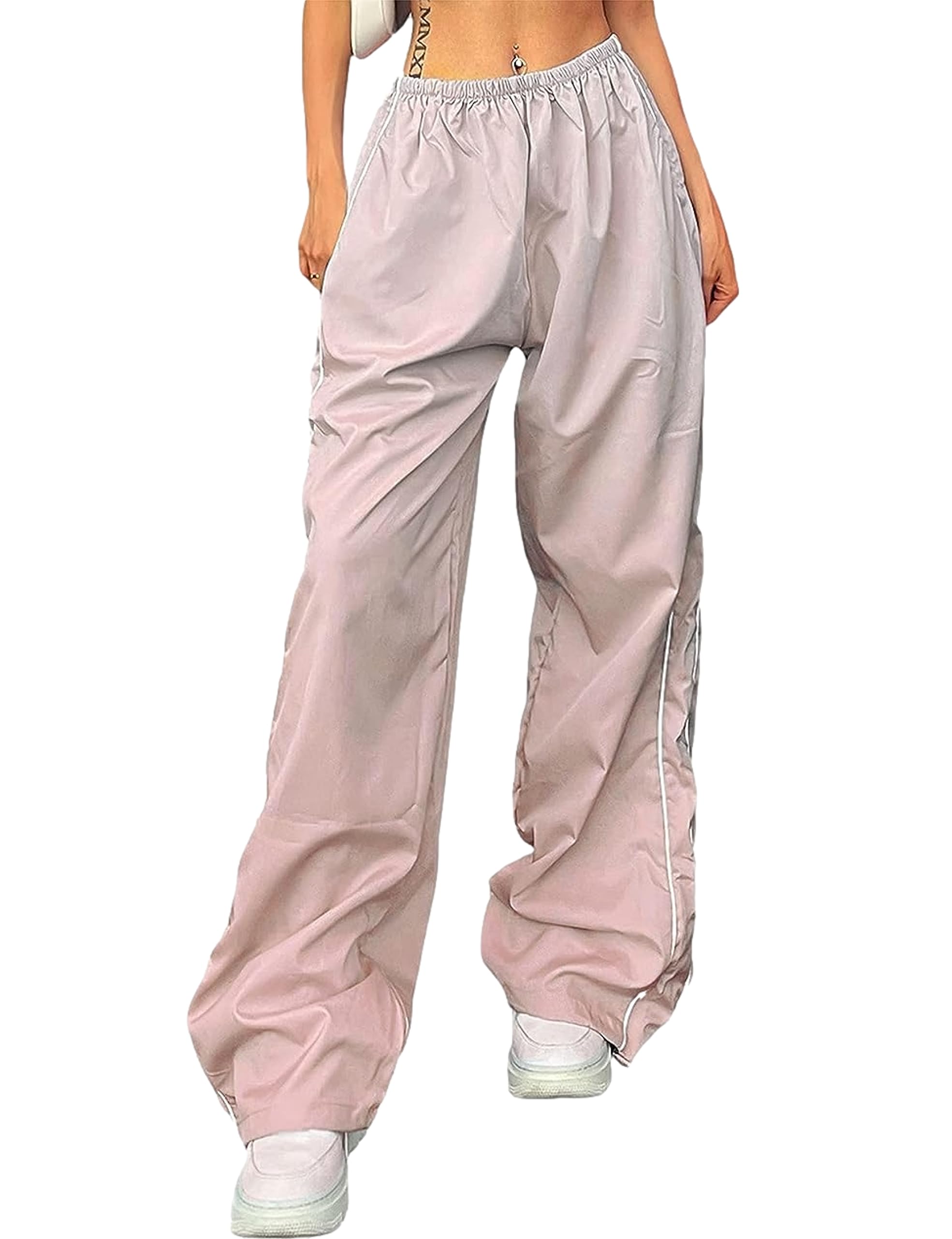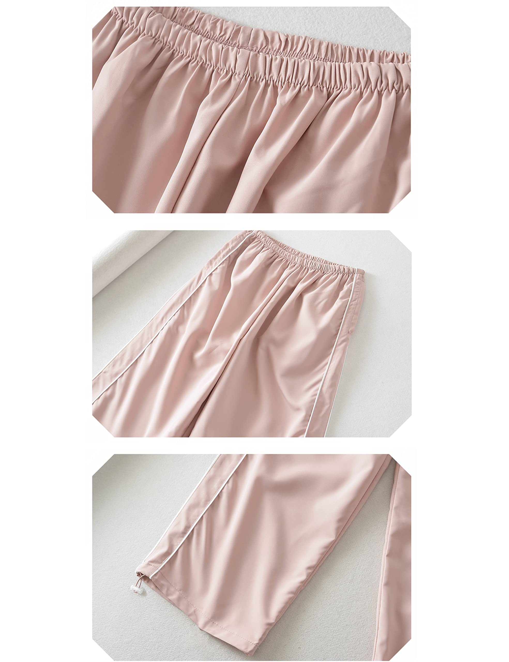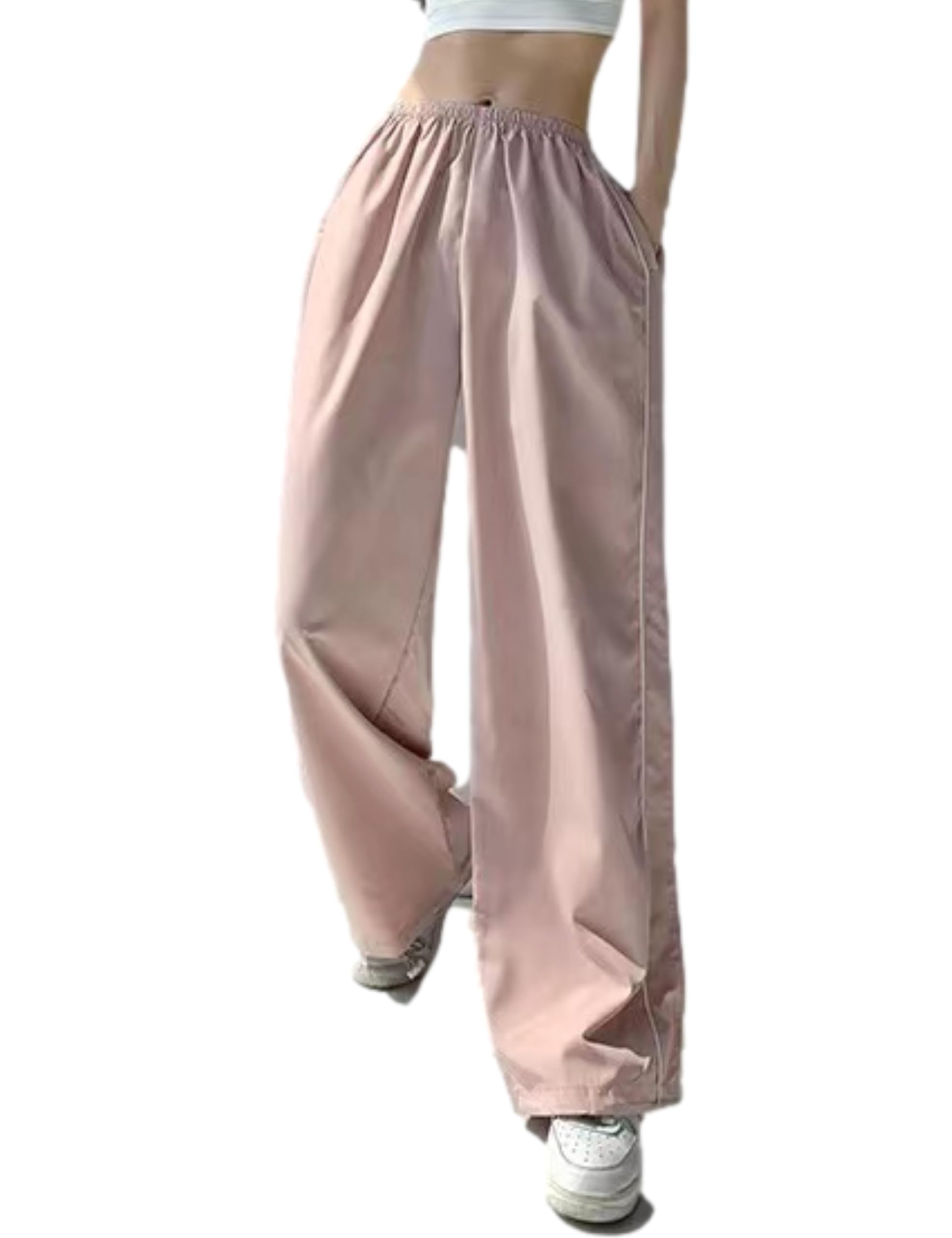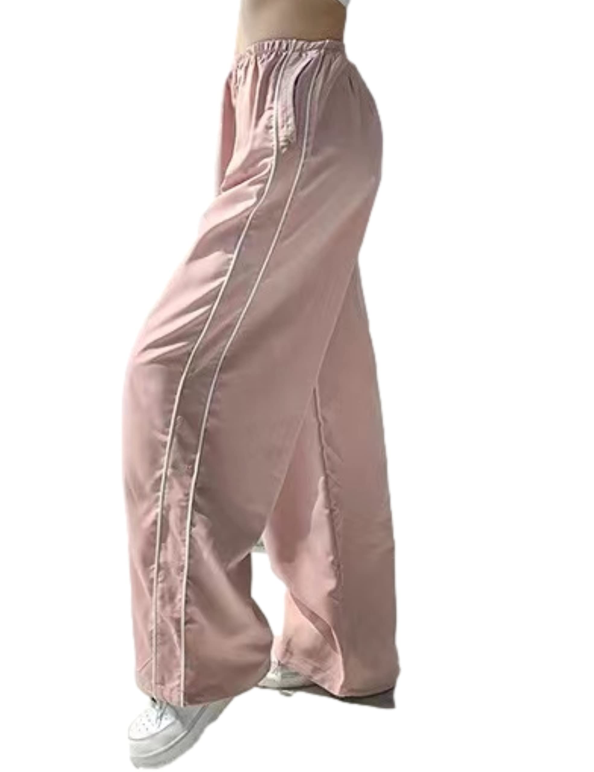 Design: Casual loose parachute pants for women, baggy sweatpants, ankle full length, wide leg trousers, straight leg pants, elasticized stretchy waistband for a flexible fit, simple but versatile, striking side stripes, welt side pockets, adjustable drawstring cuff, adding fashion to your overall dress