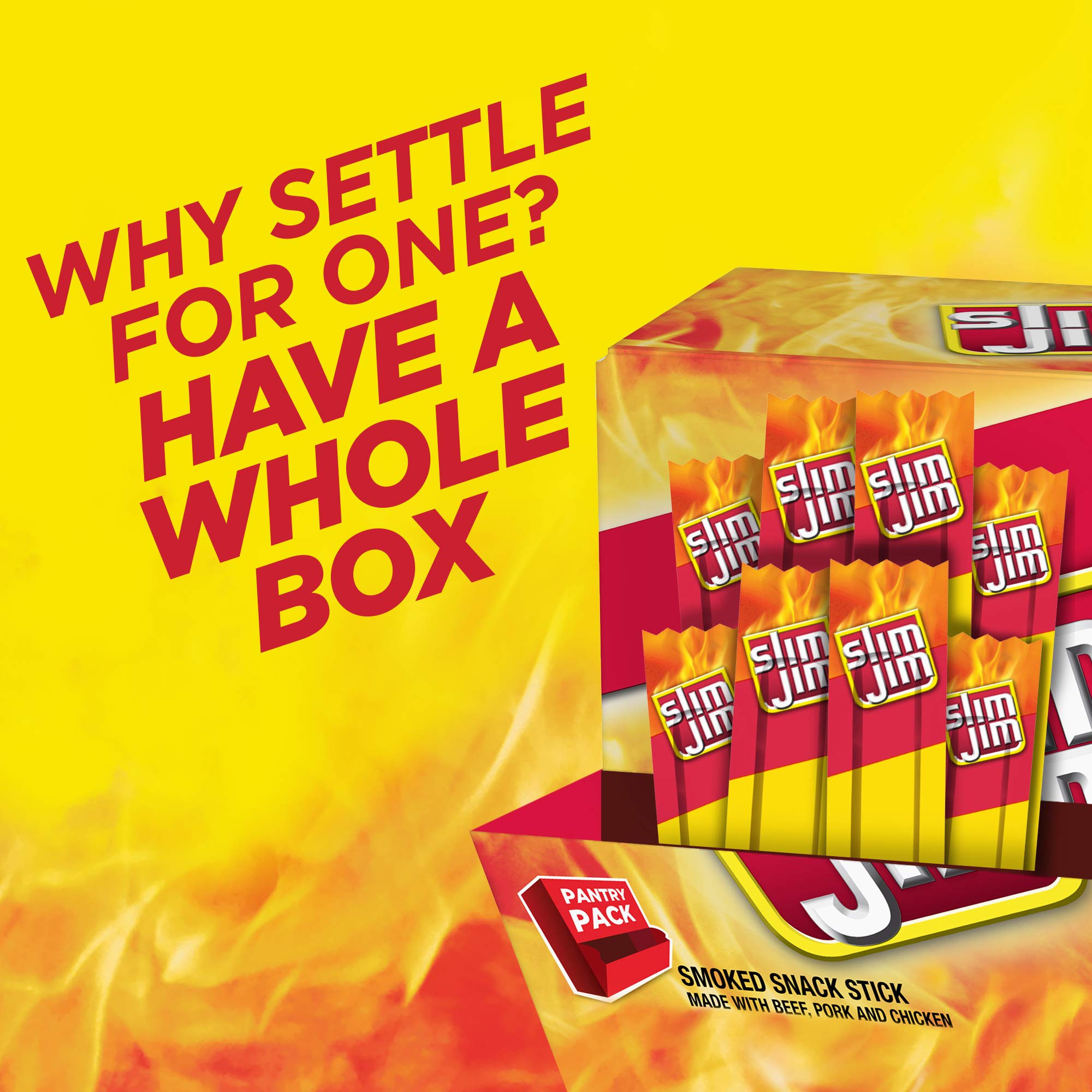 Experience intense, smoky flavor with delicious Slim Jim Original Snack Size Sticks. Made with beef, pork and chicken, these meat sticks contain no artificial flavors or colors for full meaty flavor everyone can love. Each meat stick serving is loaded with 6 grams of protein, ideal for protein snacks that kick hunger to the curb and leave you feeling satisfied. These individually wrapped snacks go where you go and are perfect as travel snacks, school snacks or anywhere meat snacks. Slim Jim Original Snack Size Sticks offer a bold and tasty way to take on the day. This box contains 46 individual snacks, so you are ready to hit back when savory cravings hit. Slim Jim keeps it interesting with a full line of beef sticks, snack sticks, pork rinds and jerky. Snap into a Slim Jim(R)!