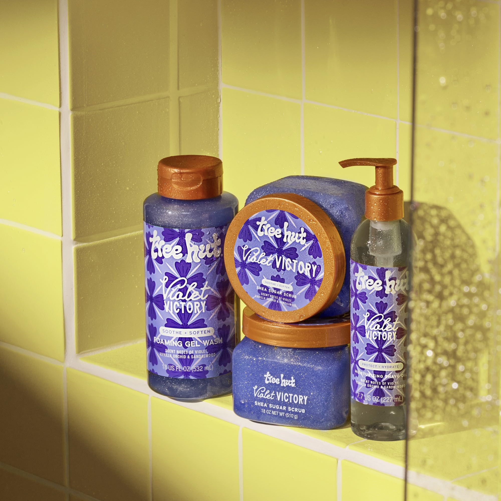 Boost your shower routine with Tree Hut Violet Victory Shea Sugar Body Scrub. This whipped scrub combines sugar crystals and rich Shea Butter to exfoliate and nourish your skin. The serene scent of sugared violet, vanilla orchid, and sandalwood evokes the feeling of watching sunset-colored skies. Infused with pistachio, avocado, and sweet almond oils, it softens, hydrates, and enhances your glow. Always cruelty-free and free from parabens, sulfates, and formaldehyde.