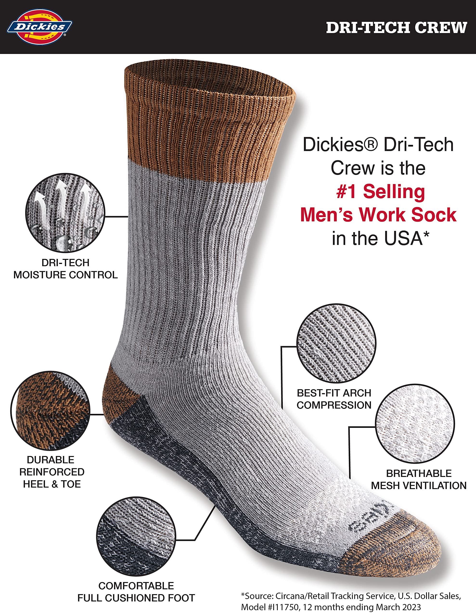 Description Dickies dri-tech comfort 6 Pairs crew with wicking, moisture management fibers keeps feet dry, ventilation channels engineered for air circulation and moisture control, arch compression hugs feet and keeps socks in place, while providing in-step support, Reciprocated heel and toe for superior fit and full cushion comfort