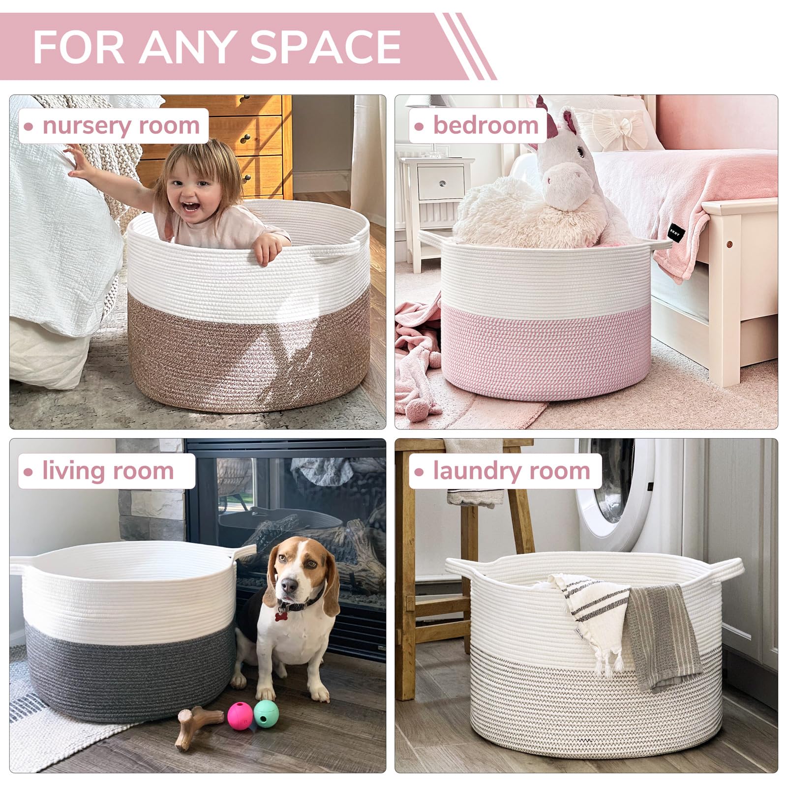 Large Multipurpose Basket. The pink rope basket is 21.7 x 21.7 x 13.8, which is perfect for storing clothes, stuffed toys, baby blankets, towels or any baby supplies in the nursery room and kid's room. It is also suitable to hold throw pillows, comforter or cushions in the bedroom and living room