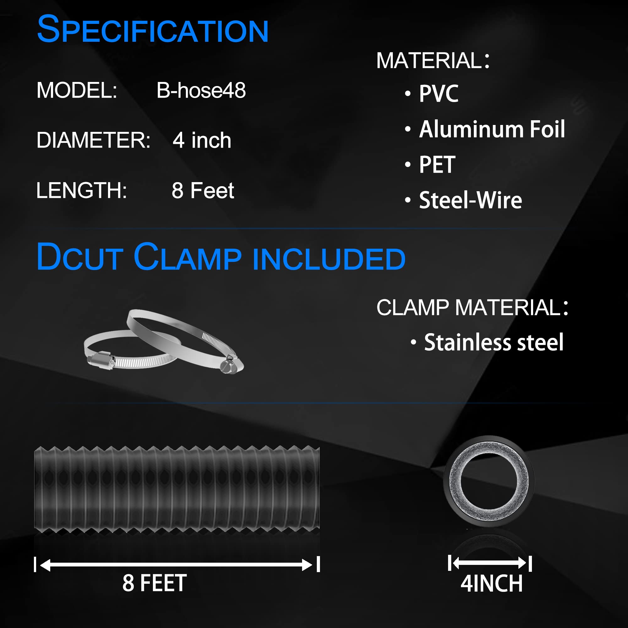[Material]:The Dryer Vent Hose is made of ( Aluminum Foil + PET +Steel wire+ PVC),The hose steel wire diameter is 1mm prevent deformation.The PVC film help to be light-proof,noise reduction and Insulation.