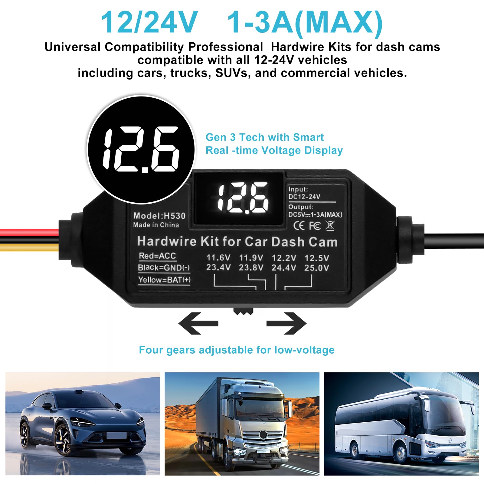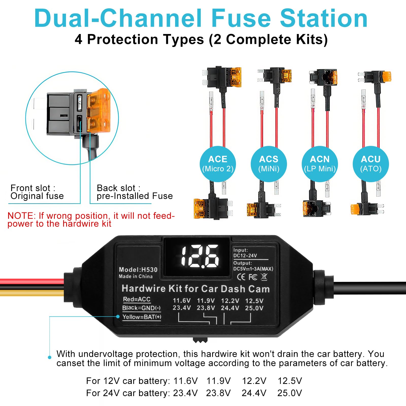 Smart 4-Level Voltage Protection :The dash cam power cable ensures 24 hr dash cam security without a dead battery. Simply select the cutoff ((11.6V/11.9V/12.2V/12.5V) for your battery and climate; the hard wire kit set auto-disconnects to ensure your engine starts