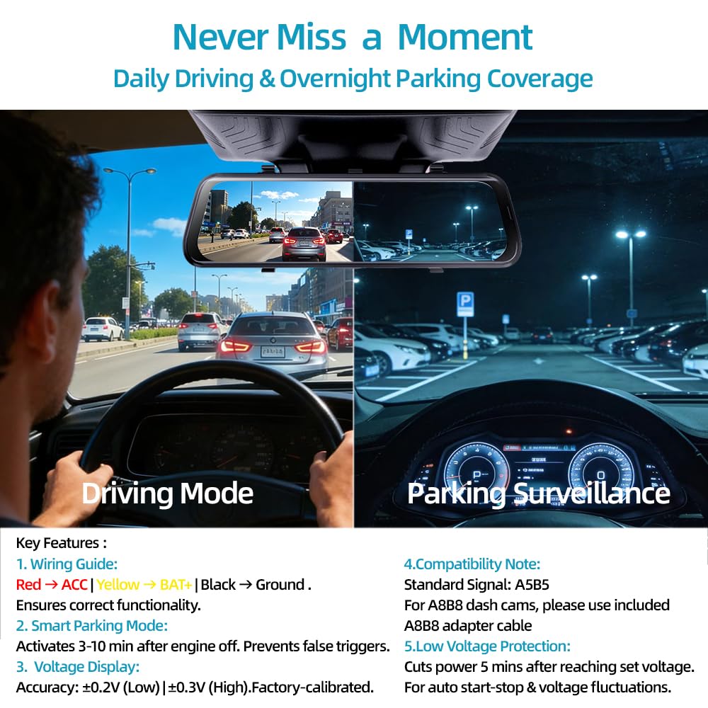 ACC Detection: Built-in screen shows your car battery's health at a glance.Automatically switches between Parking mode and Driving mode. No manual setup! Withstands engine start-stop surges for stable performance