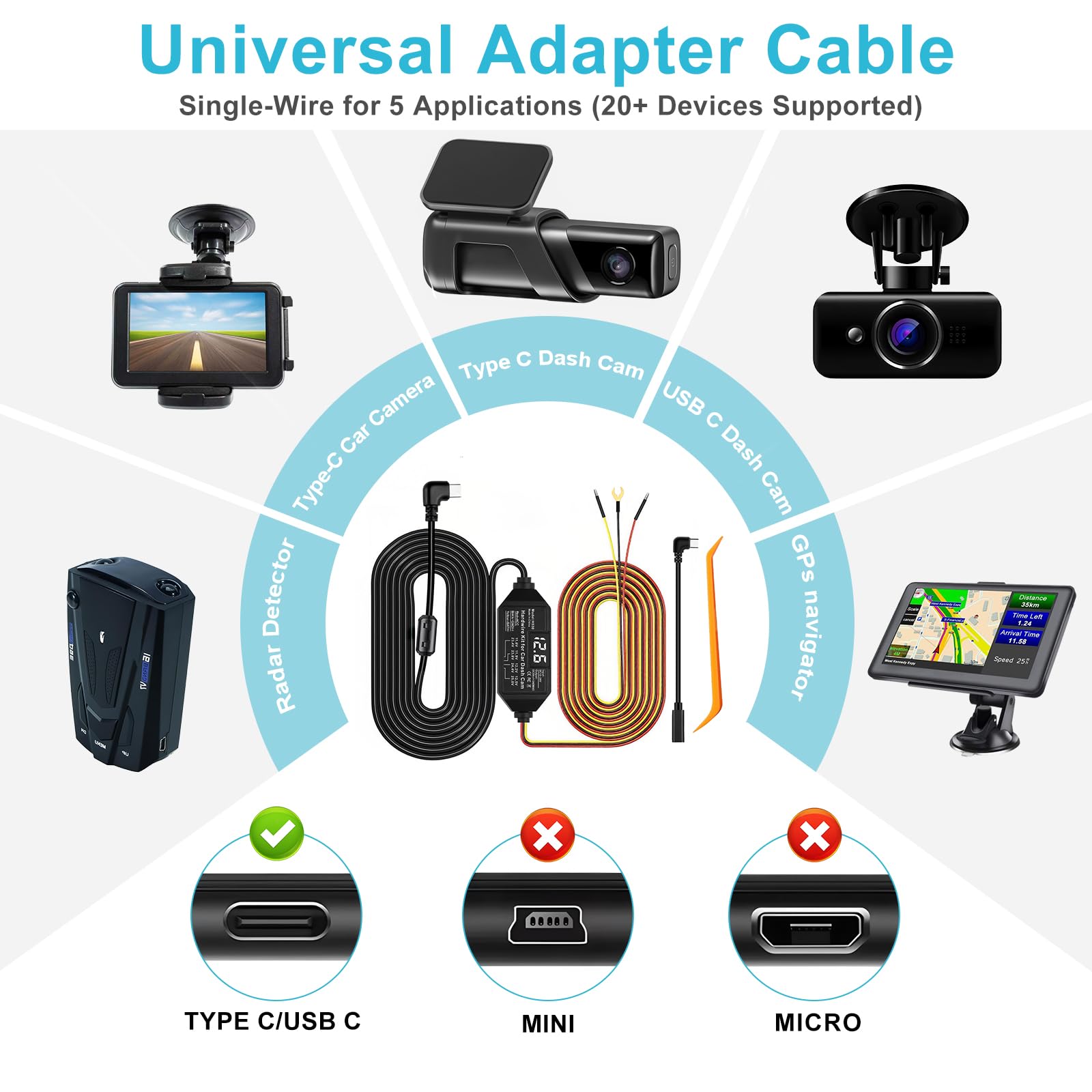 Universal Compatibility: This ACC hardwire kit works with all 12V-24V vehicles—from cars and trucks to large commercial vehicles—delivering continuous power to your USB-C dash cam. Note: This hardware kit uses the standard A5B5 signal. For dash cams that require an A8B8 signal (as some RO.VE or Rediger models ), simply connect using the included A8B8 adapter cable.