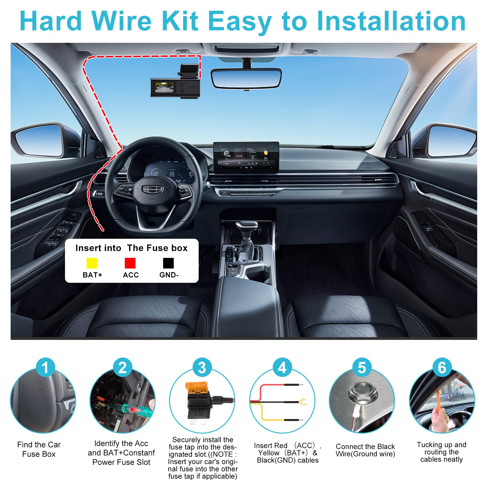 Easy Installation: Eliminate bulky cigarette lighter cables. This hardwire kit for dash camera includes fuse taps and a special tool for hidden wiring, helping you achieve a clean installation in about 10 minutes—ideal for beginners