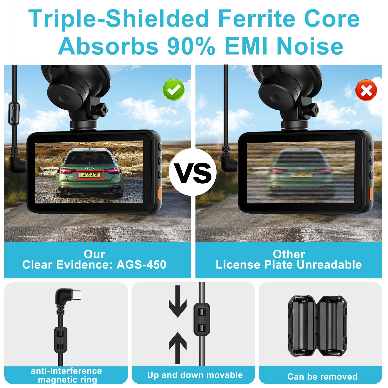 Noise-Reducing Ferrite Core: This Anti-Interference ring acts as a filter to block electrical interference from your car, providing clean power for sharper video and clearer audio—so you capture undeniable evidence