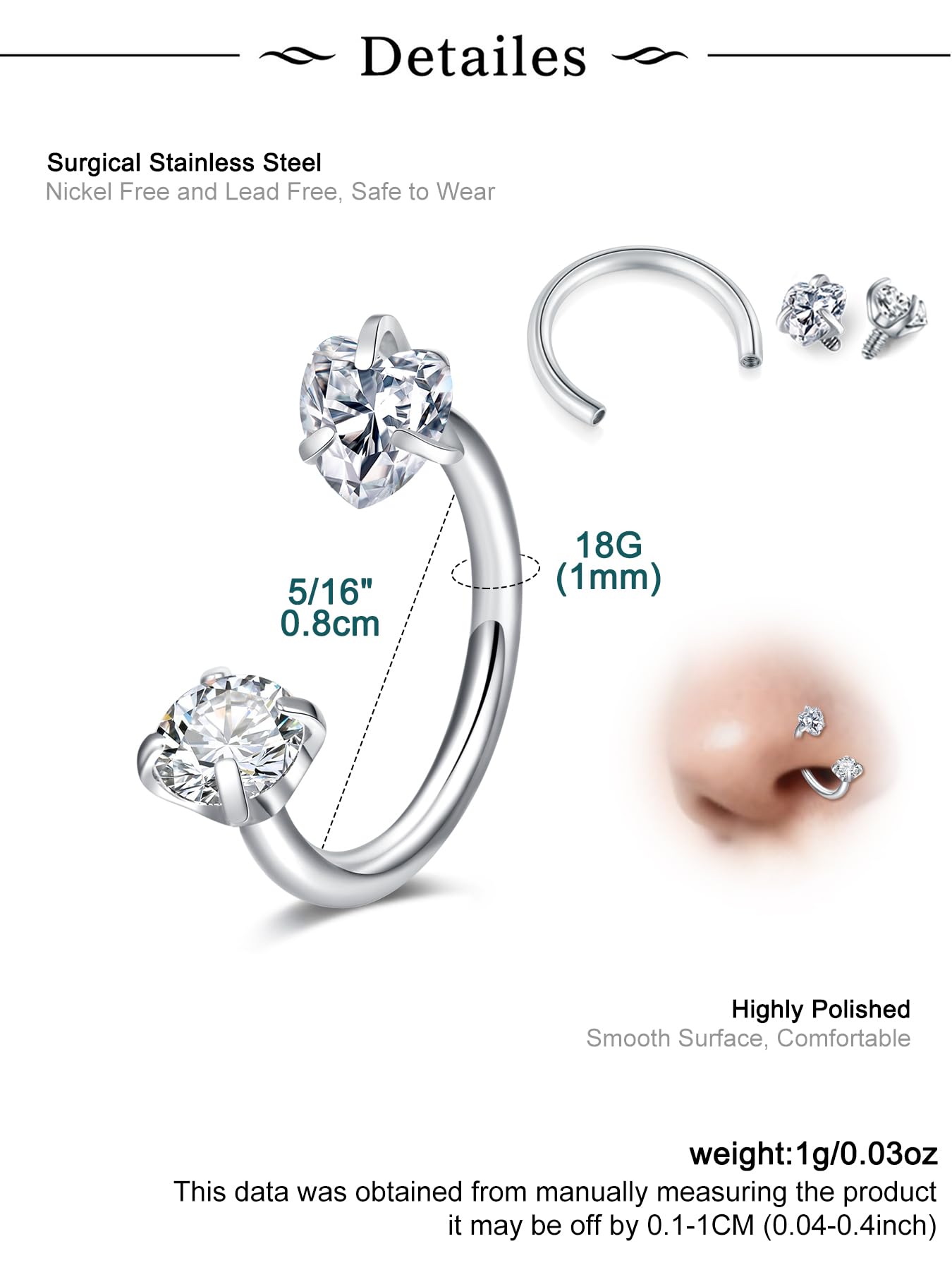 Measurements - silver horseshoe nose ring nose hoops 18g (1.0mm), horse shoe nose rings for women silver hoop nose ring inner diameter: 5/16"(8mm), double gem horseshoe nose ring gem size : 3mm;