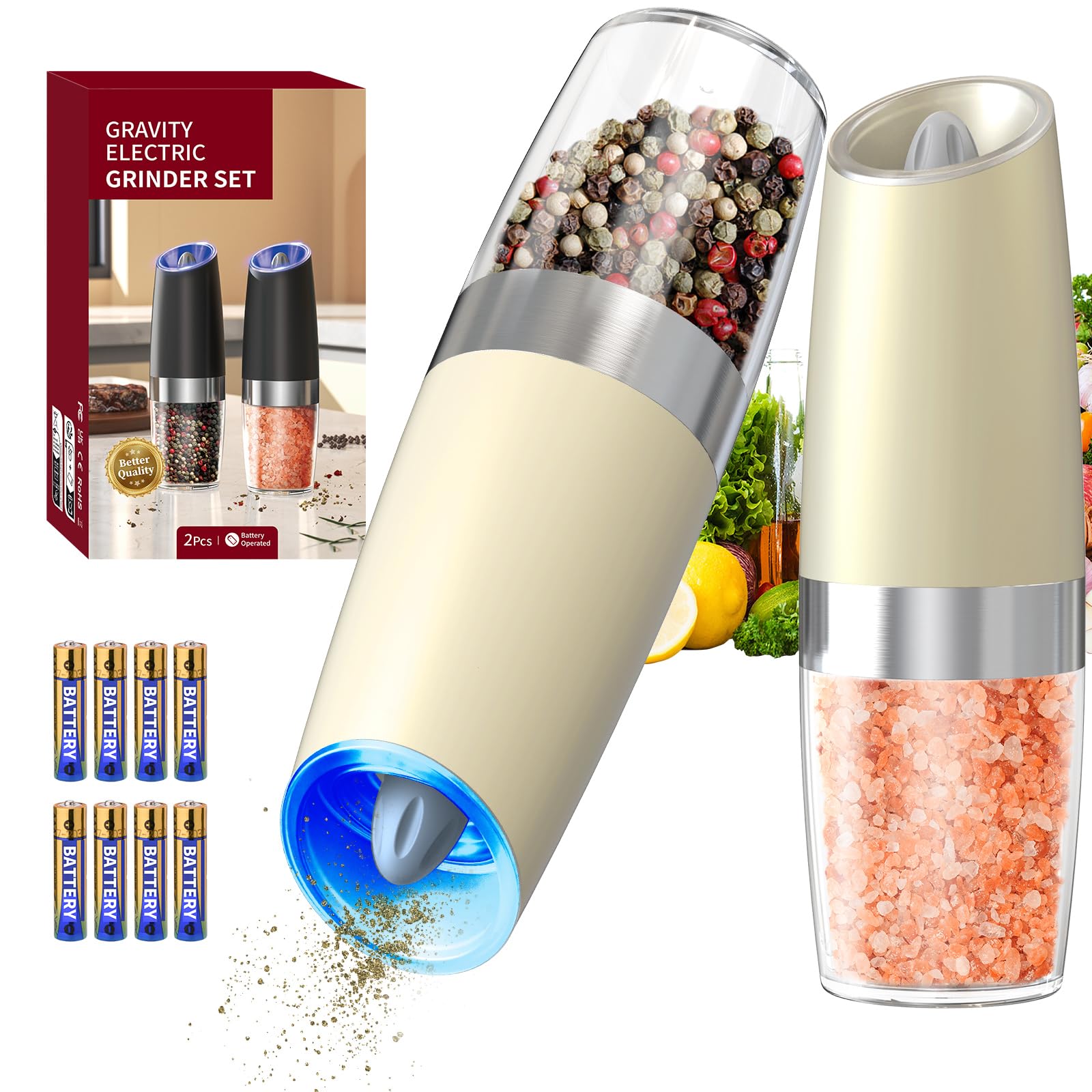 CIRCLE JOY Gravity Electric Salt and Pepper Grinder Set Automatic Salt and Pepper Grinder Set with LED Light, Battery Operated, Adjustable Coarseness, Large Capacity, for Home Kitchen BBQ, Beige