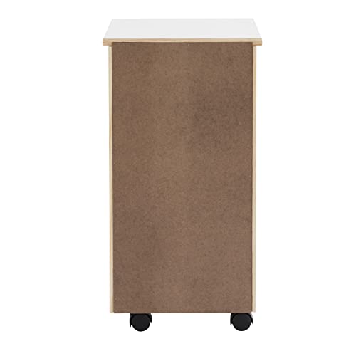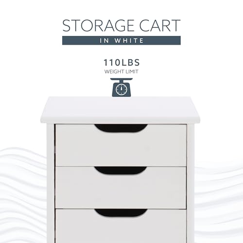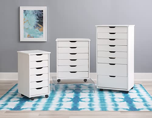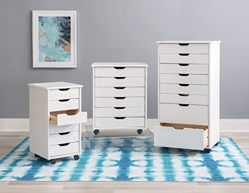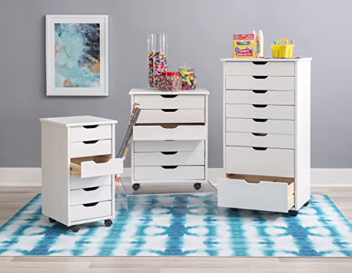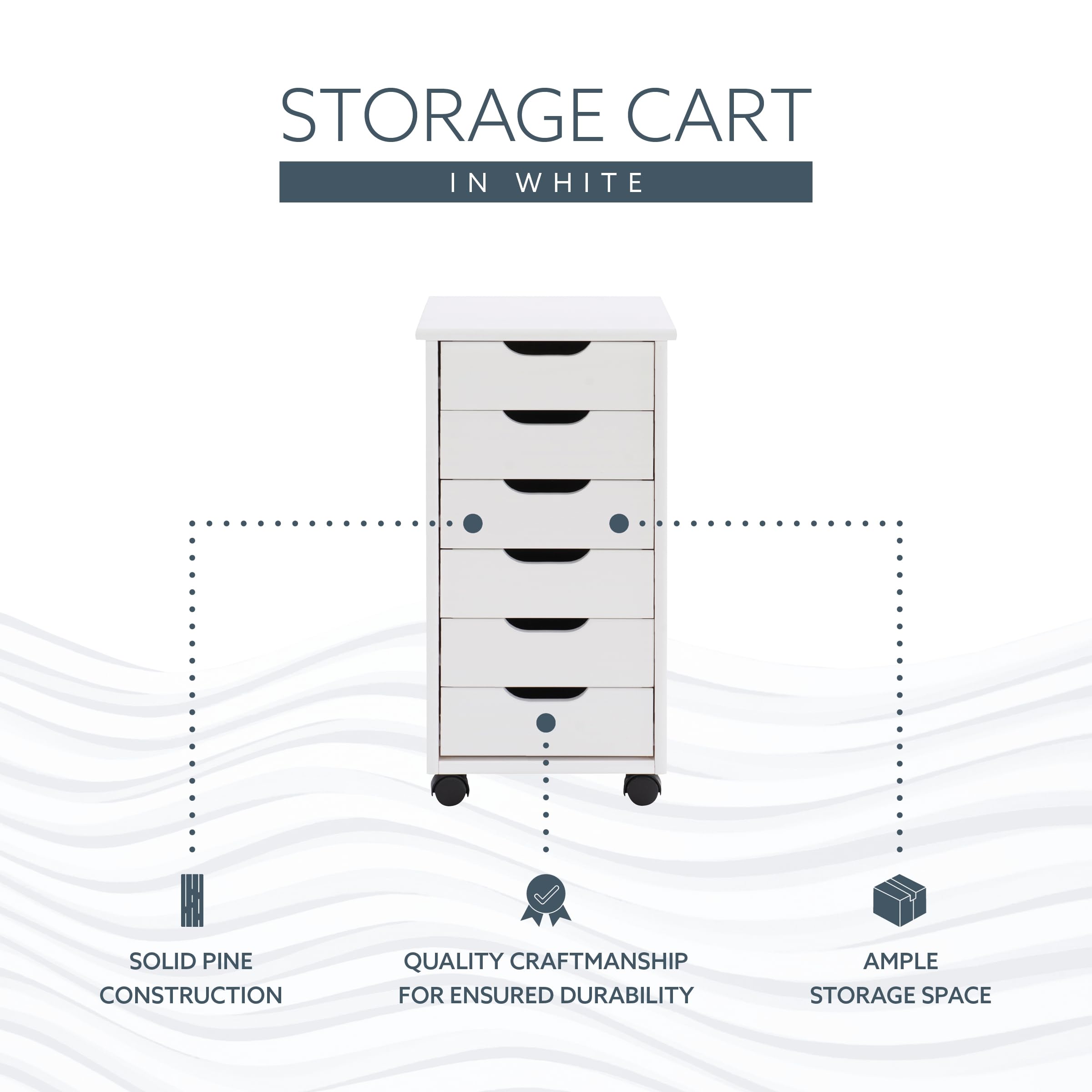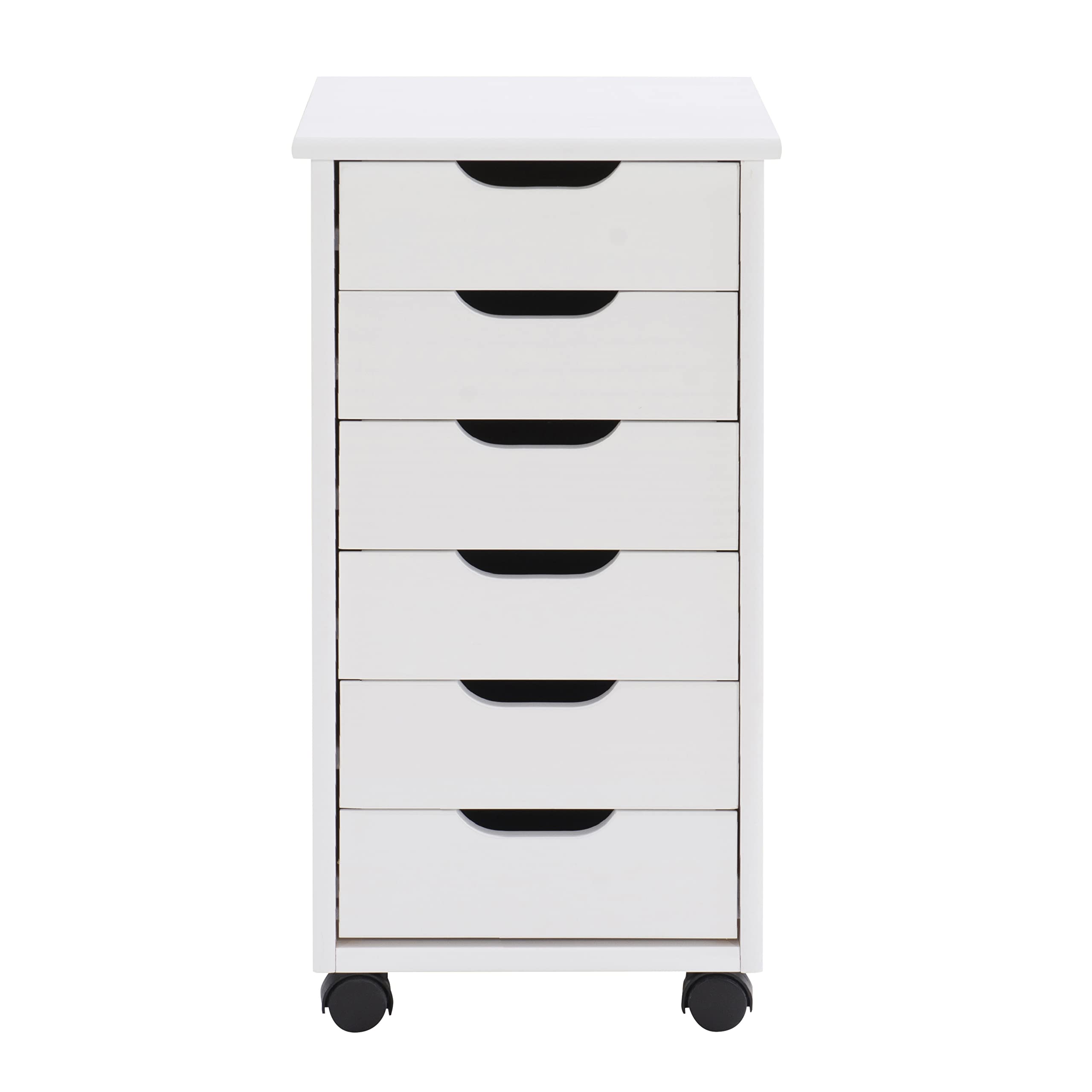 Crafted with a sturdy pinewood frame and finished in a white varnish, this piece provides functional storage and a crisp, modern aesthetic. The 6 drawers provide ample space for organizing everything from office supplies and craft materials to clothing accessories and household essentials. The smooth-glide design and recessed handles allow for effortless access, while the compact build is ideal for making the most of tight quarters. Caster wheels ensure easy and smooth mobility. With a height of 25.75”, this piece is perfect for placement next to a desk, vanity, sink, or tucked into a closet.