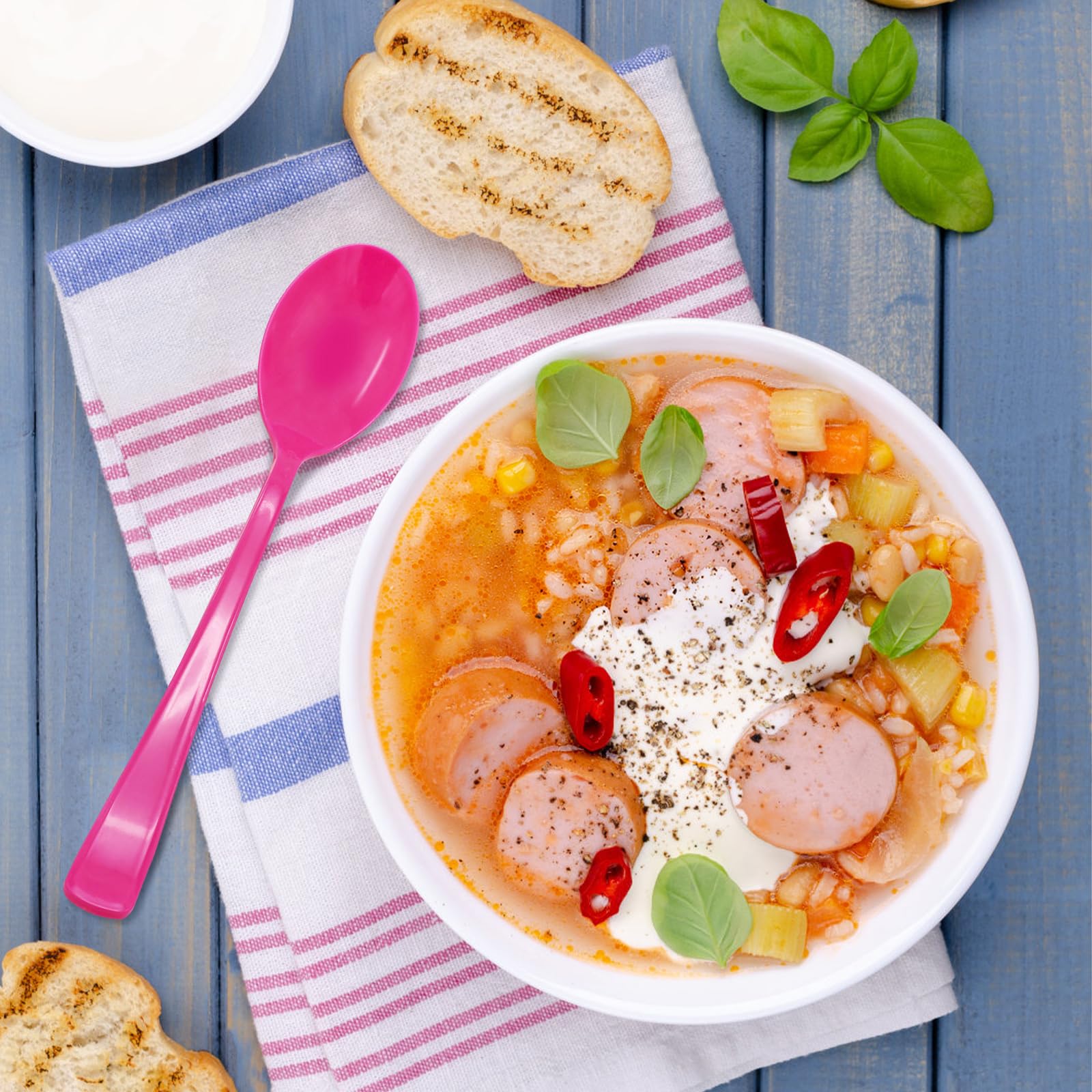 【Reliable Quality】: The hot pink plastic spoons are made of food-grade plastic material, which is non-toxic and harmless and can be in direct contact with food. Thickly designed at the handle, it is less prone to breakage and deformity, and has excellent durability and reliability. High-temperature resistant and suitable for all types of food, the hot pink spoons meets customers' needs.