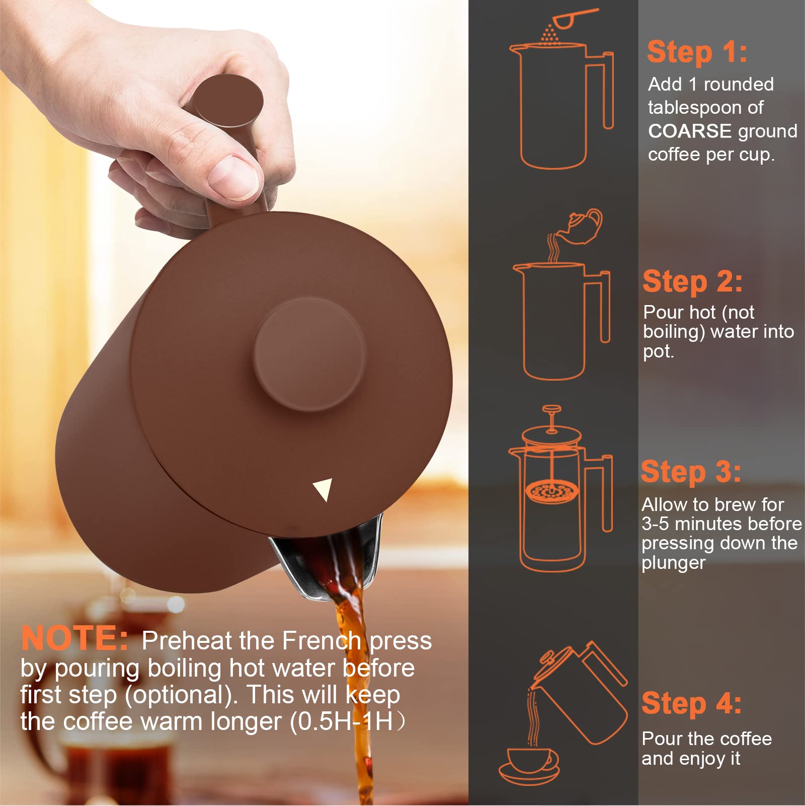 Perfect Brew & Stay Hot:34 OZ Large capacity double-wall stainless steel french press coffee maker will keep your coffee hot for 60 minutes longer than other steel and glass models. Turn the symbol (▲ ) away from the spout for superior thermal retention. Take your time and enjoy delicious coffee