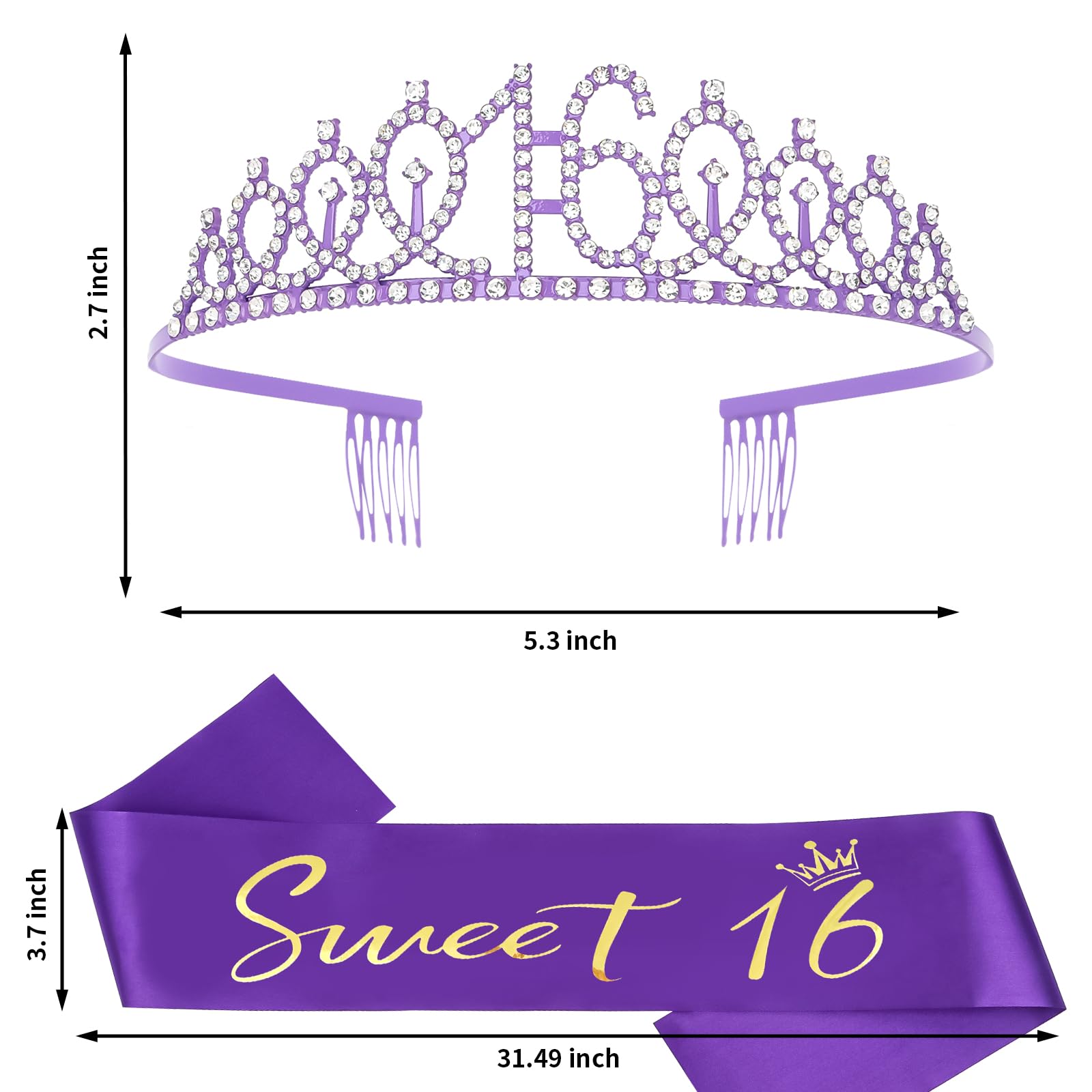 16th Birthday Tiara: The tiara is made of alloy and rhinestone. Fit for most women and girls.The rhinestone tiara is in 5.3 inch length, 2.7 inch height. In addition to being used as a birthday tiara, you can also use it as cake topper