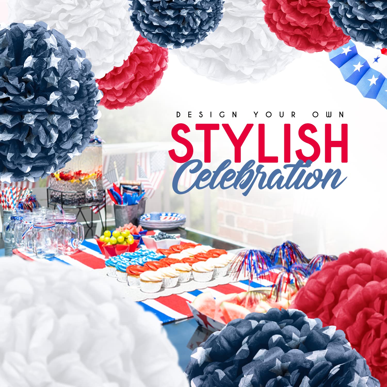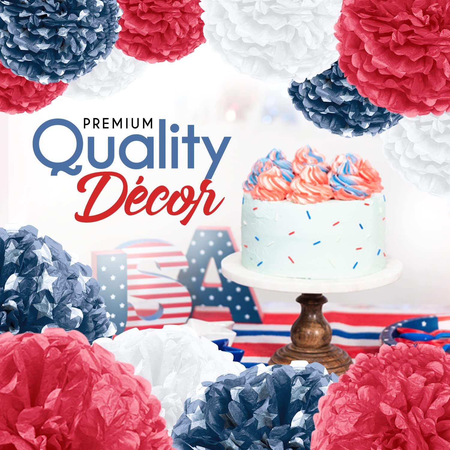 Bold Color Festivity: Infuse your event with vibrant patriotic paper decorations that range in size from 6" to 14". Perfect for birthday party decoration and bridal shower decor, these tissue flowers create a lively atmosphere for memorable occasions