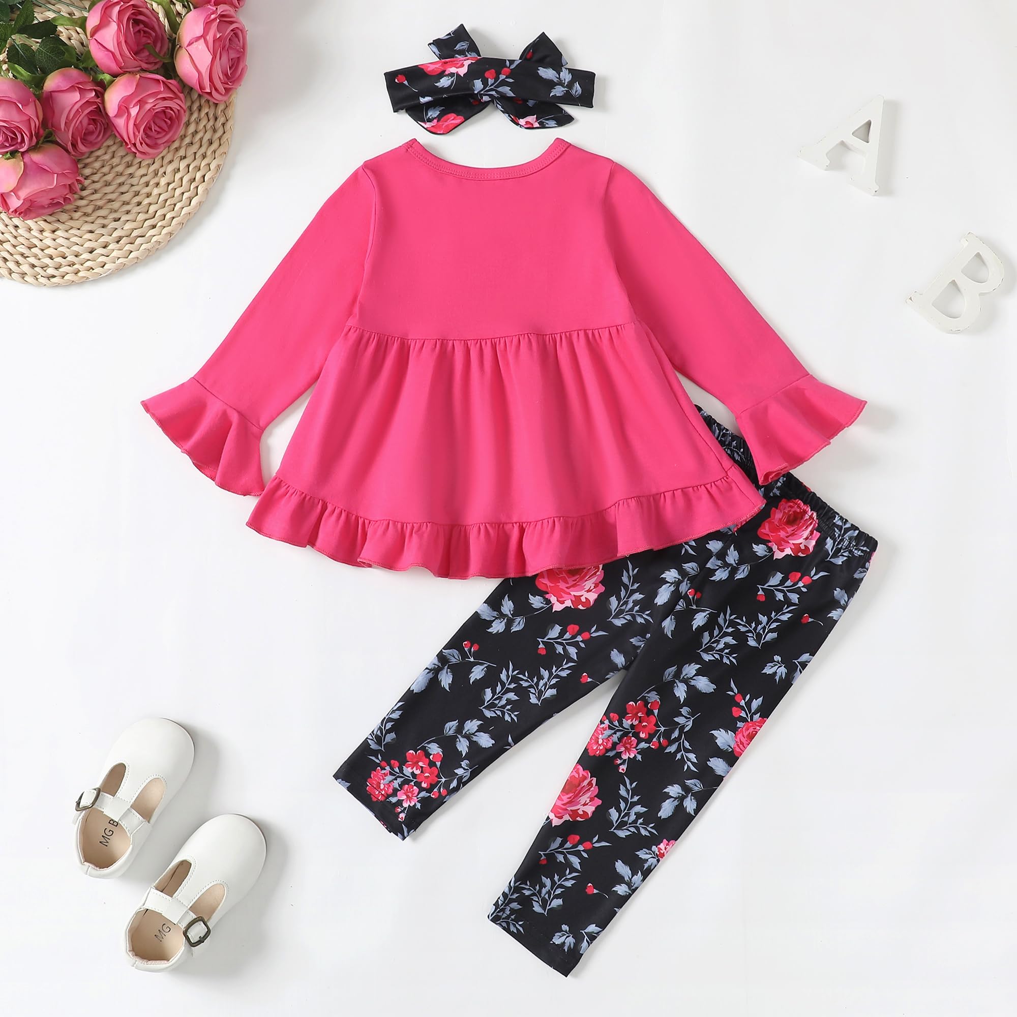 3 Pieces Toddler Little Girl Outift for Fall Winter: 1pc baby girl shirt + 1pc baby girl pants + 1pc untied headband