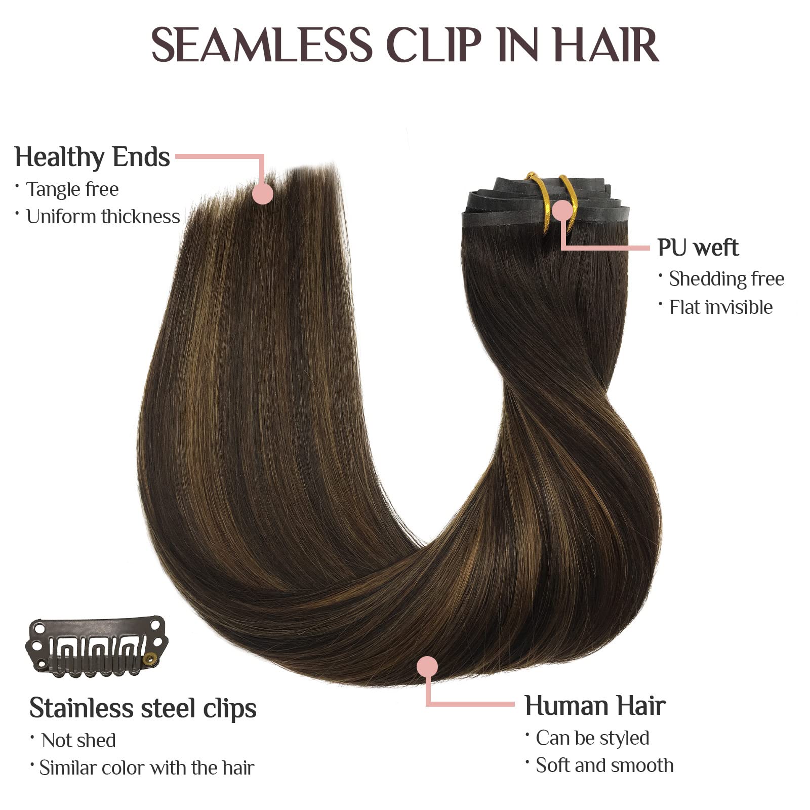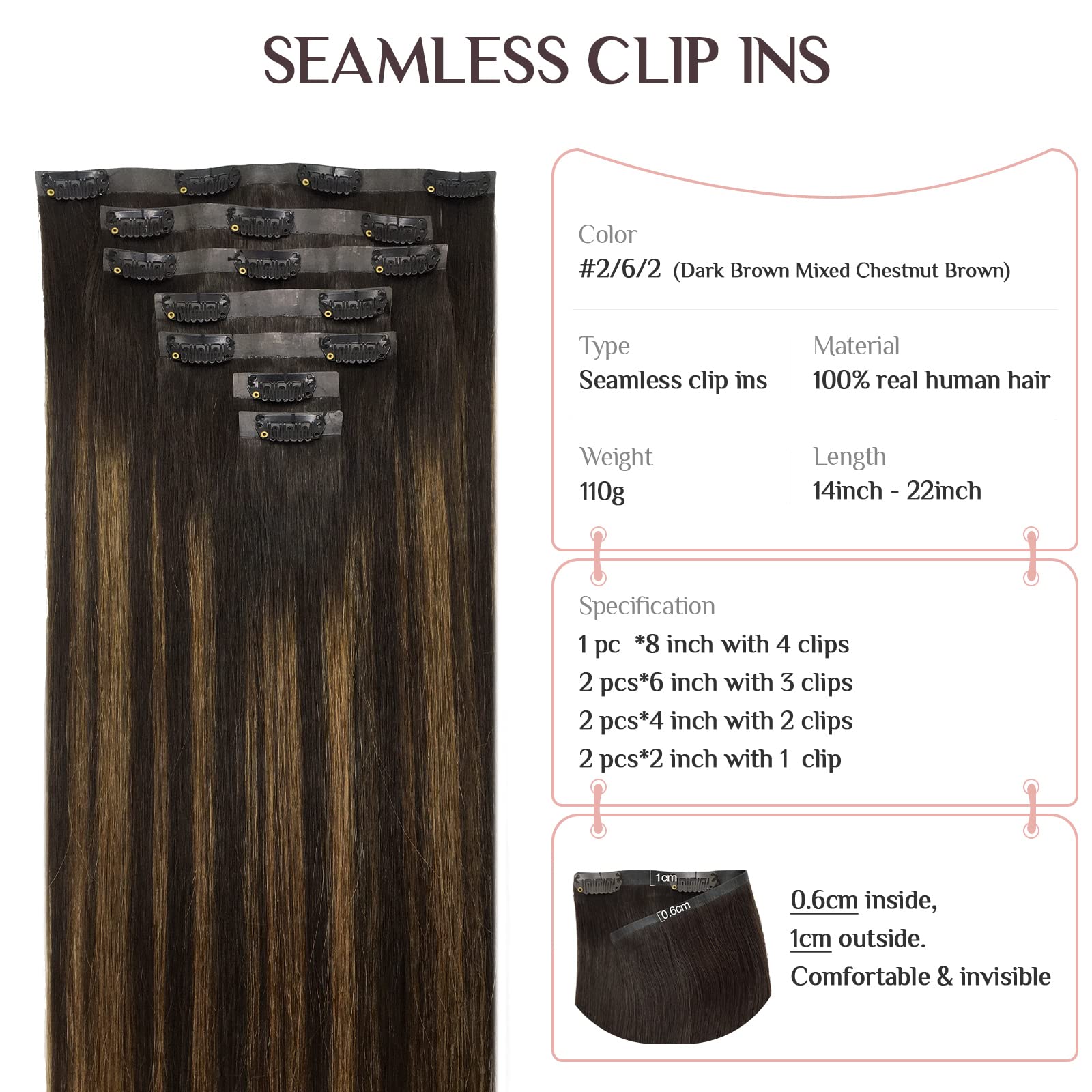 【7pcs Seamless Clip Ins & Fashionable Balayage and Ombre Colors--You Can Have More Choices】Quantity: 7pcs. Weight: 110g. Length: 14-22inch. Weft width: 8inch*1, 6inch*2, 4inch*2, 2inch*2. U-shaped stainless steel clip is covered with a silicone pads, wear more firmly. Hair including balayage, ombre and pure colors. Suitable for various occasions, such as daily life, parties, dating, weddings, cosplay and other important events.