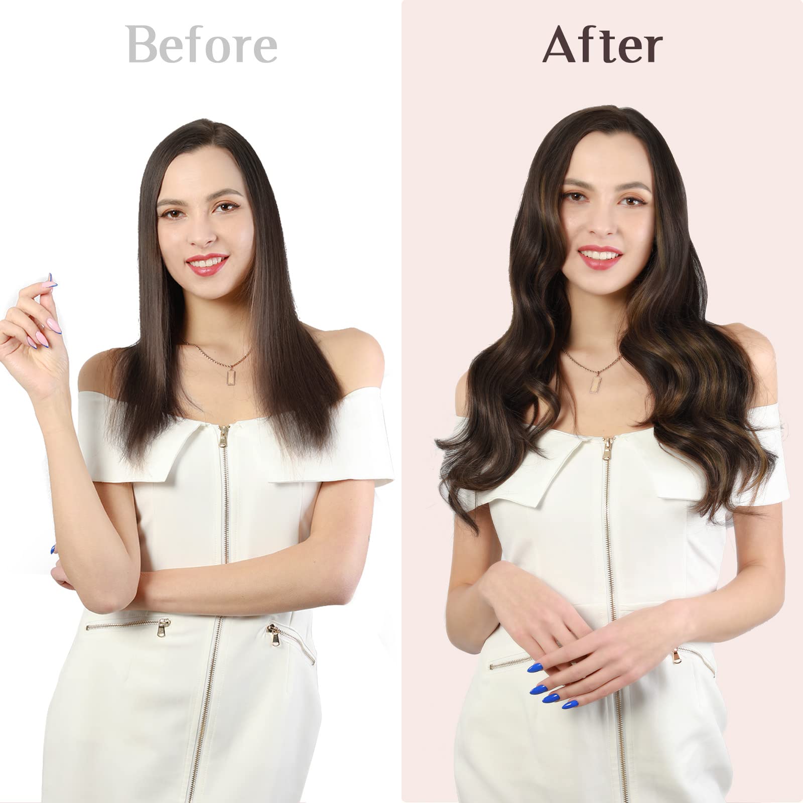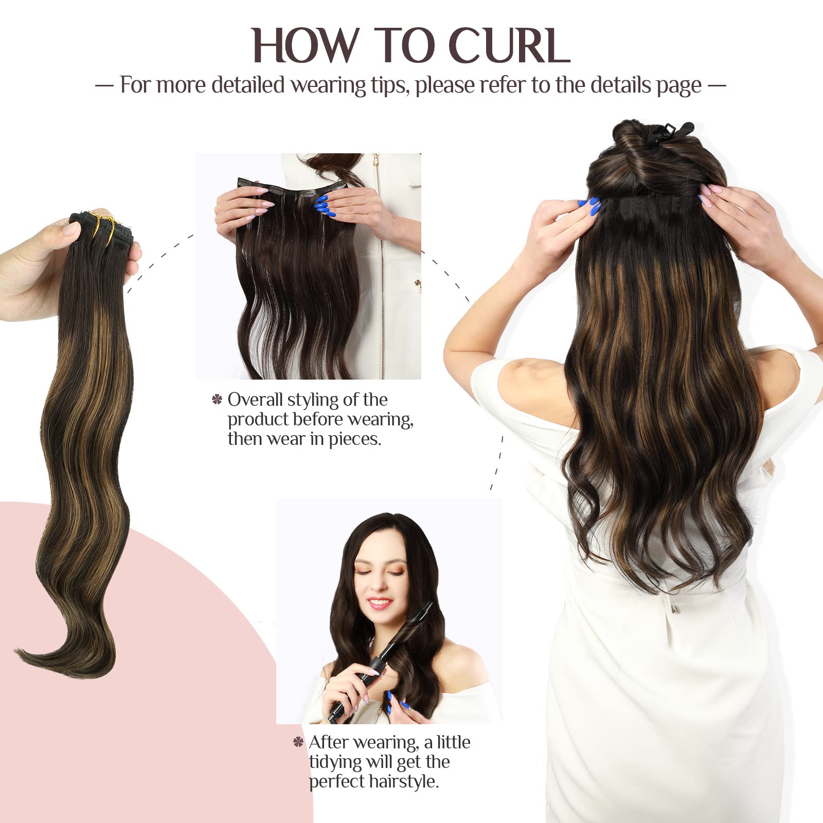 【10-15 Min Fast to Wear, Make Your Own Salon Effect Hairstyle】Clip in hair extensions is flexible and fast to remove and wear. It only takes 10-15 min to wear and 3-5 min to take off. Wearing skills: Overall styling of the product before wearing, and then wear it in pieces. Wear it and blend with your hair. You can make nice hairstyles like hair stylist. We recommend for thick hair: 2-3 packs for length and 1-2 packs for thickness. Thinning hair: 2-3 packs for thickness and 1-2 packs for length.