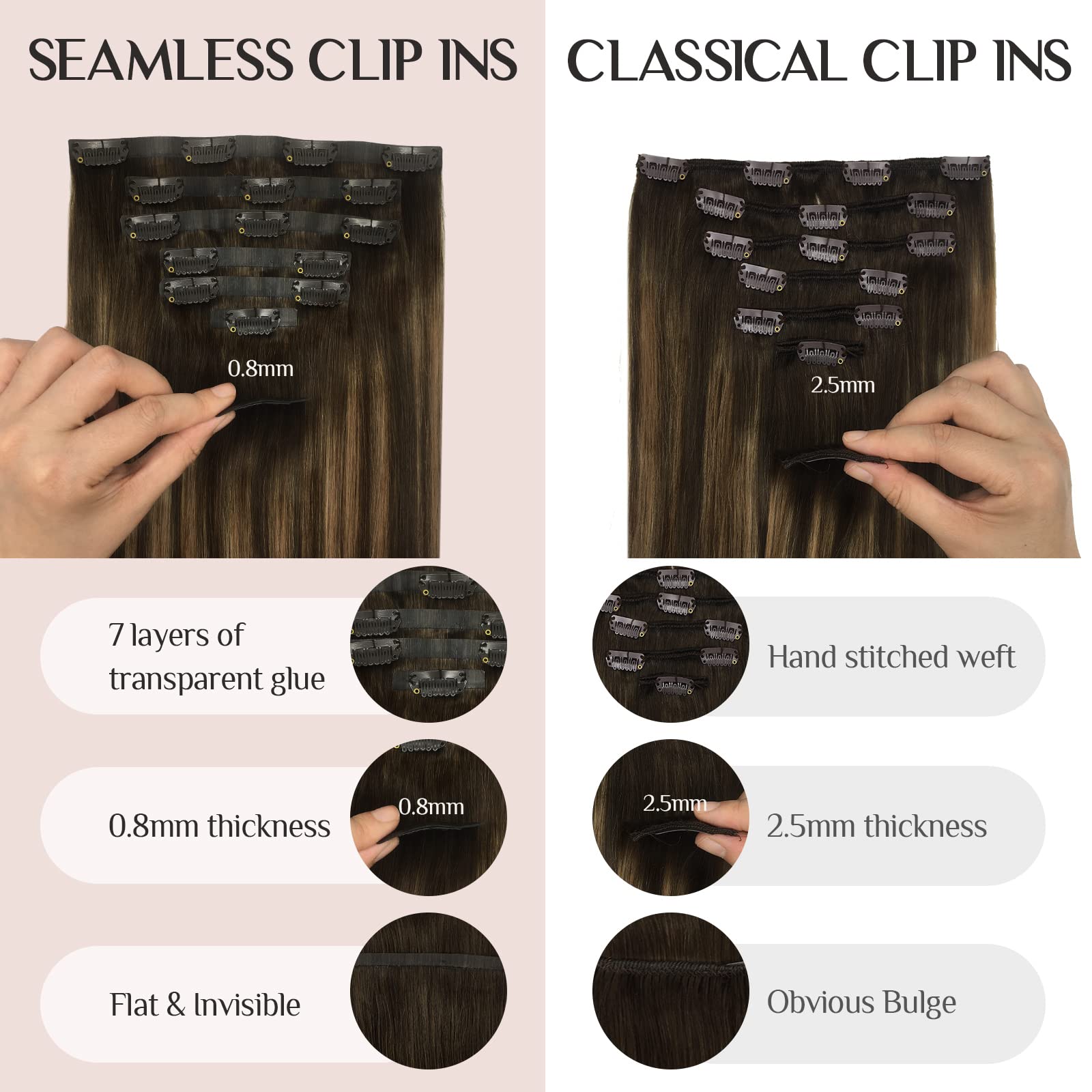 【New 7-Layer Glue Seamless Silicone Weft--Extremely Soft, Lightweight, Not Shed】 Seamless clip in hair extensions: with thin, seamless silicone wefts for ultimate comfort, invisible, skin-friendly and not stiff. Use high viscosity PU glue to stick 7 layers of hair tightly to the PU strip, very light and not fall out. Compared to classic sewing, the hair is more evenly distributed on the weft and more flat and invisible. Transparent PU strips are more invisible.