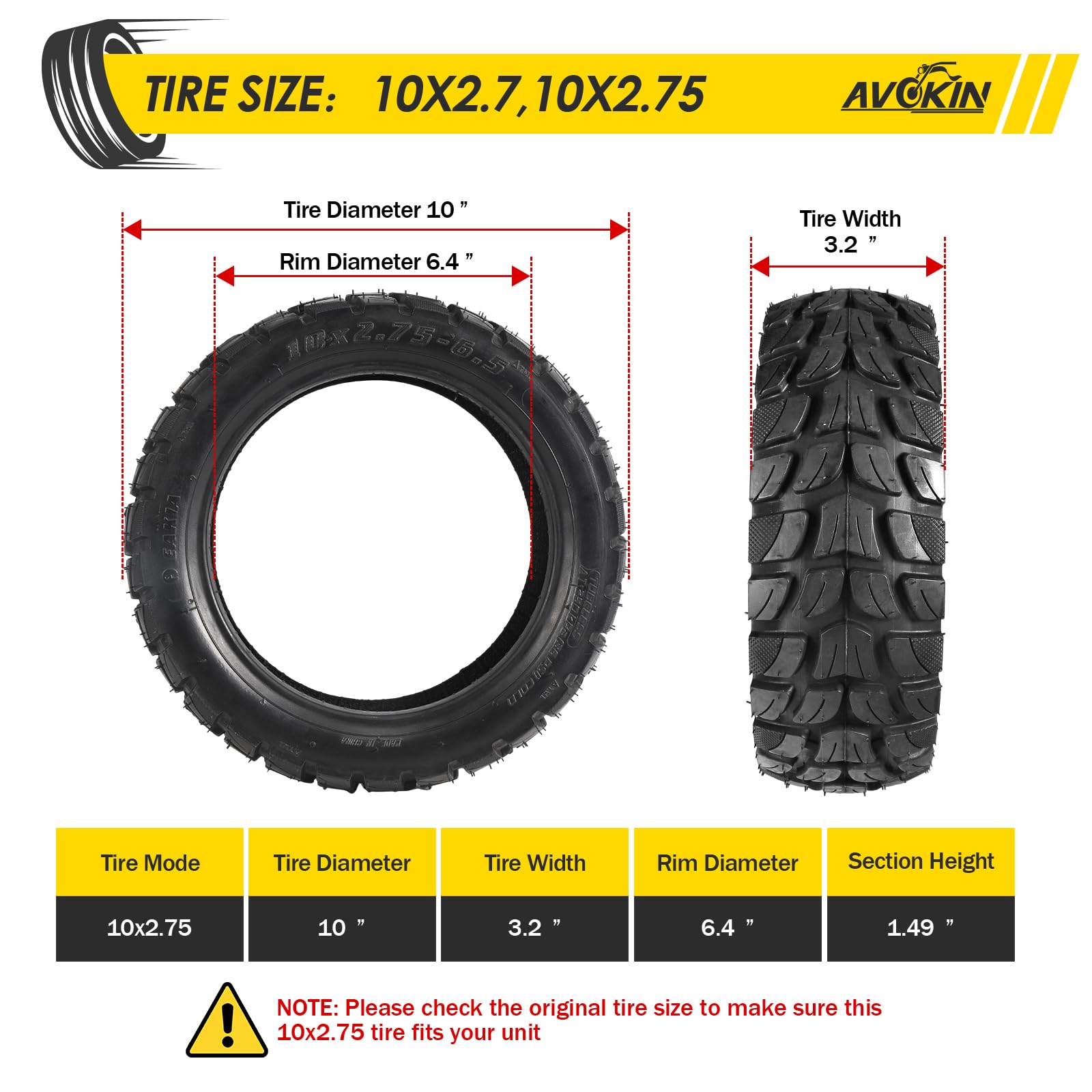 Dimensions: 10" 10x2.75/2.70-6.5 Tire Tire Diameter 10in ; Width 3.2in; Section Height 1.49in. The maximum load of a single electric scooter tire is 156lb