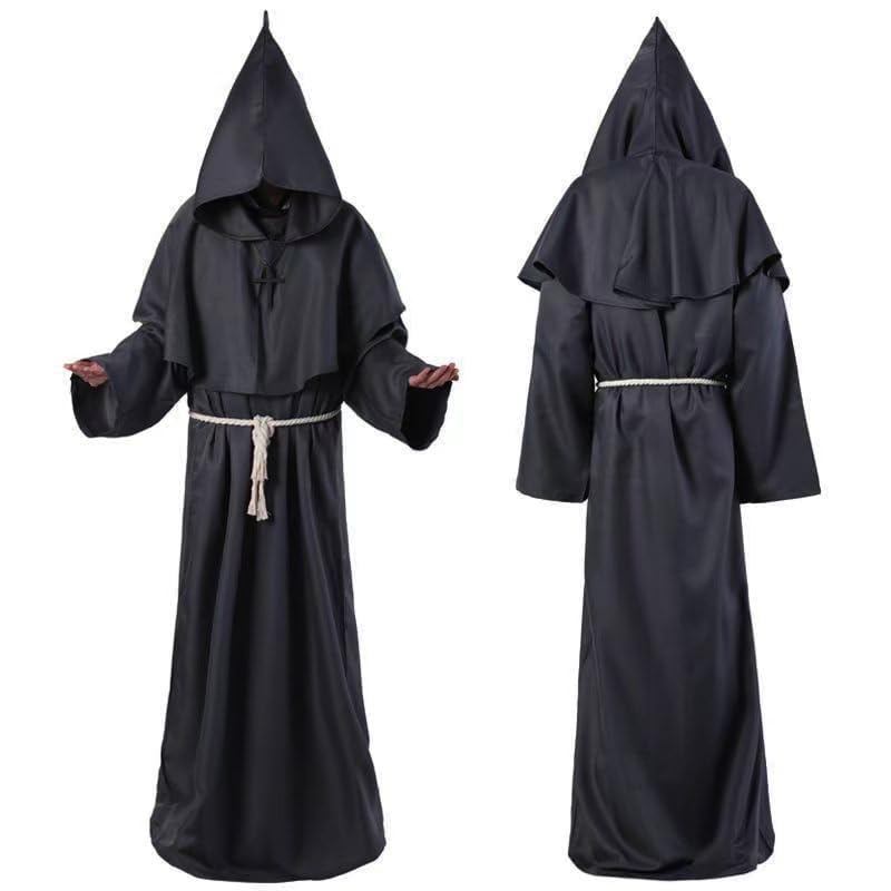 Description Halloween costumes adults men women Package included: 1pc Hat 1pc Leather Mask 1pc Robe 1paris Gloves 1pc Scepter 1pc Wooden Cross Necklace