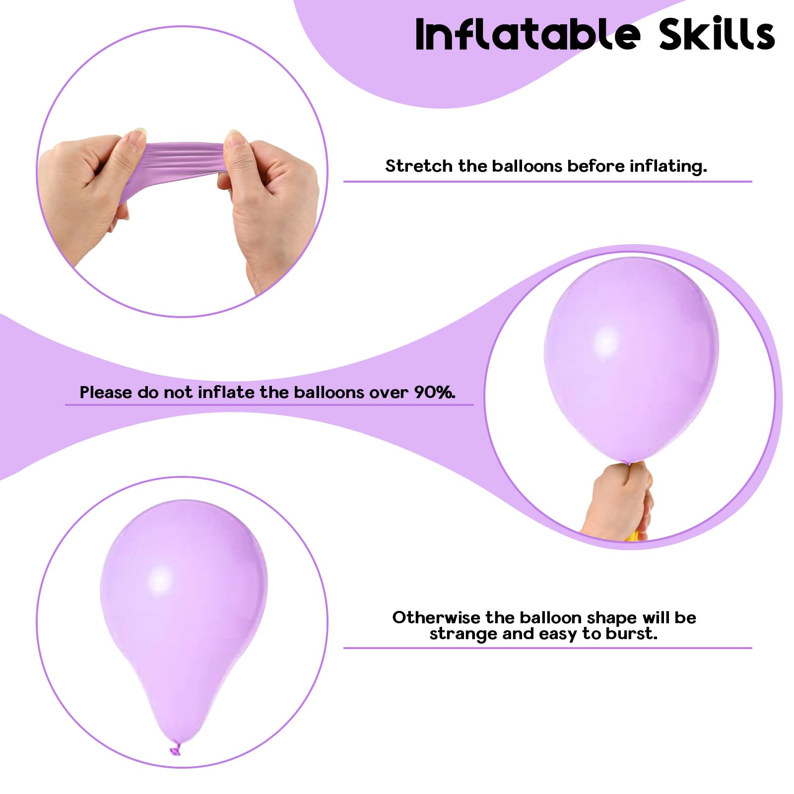 WARM TIPS: Always supervise children when playing with balloons, balloons can pose a choking hazard if they are not handled properly; keep balloons away from heat sources, such as direct sunlight, radiators, and open flames; inflate balloons slowly and do not overinflate them; the tail must be pulled tight after the balloon is knotted; balloons may have color differences under different lighting conditions