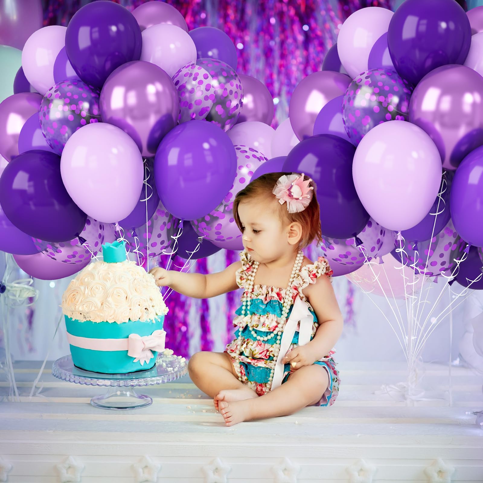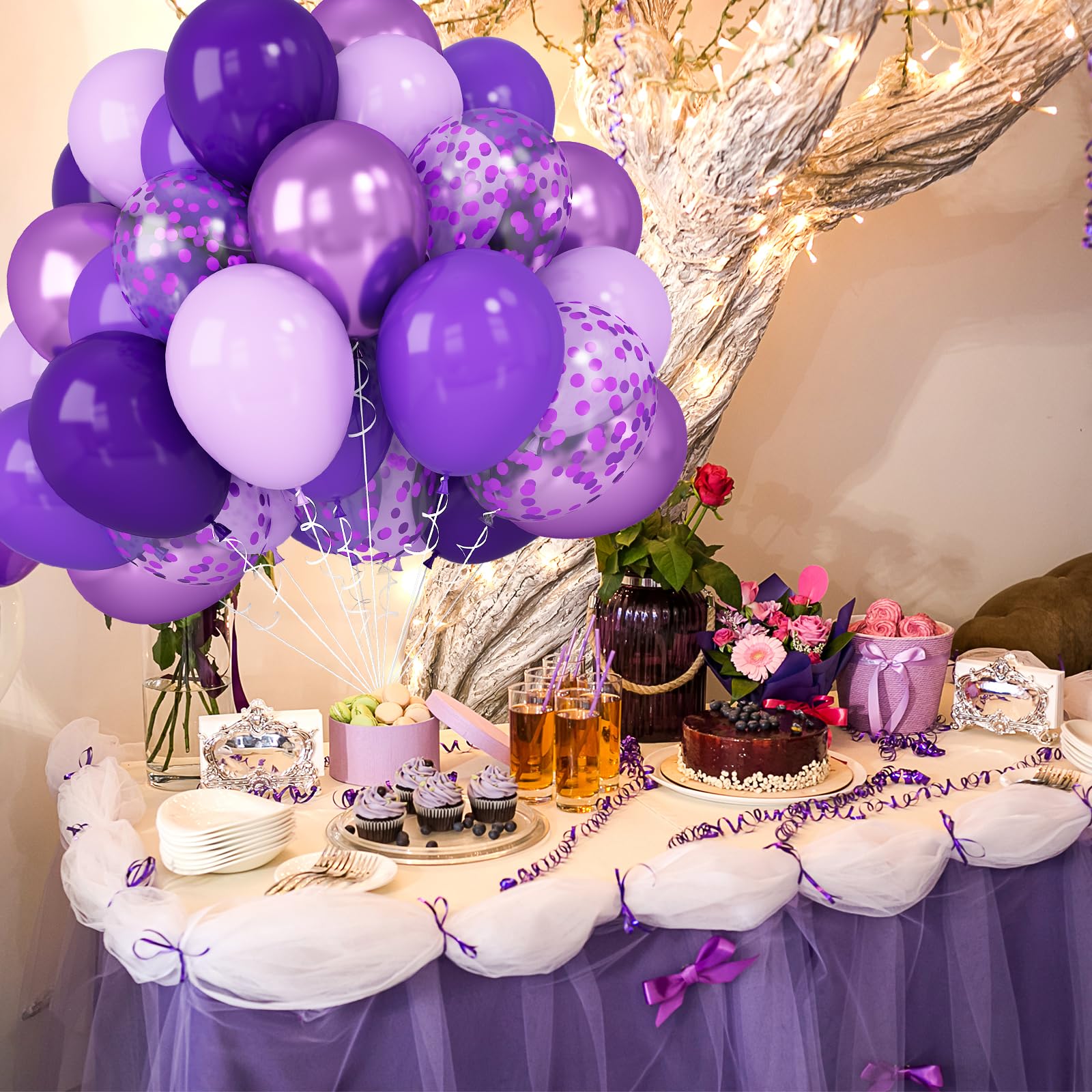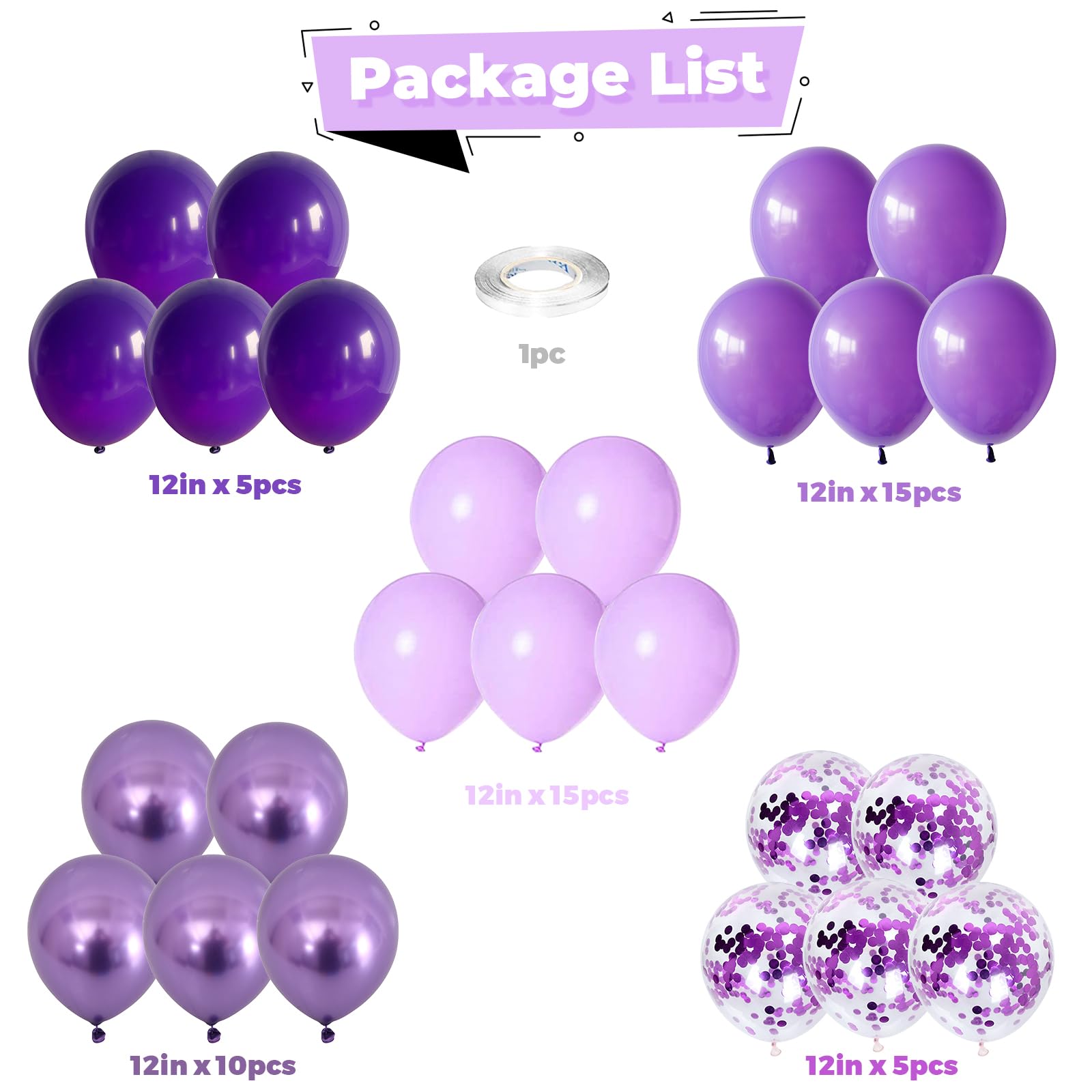 WHAT YOU GET: Purple balloons set includes 50pcs latex balloons: 5pcs 12inch dark purple balloons, 15pcs 12inch matte purple balloons, 10pcs 12inch pastel purple balloons, 10pcs 12inch chrome purple balloons, 5pcs 12inch purple confetti balloons, 1 roll of ribbon, ideal for making balloon garland, balloon arch