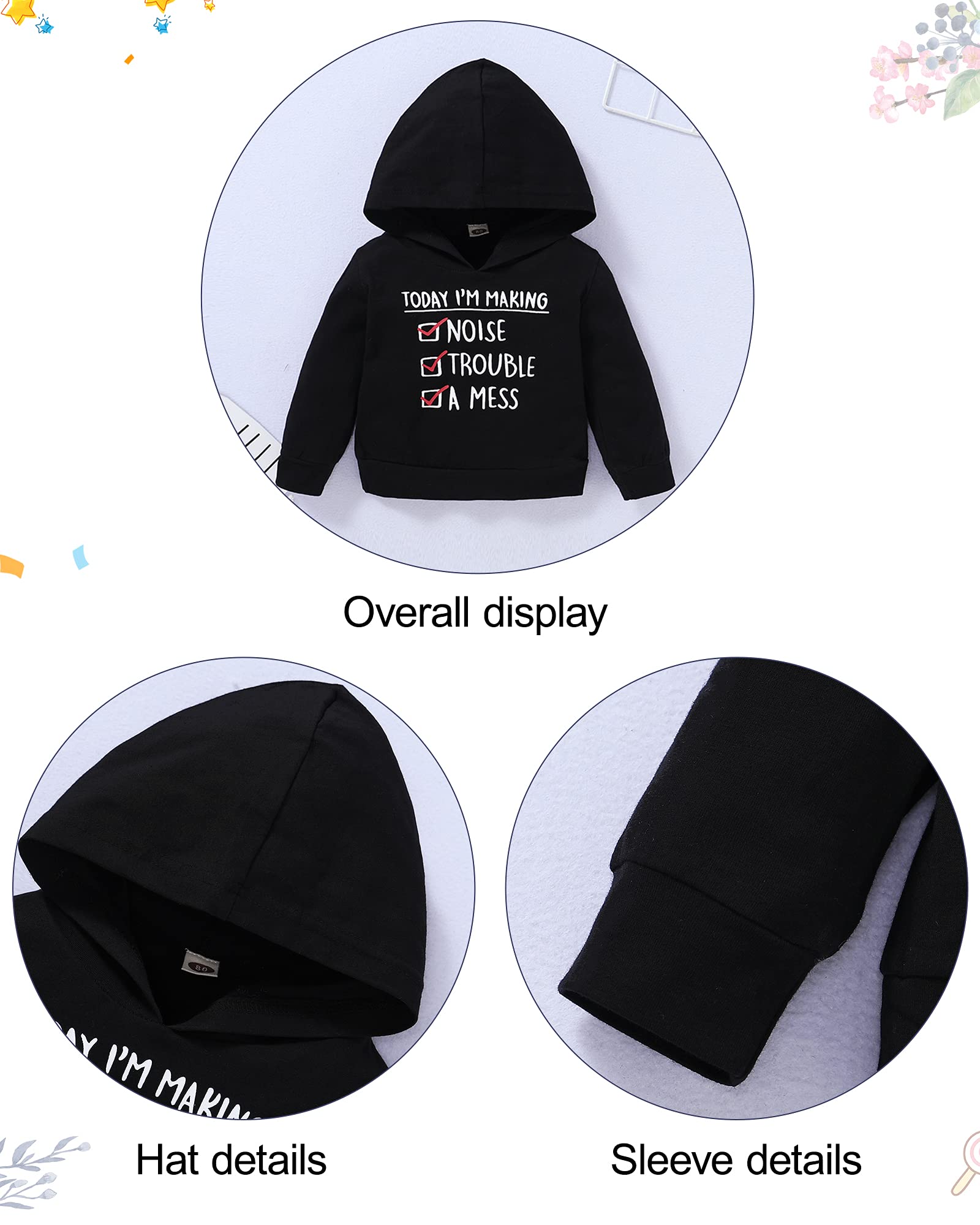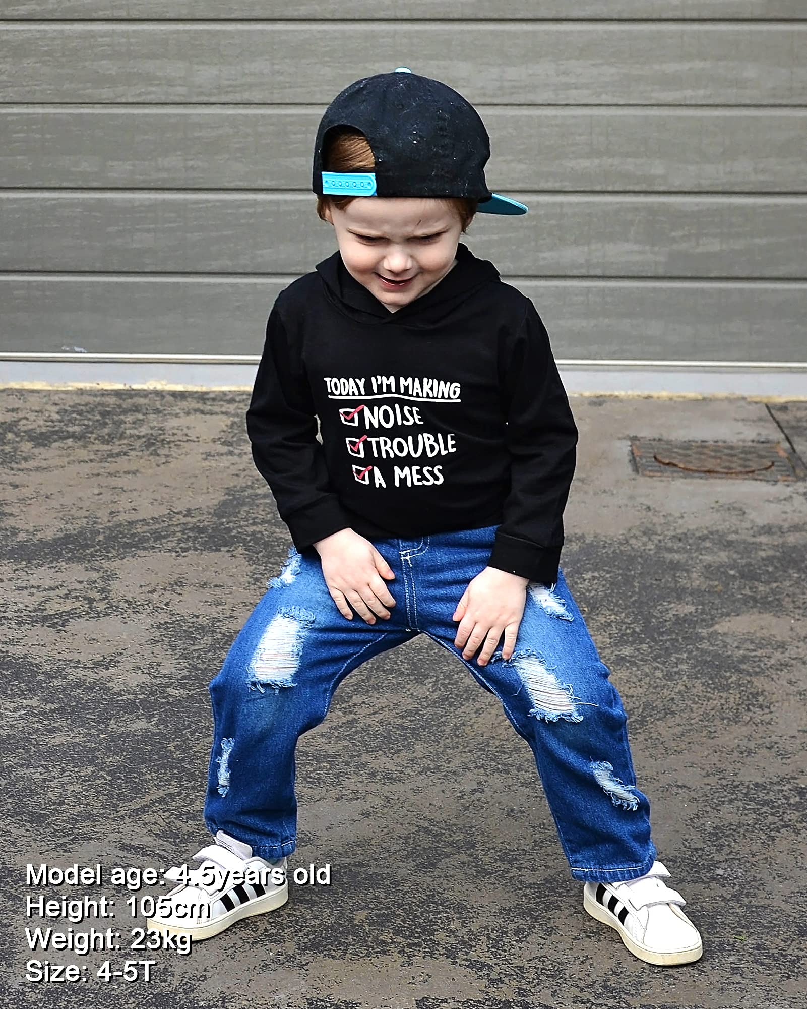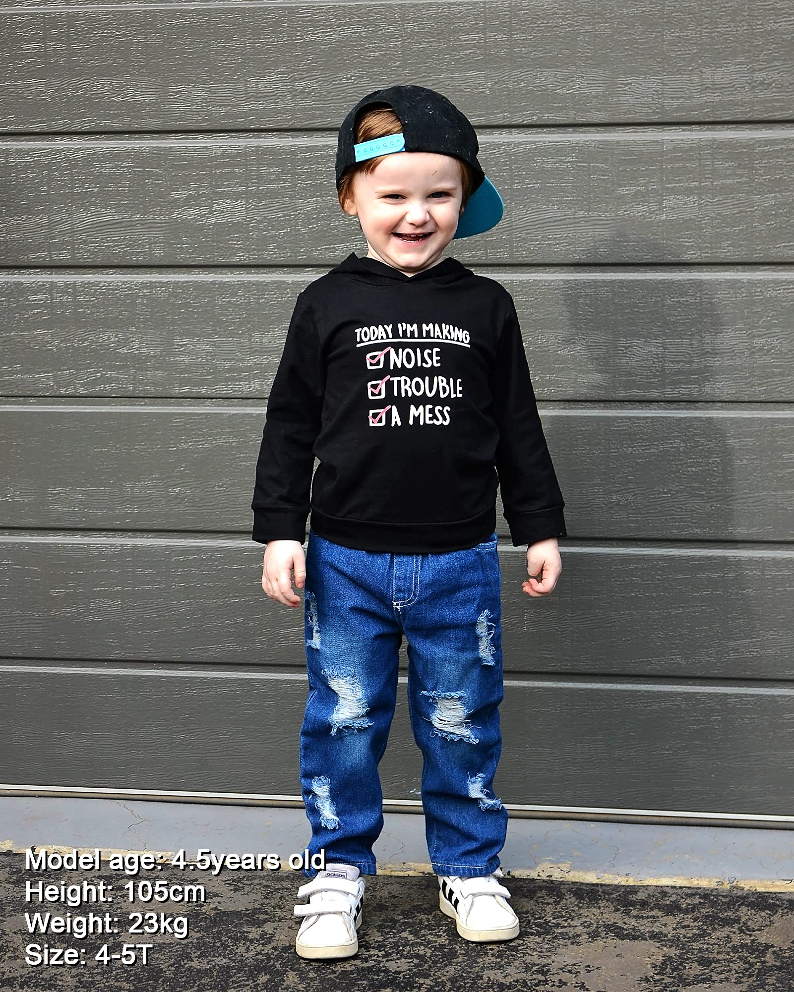 Package include: 1* toddler boy long sleeve hoodies, 1* ripped jeans pant. Perfect 2pcs outfits set for toddler boy 1-6T.