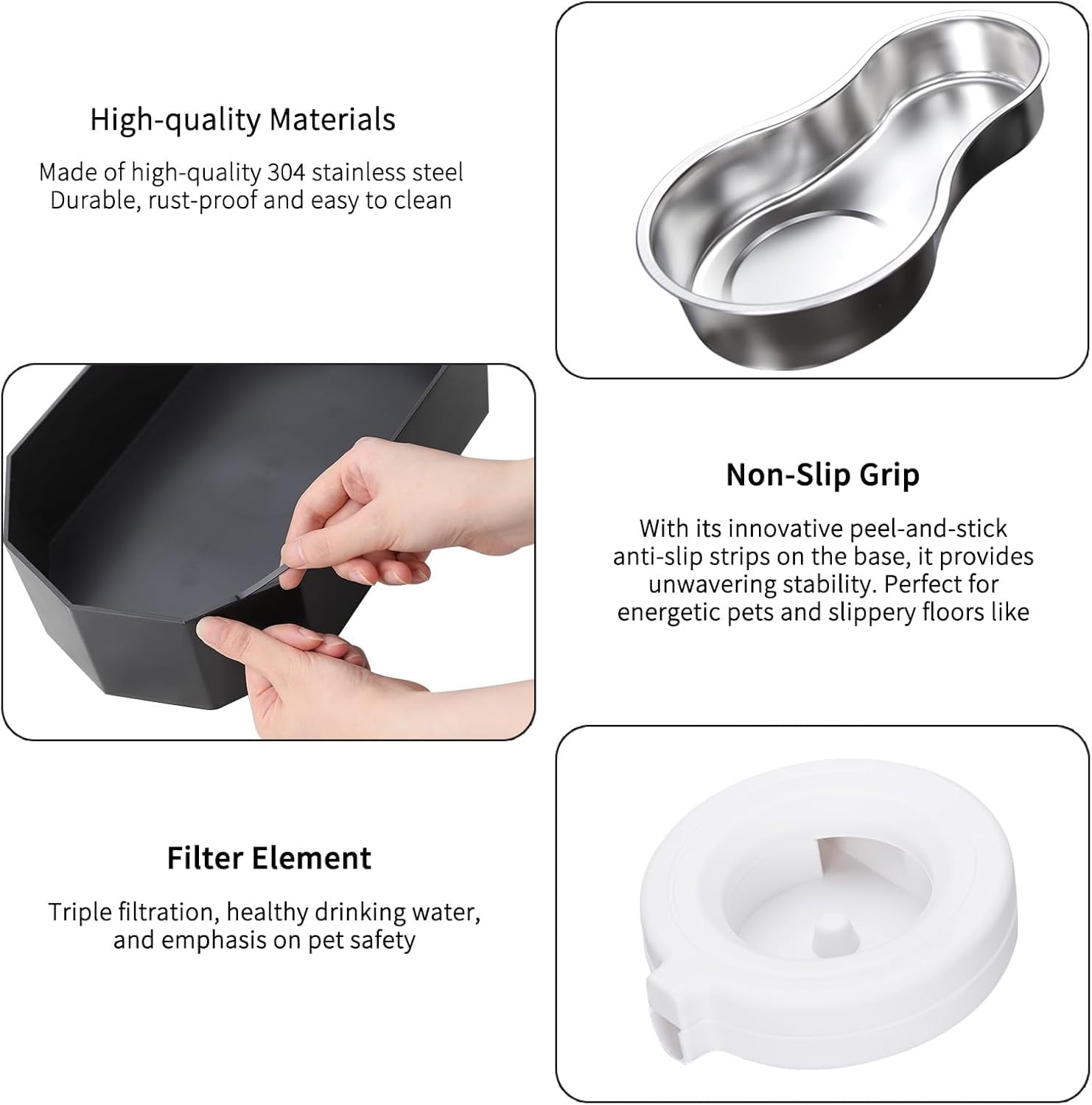 Premium Stainless Steel Bowl: The drinking surface is crafted from high-quality, food-grade 304 stainless steel. It is odorless, rust-resistant, and inhibits dirt, ensuring your pets enjoy cleaner, safer water and promoting their long-term health.