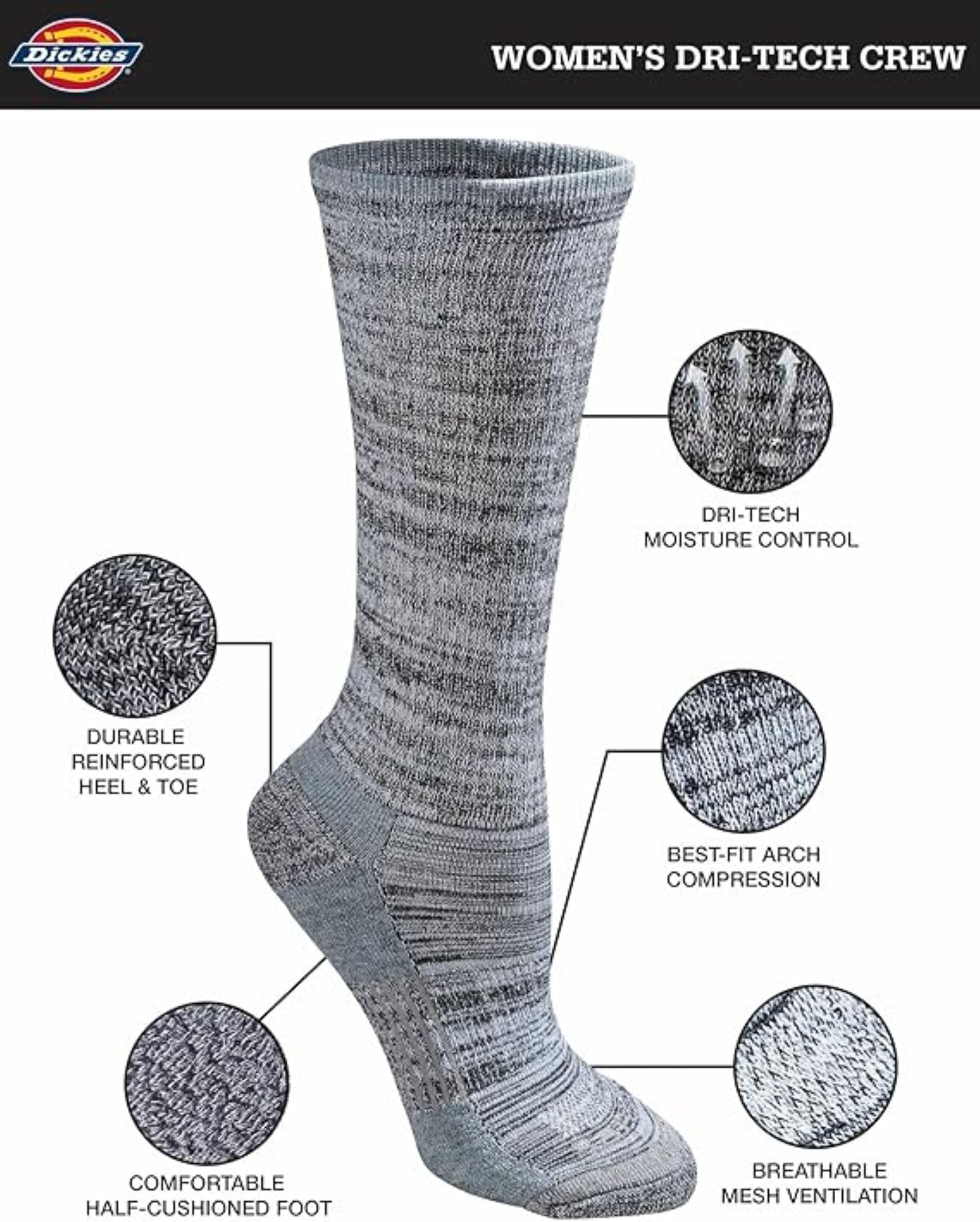 Description Dickies dri-tech moisture control for women's crew socks combines moisture wicking fibers and mesh ventilation channels to keep feet dry and comfortable. Since 1922 Dickies has been making hard-duty work products built to stand up to whatever life throws at you. Dickies Work Socks are built with purpose to deliver superior comfort and performance on and off the job. Dri-tech Moisture Control Sock Collection features: Moisture Management to help keep your feet cool, dry, and comfortable throughout the day.