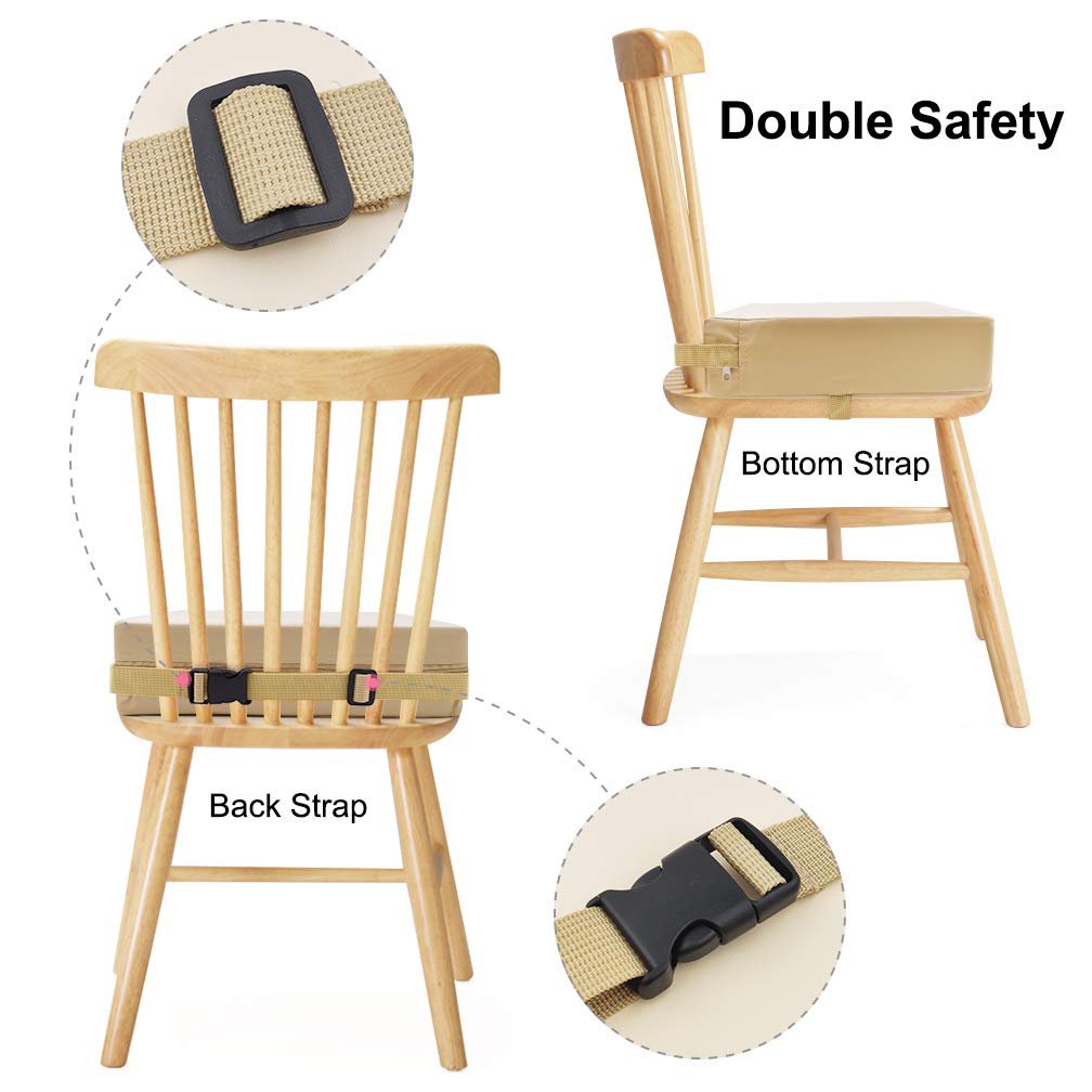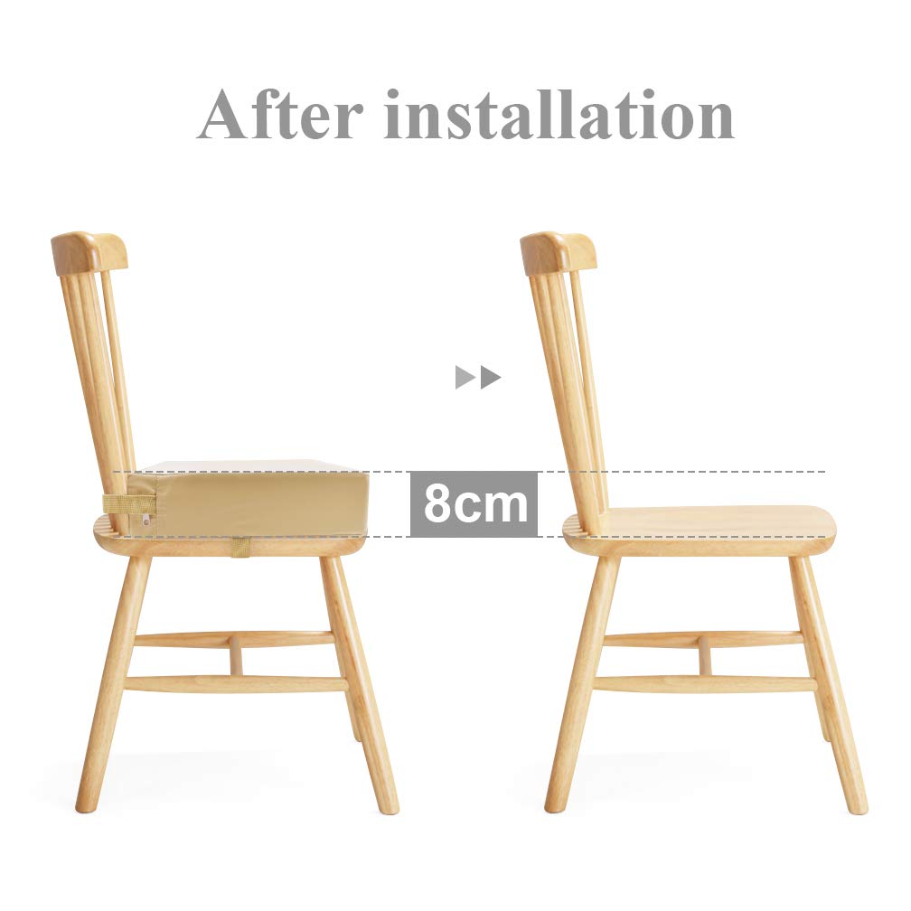 Dimensions: 12.6"L x 3.1"H x 12.6"W, fit most of dining chairs. It can be used for toddler children old who can sit unaided at a table to enjoy the meal with family together. Also can used for children writing, drawing and play toys.