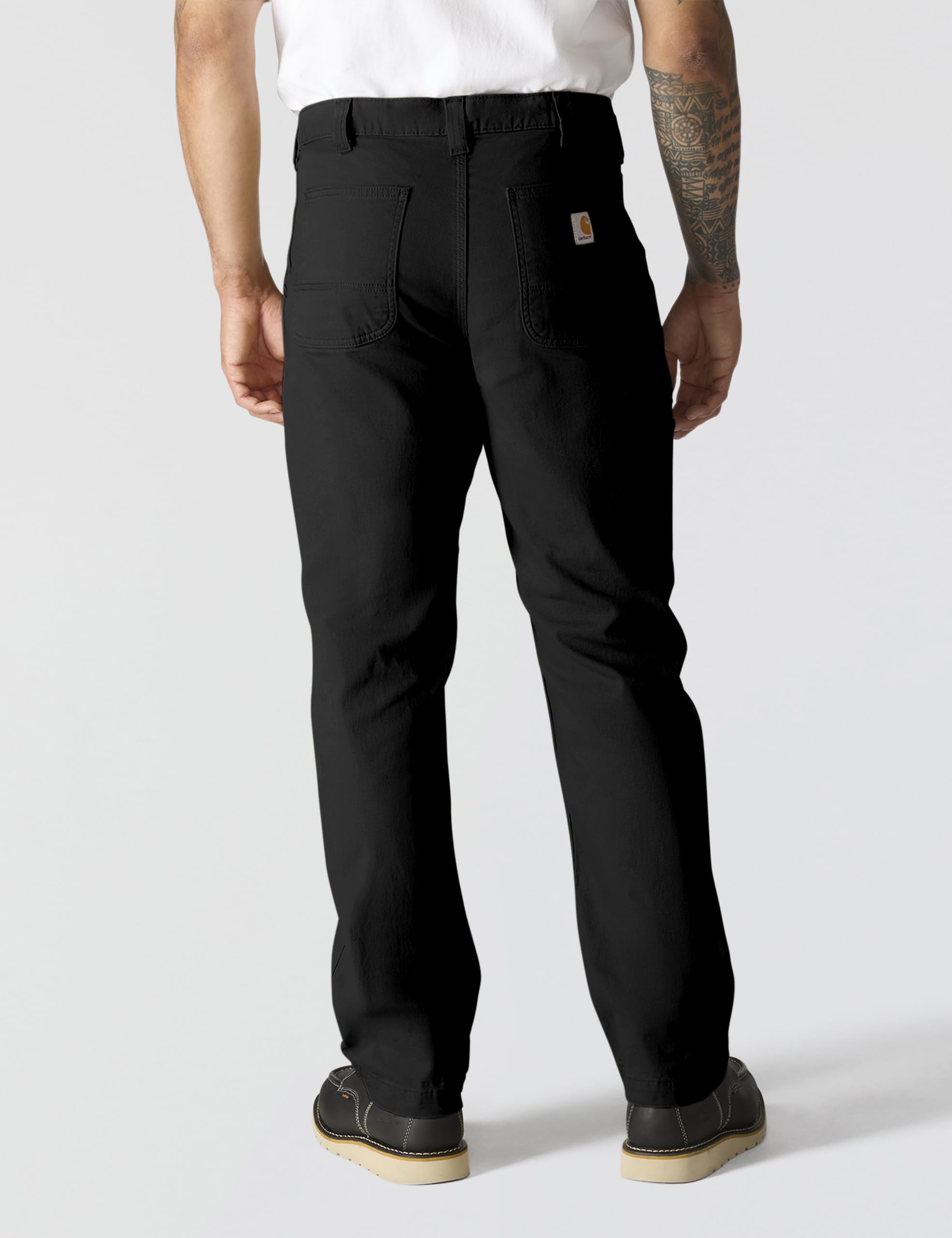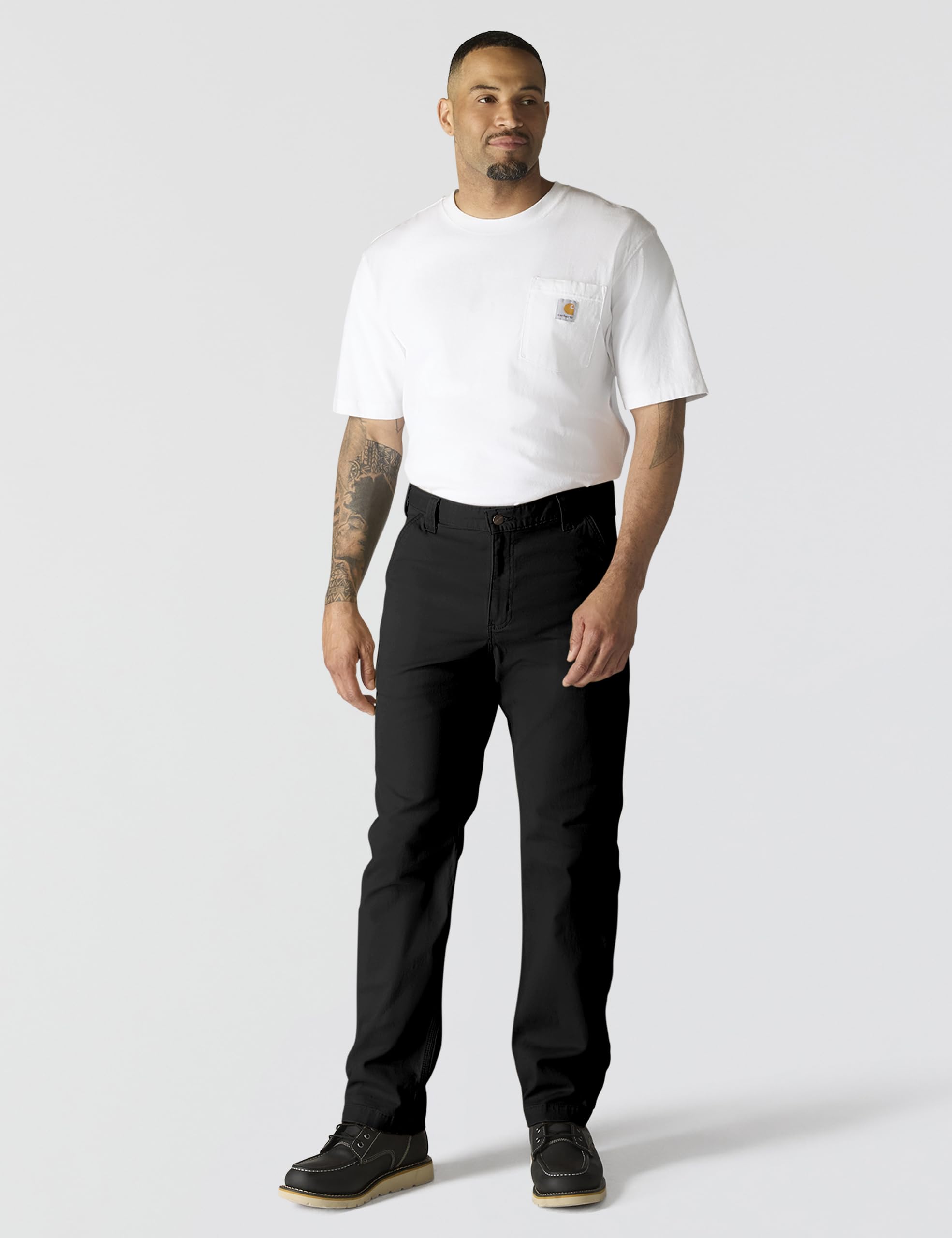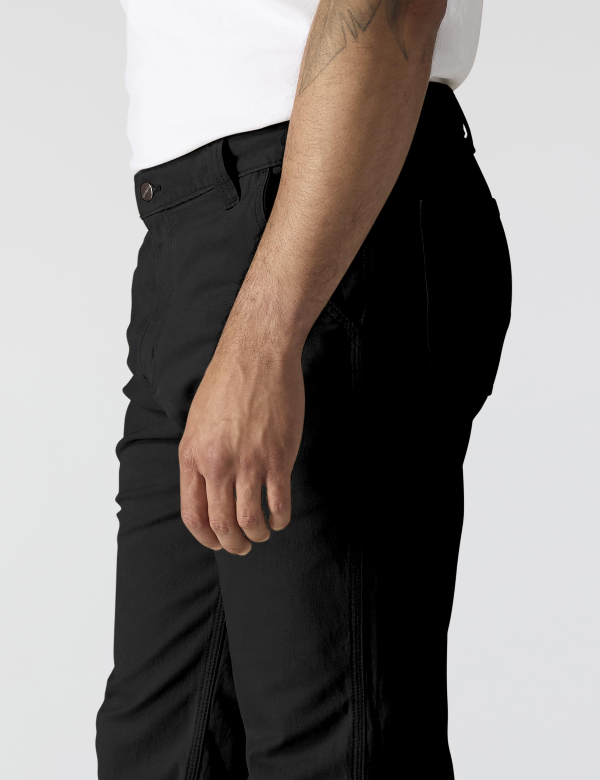 Description This dungaree features a hint of stretch for comfort and a cell phone pocket for functionality. It's made from 8-ounce, 98 percent cotton/2 percent spandex canvas and sits at the waist, has a relaxed seat and thigh, reinforced front slash pocket, belt loops sewn on the seam for strength, right-leg secured cell phone pocket and straight leg opening.